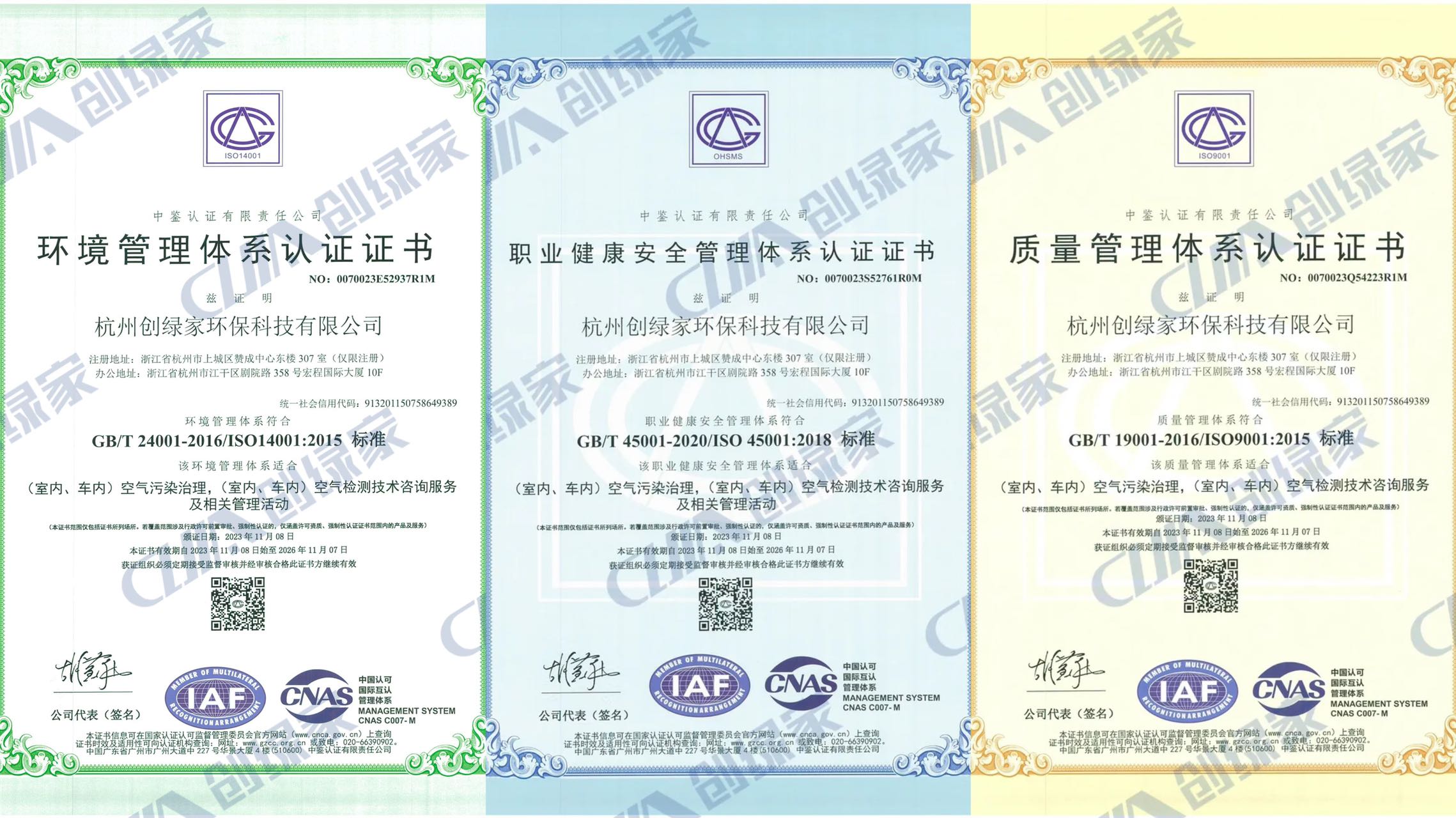 创绿家环境管理体系,质量管理体系,职业健康管理体系,三证齐全!这也是一家正规环保公司最基础的体系认证要求,各位业主注意辨别。
