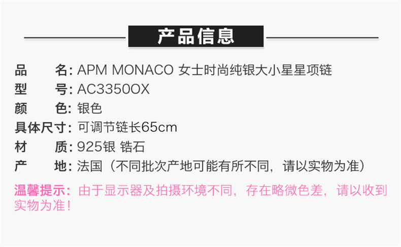 APM MONACO 女士时尚纯银三星星项链 AC3350OX 摩纳哥