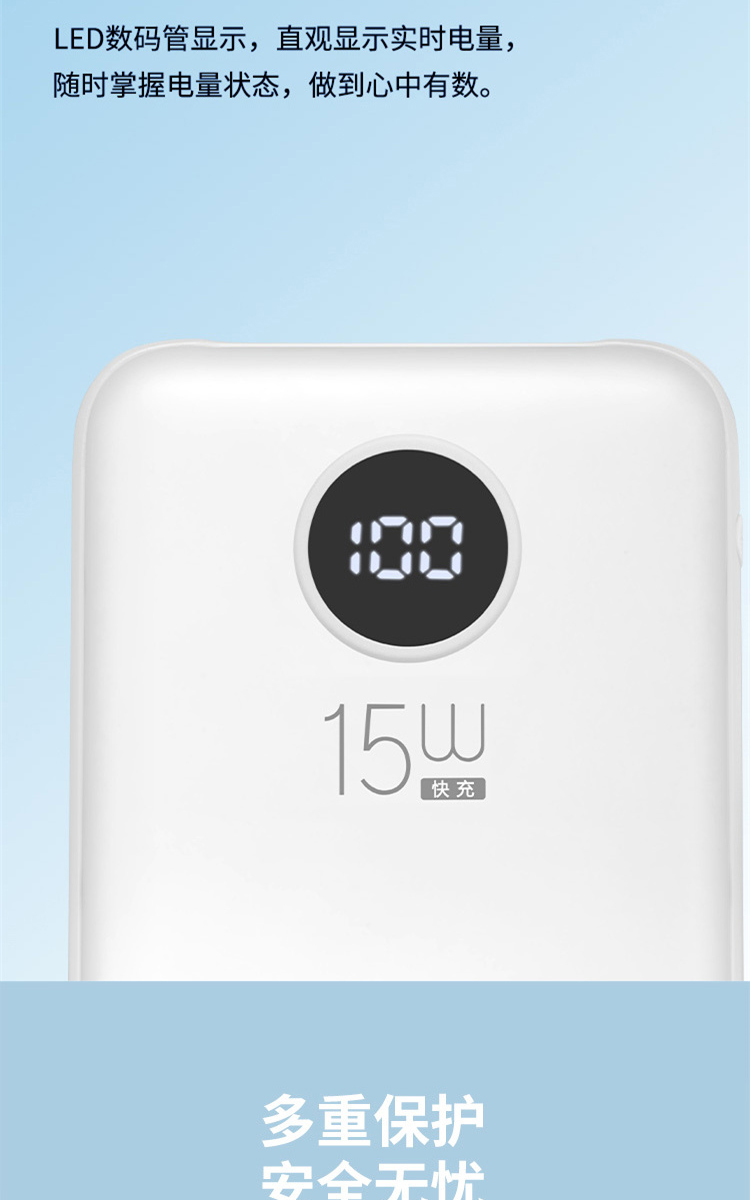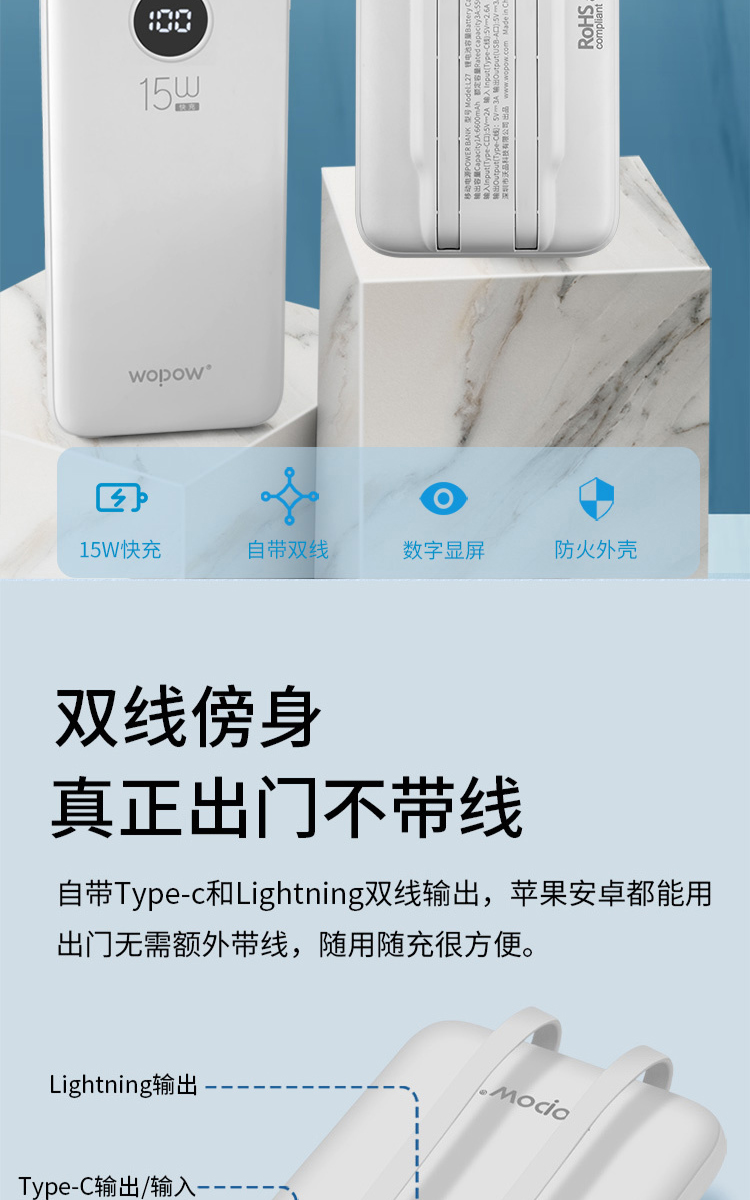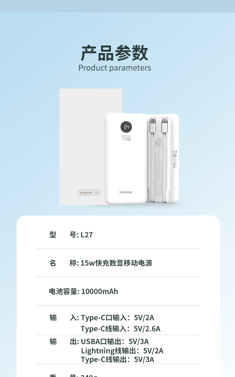 沃品(WOPOW)L27充电宝自带双线屏显15w快充移动电源10000毫安