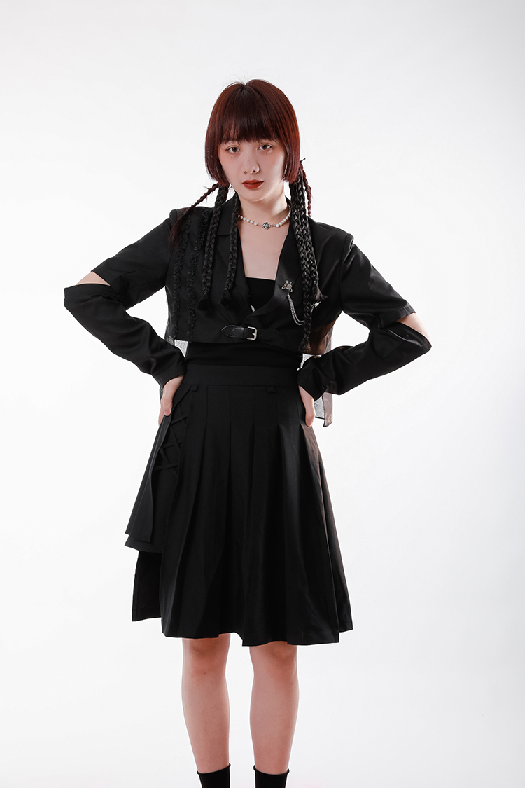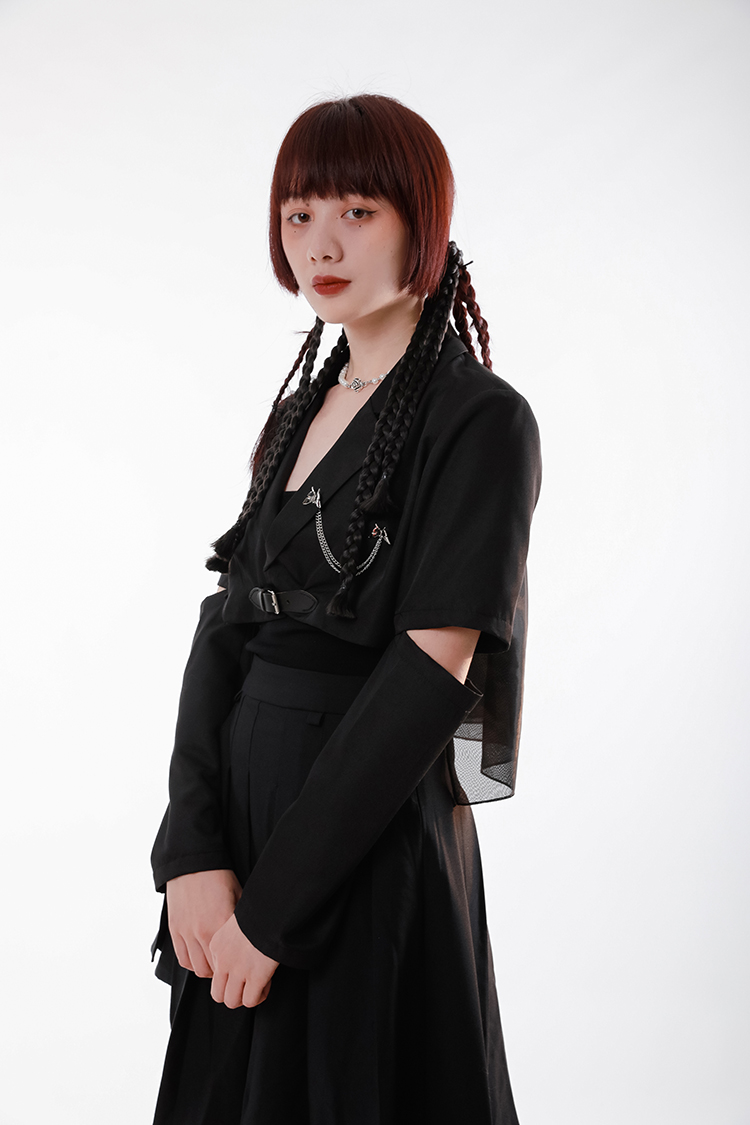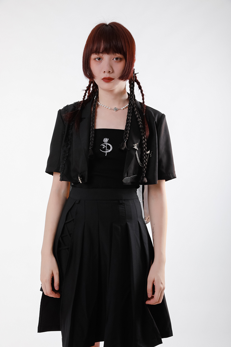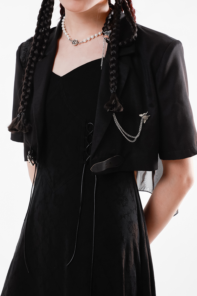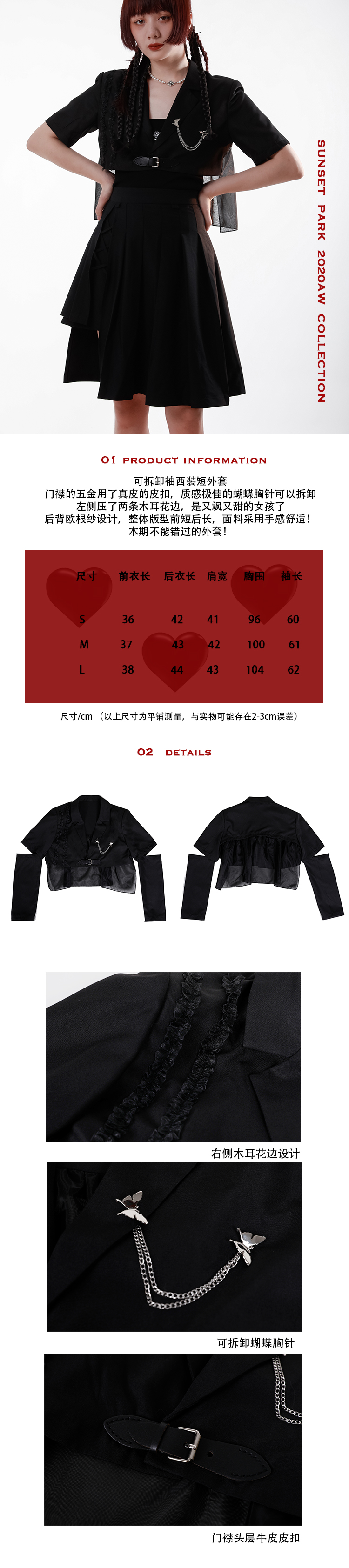 SunsetPark原创设计外套女夏季薄款黑色短袖可拆卸袖皮扣短西装女