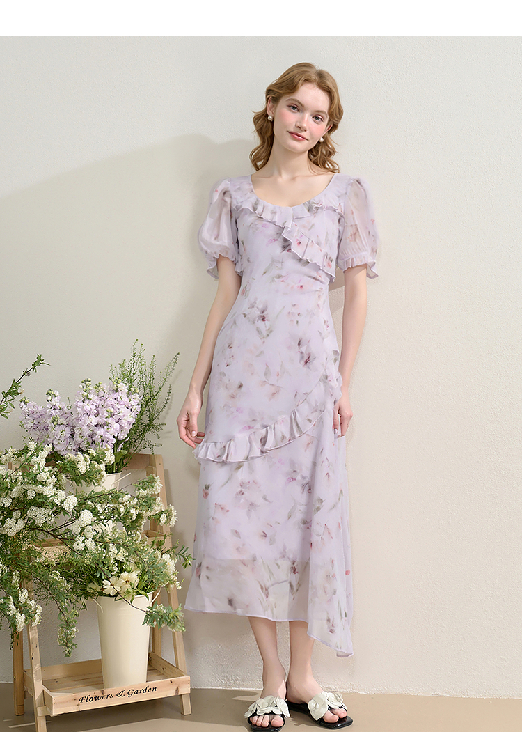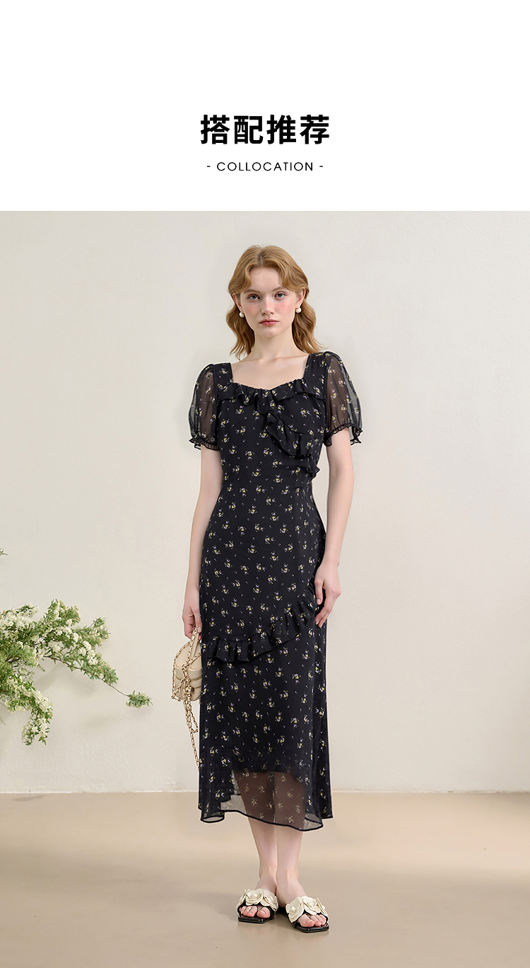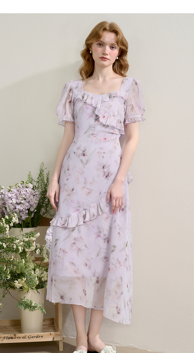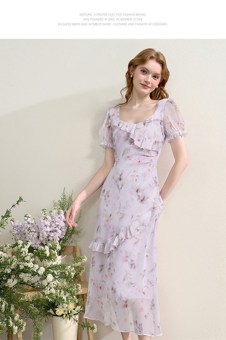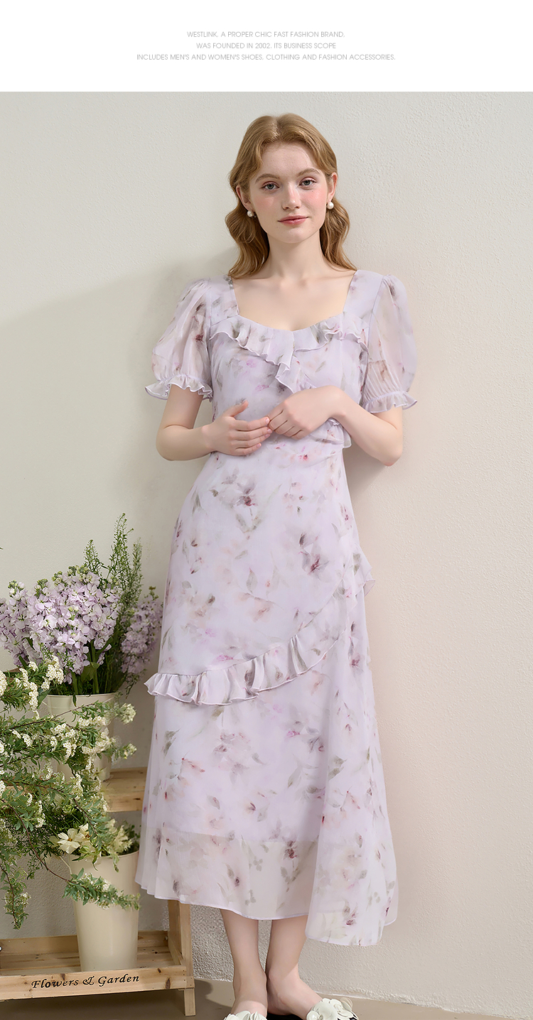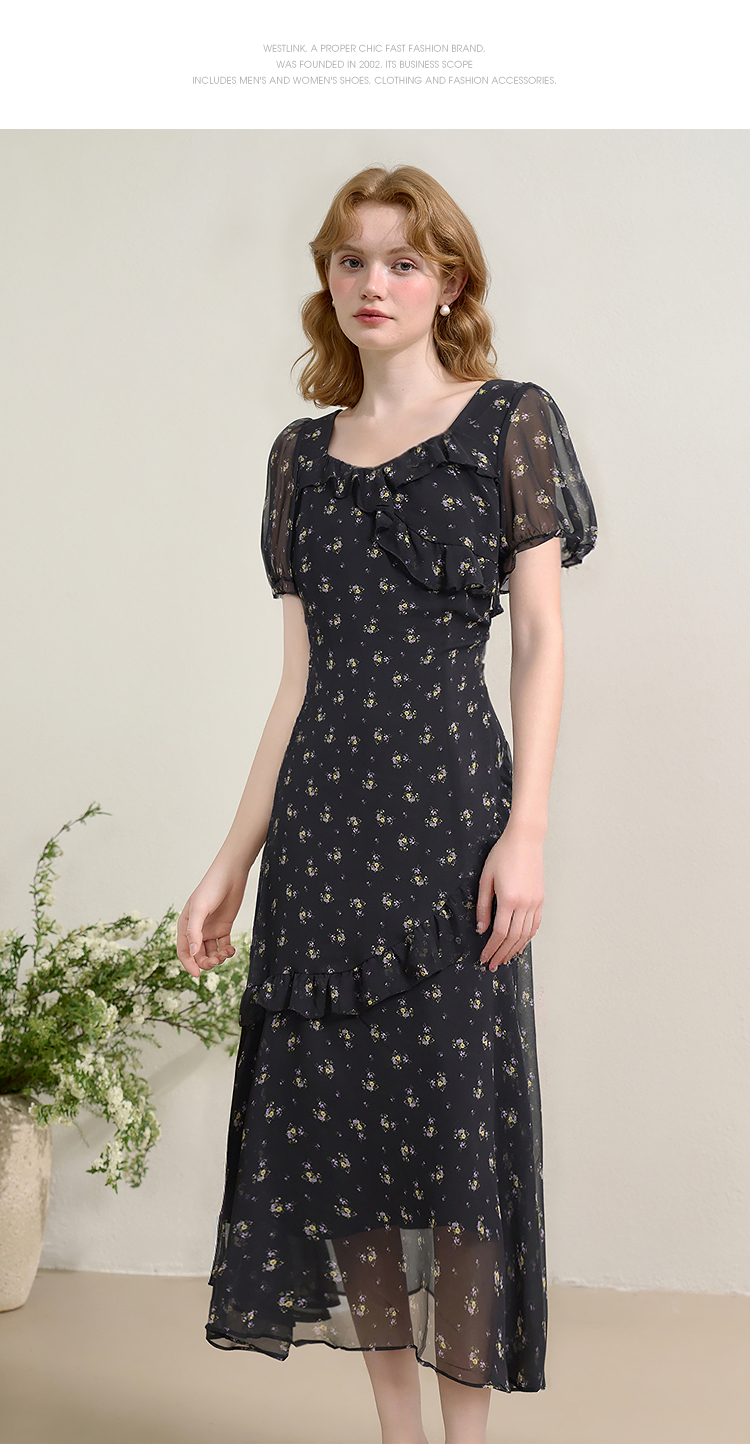 法式浪漫多层荷叶边泡泡袖碎花裙女夏季桃心领连衣裙LXD50830