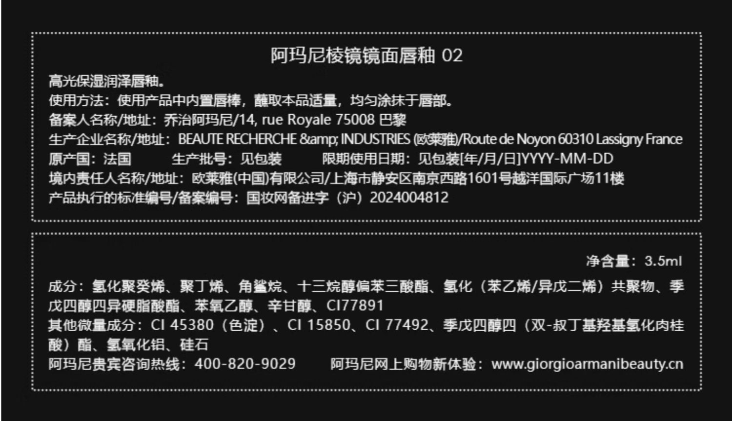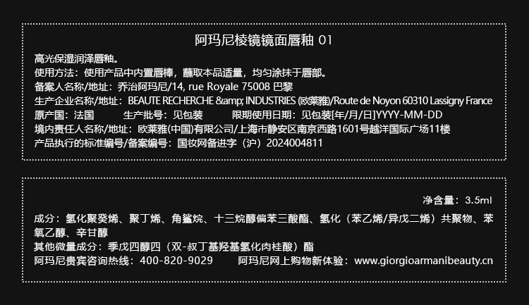 阿玛尼 银管唇釉唇镜 闪光保湿唇釉 叠涂口红 3.5mL