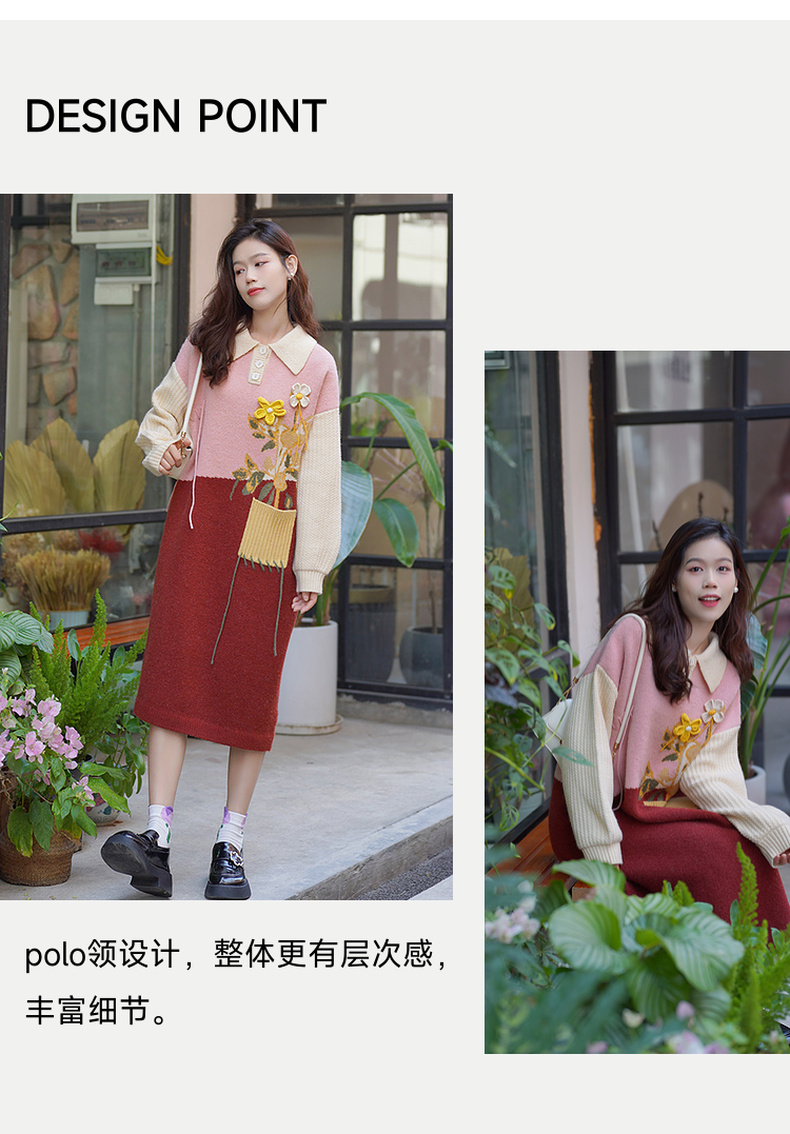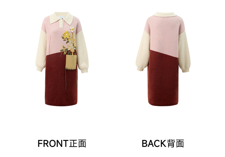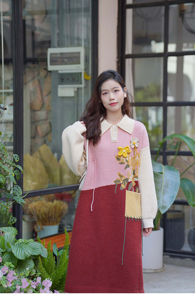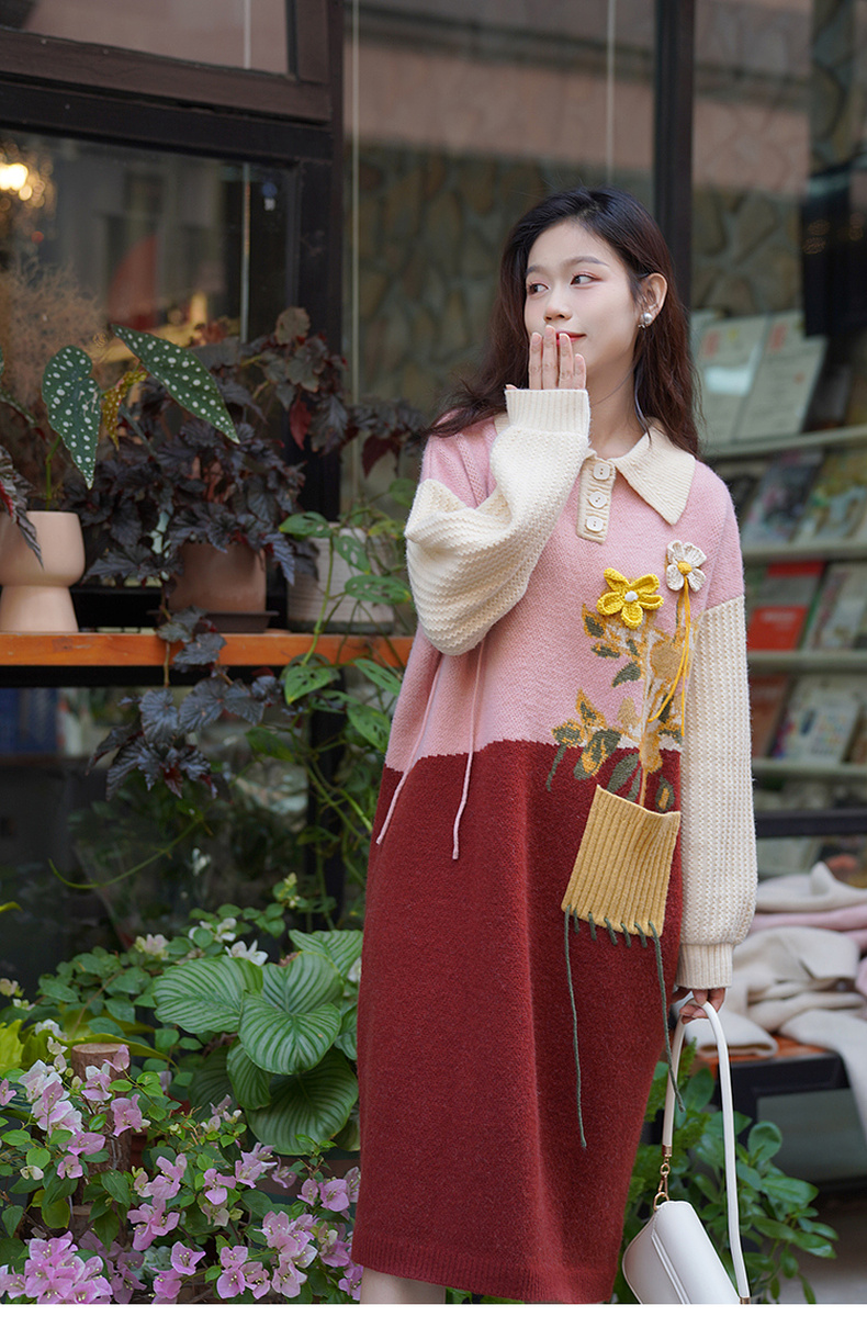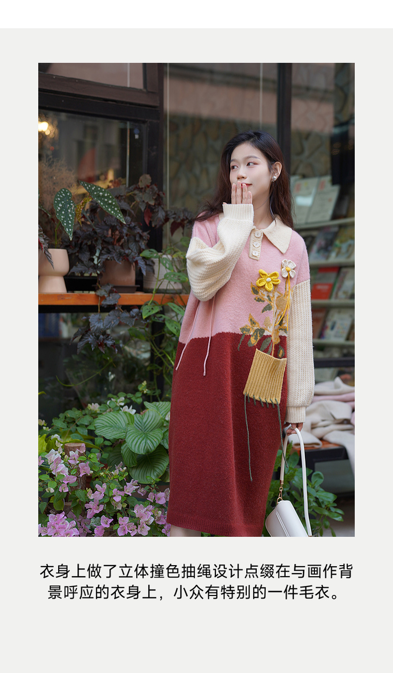 两三事粉黛花海2023冬季新款复古拼色立体花朵毛衣裙连衣裙
