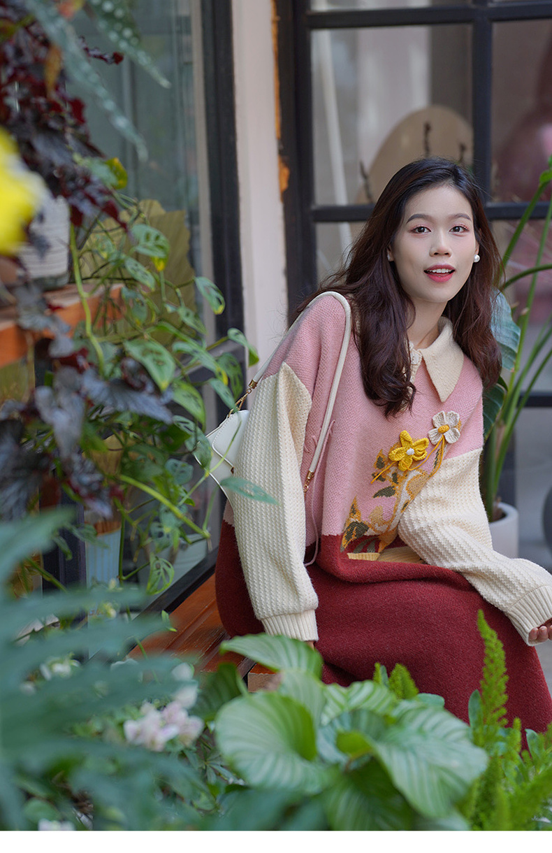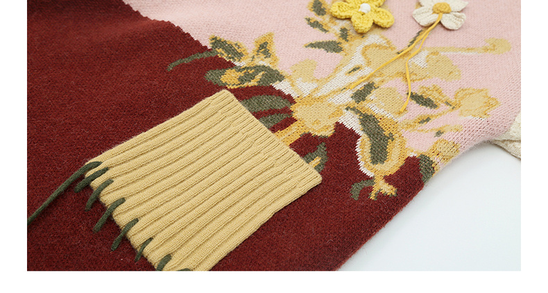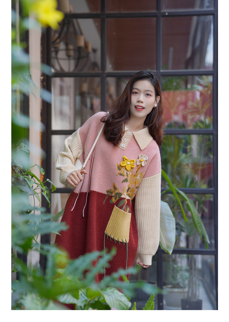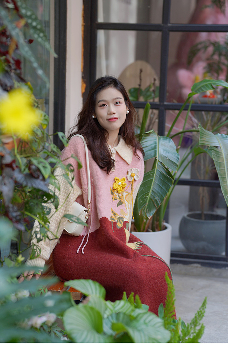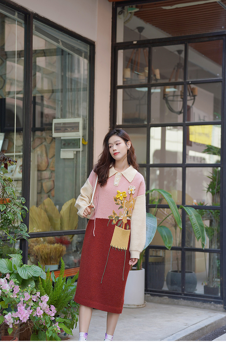 两三事粉黛花海2023冬季新款复古拼色立体花朵毛衣裙连衣裙