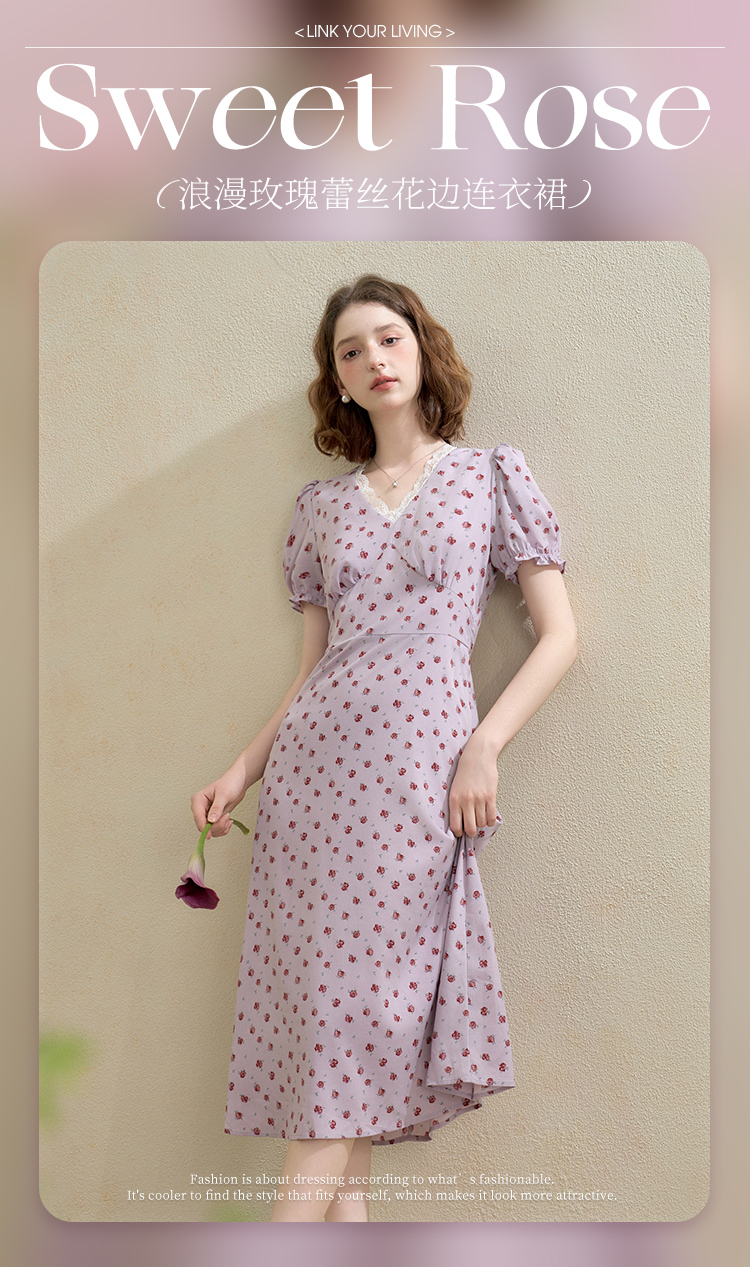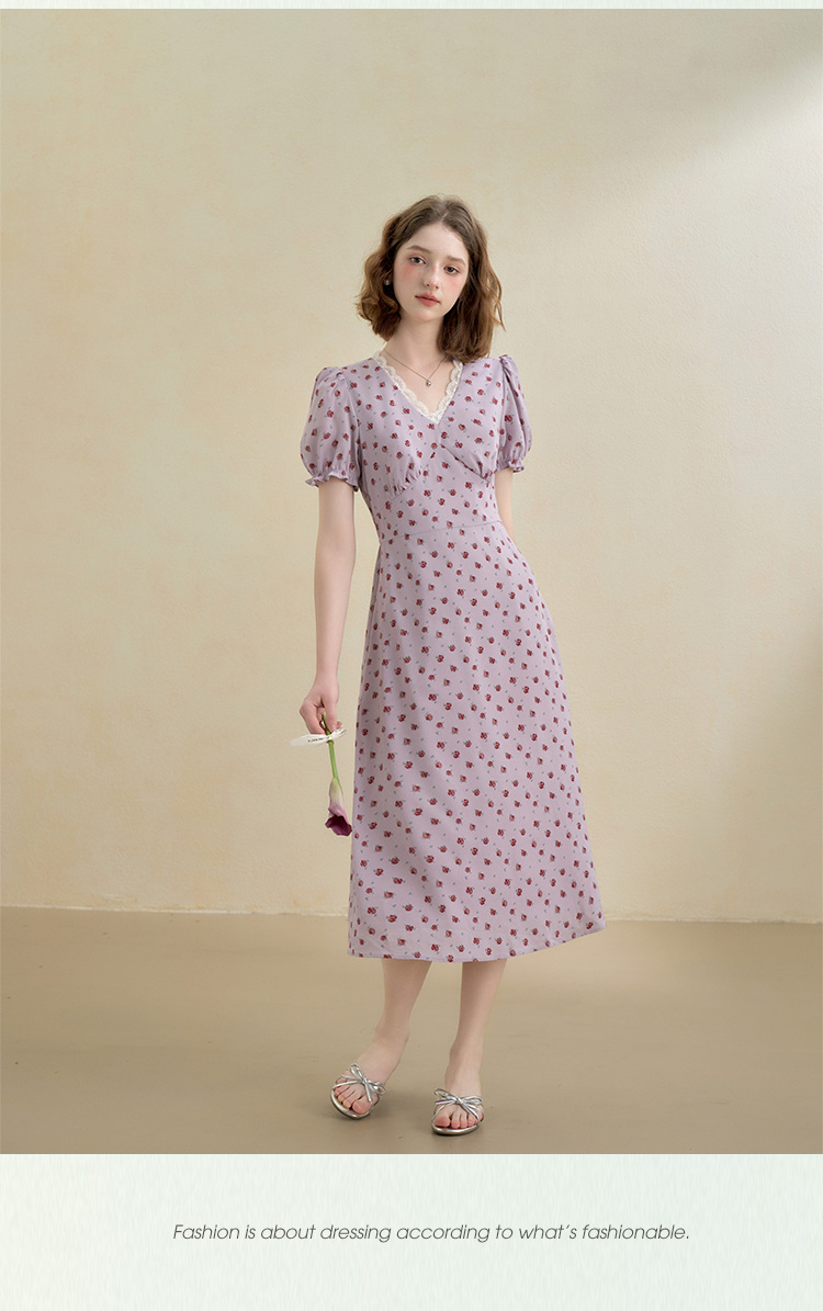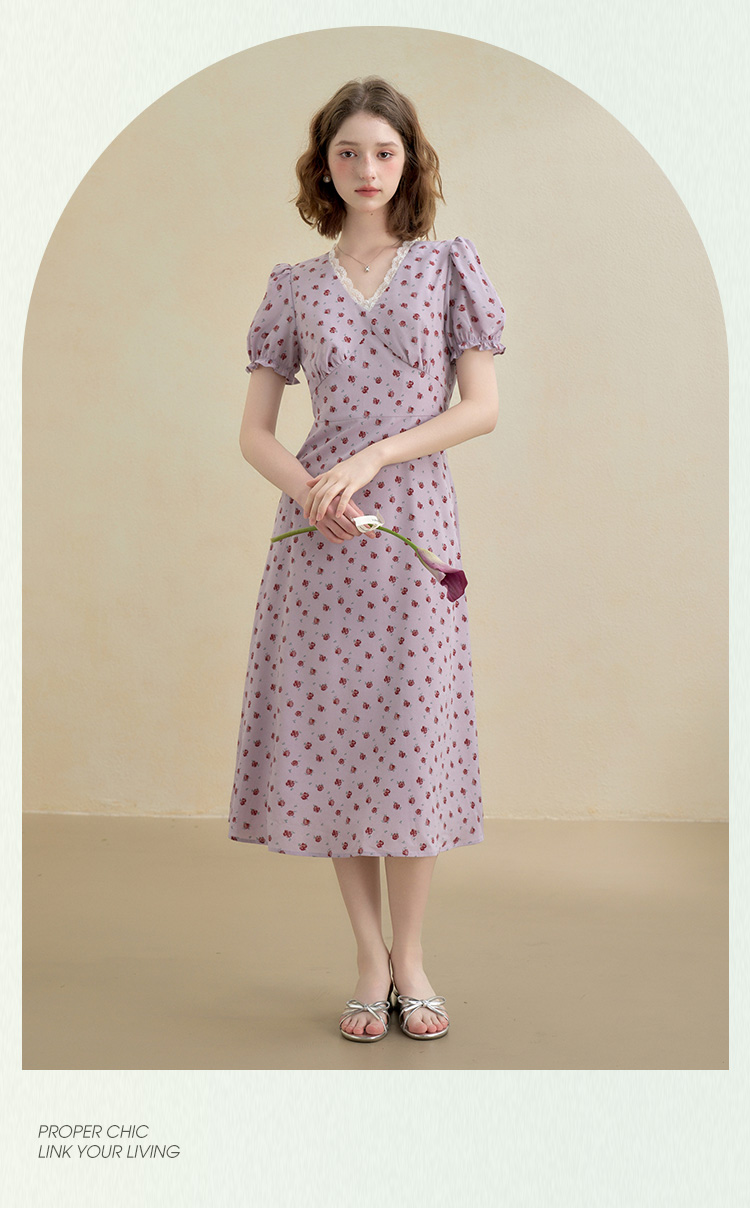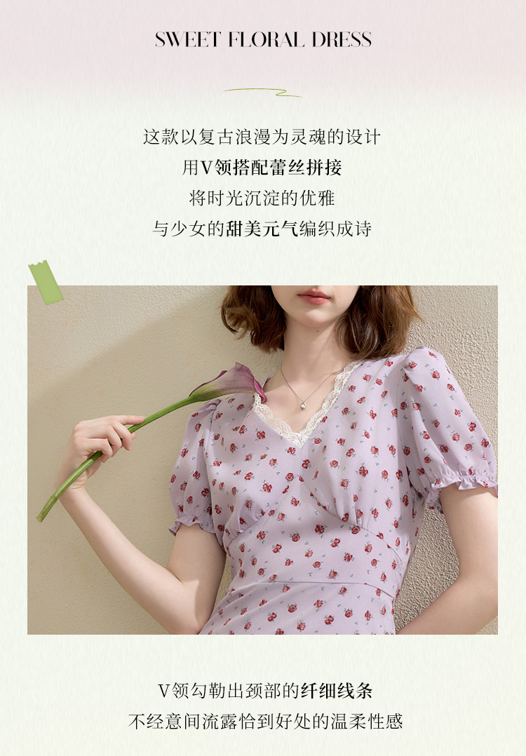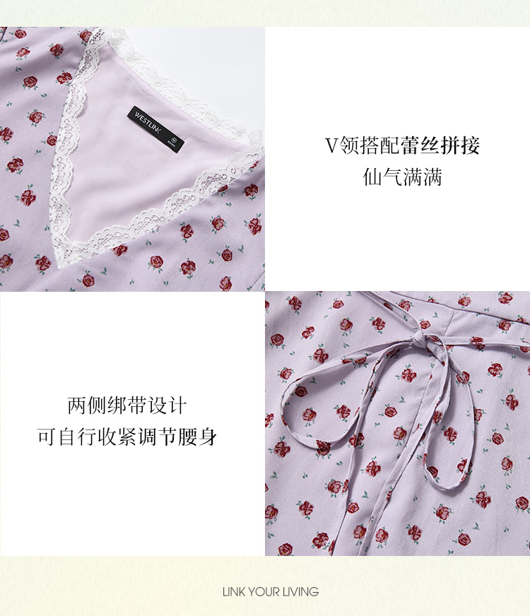 【限时秒杀】西遇浪漫玫瑰蕾丝花边V领碎花连衣裙女秋季新款收腰显瘦长裙V2451096