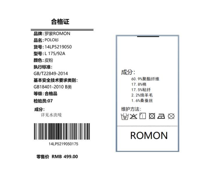 面料:60.9%聚酯纤维 17.8%棉 17.5%粘纤 2.2%绵羊毛 1.6%桑蚕丝