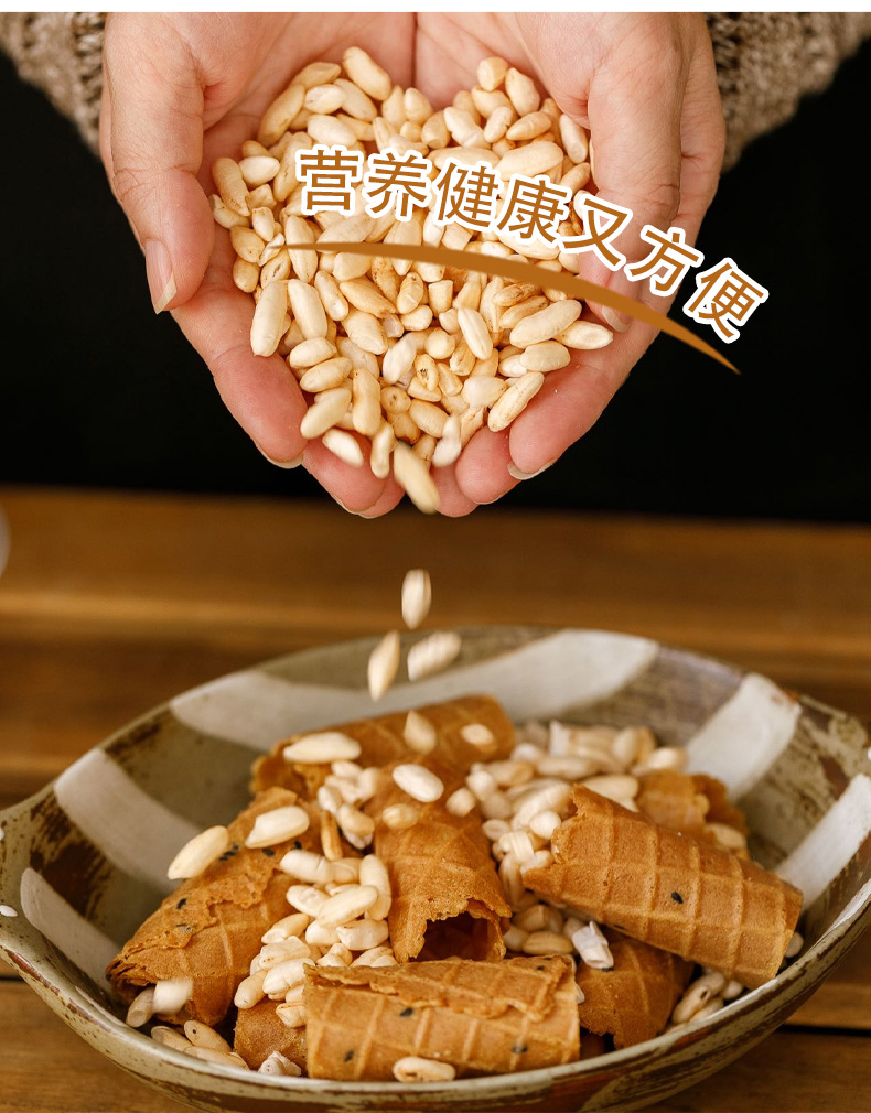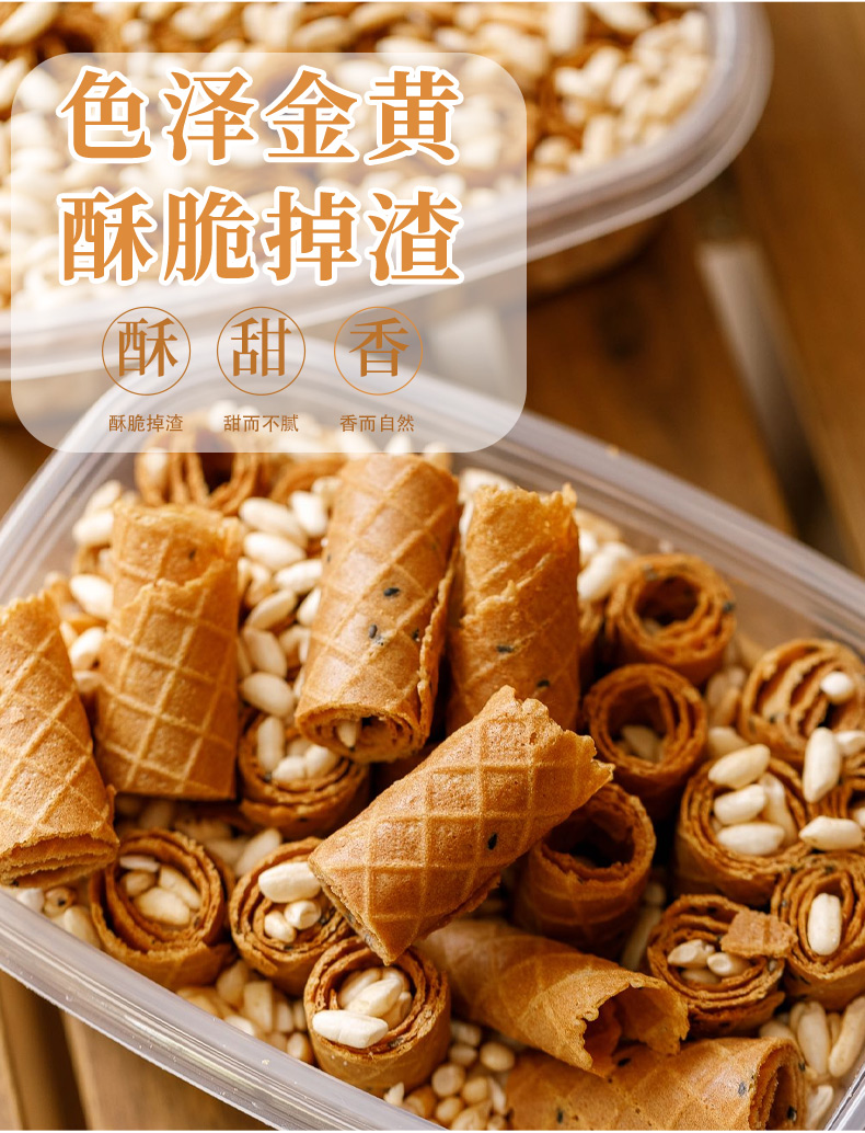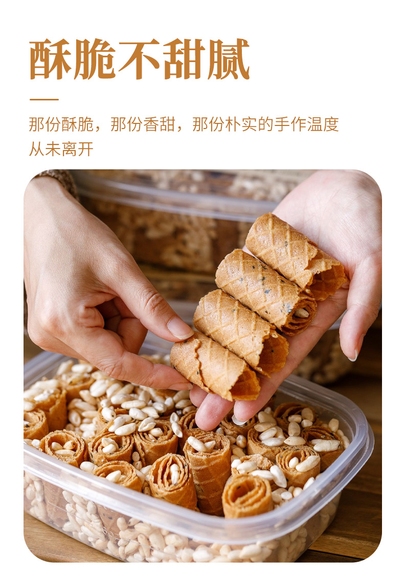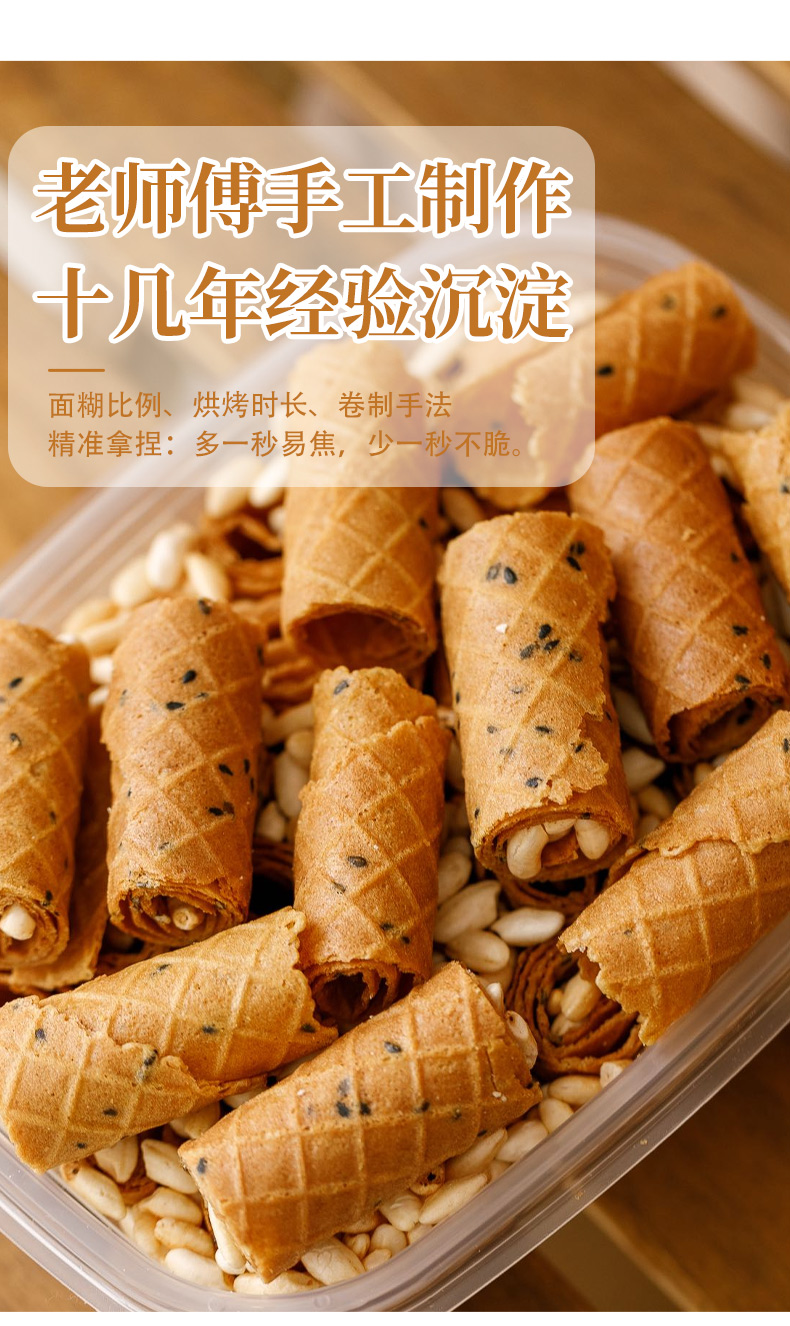 4、不同于千篇一律的机器流水线,这款蛋卷由拥有十几年经验的老师傅手工烘制。每一根都酥脆掉渣,面糊比例、烘烤时长、卷制手法,全靠老师傅精准拿捏:多一秒易焦,少一秒不脆。
