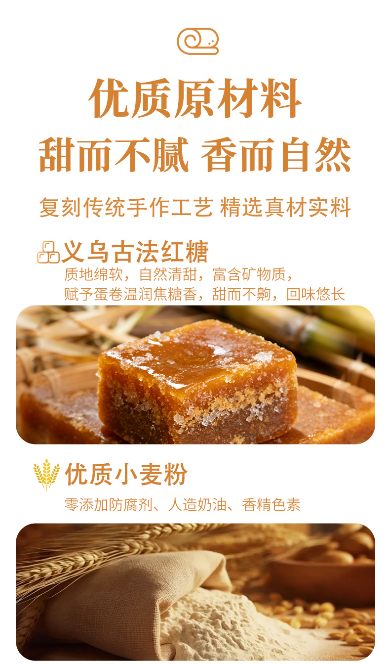 1、义乌古法红糖——蛋卷的甜味来源,灵魂用料,赋予蛋卷温润焦糖香,甜而不齁,回味悠长;