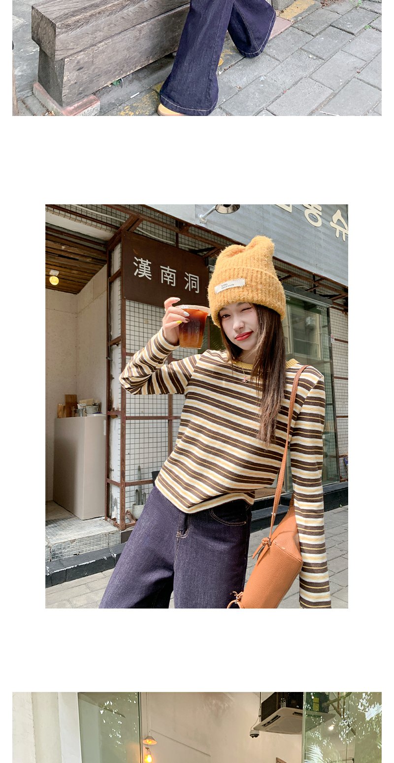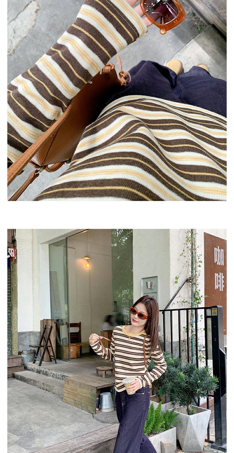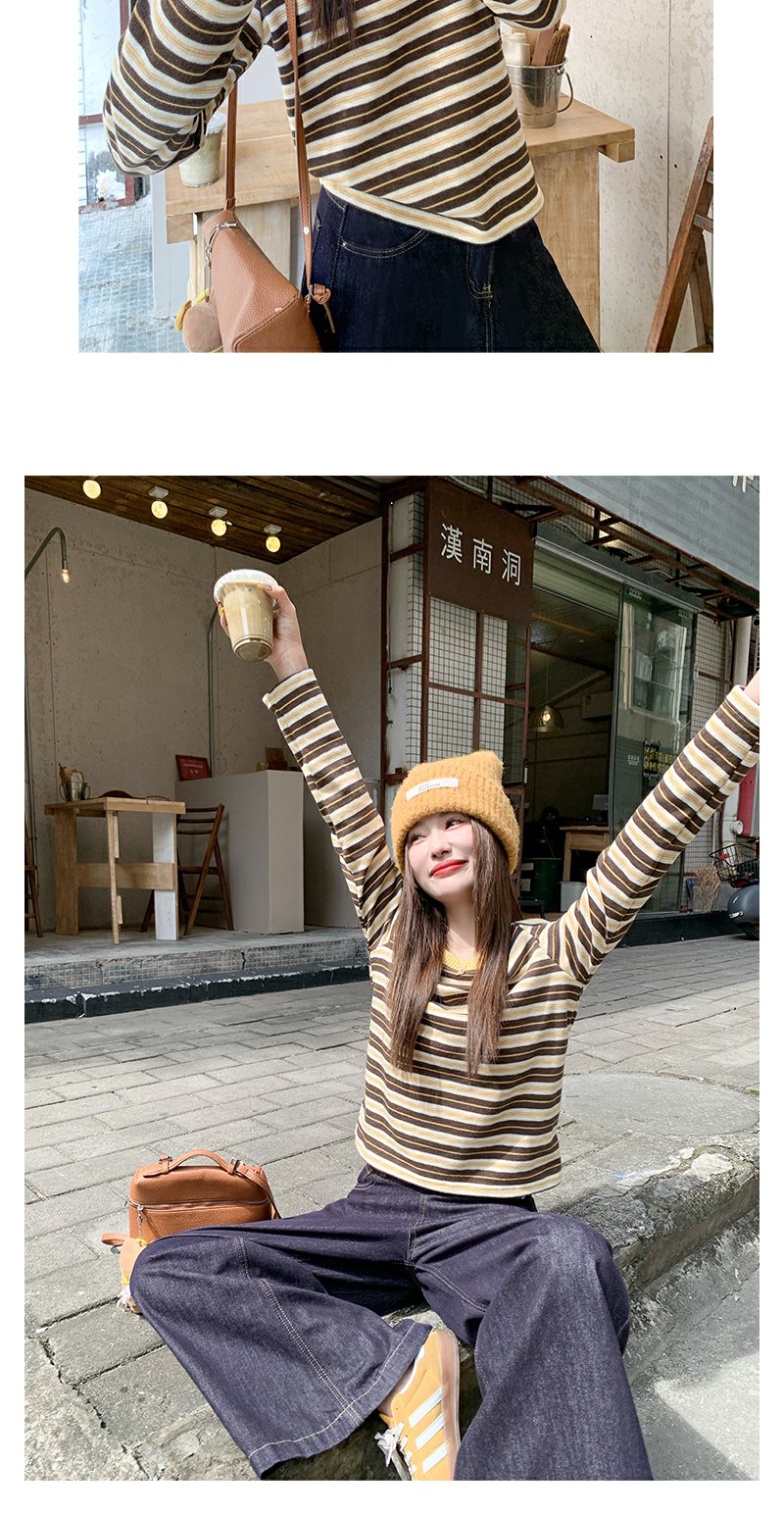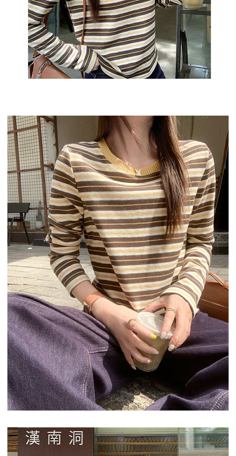 <曾小咸推荐>杏咖条纹宽松长袖休闲T恤