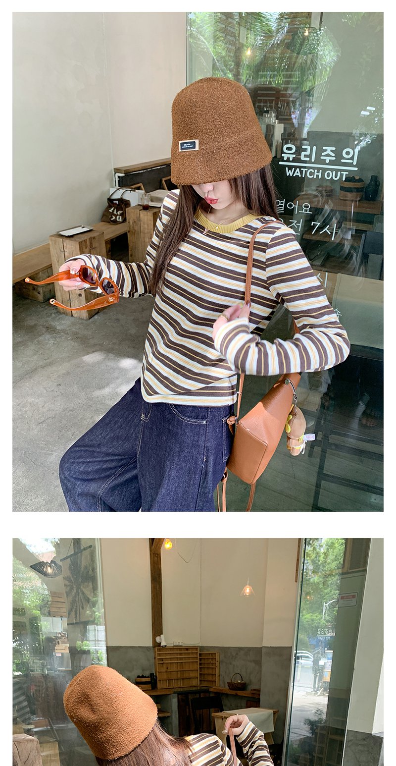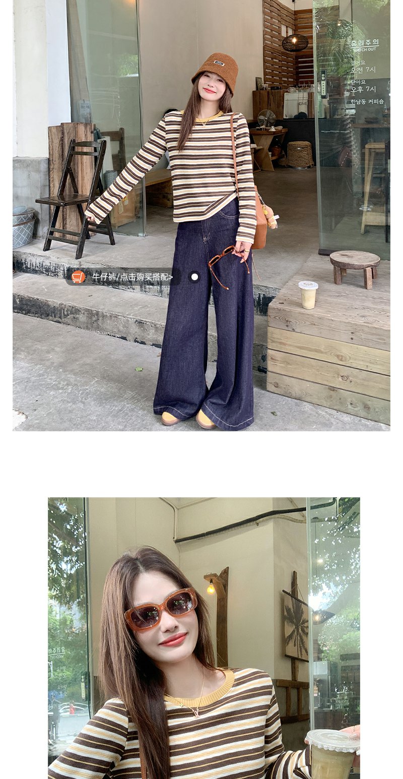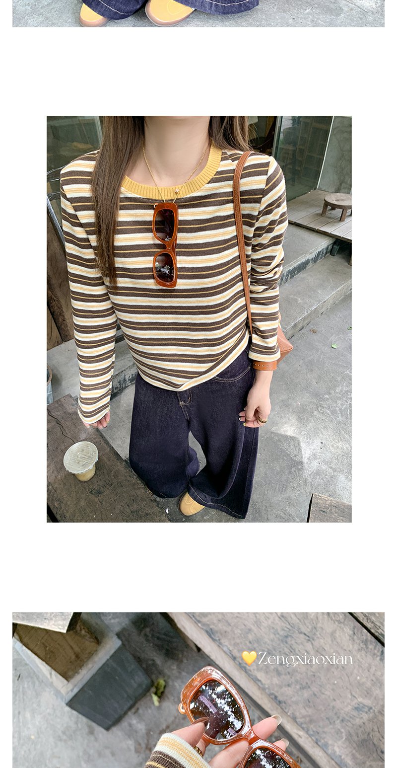 <曾小咸推荐>杏咖条纹宽松长袖休闲T恤
