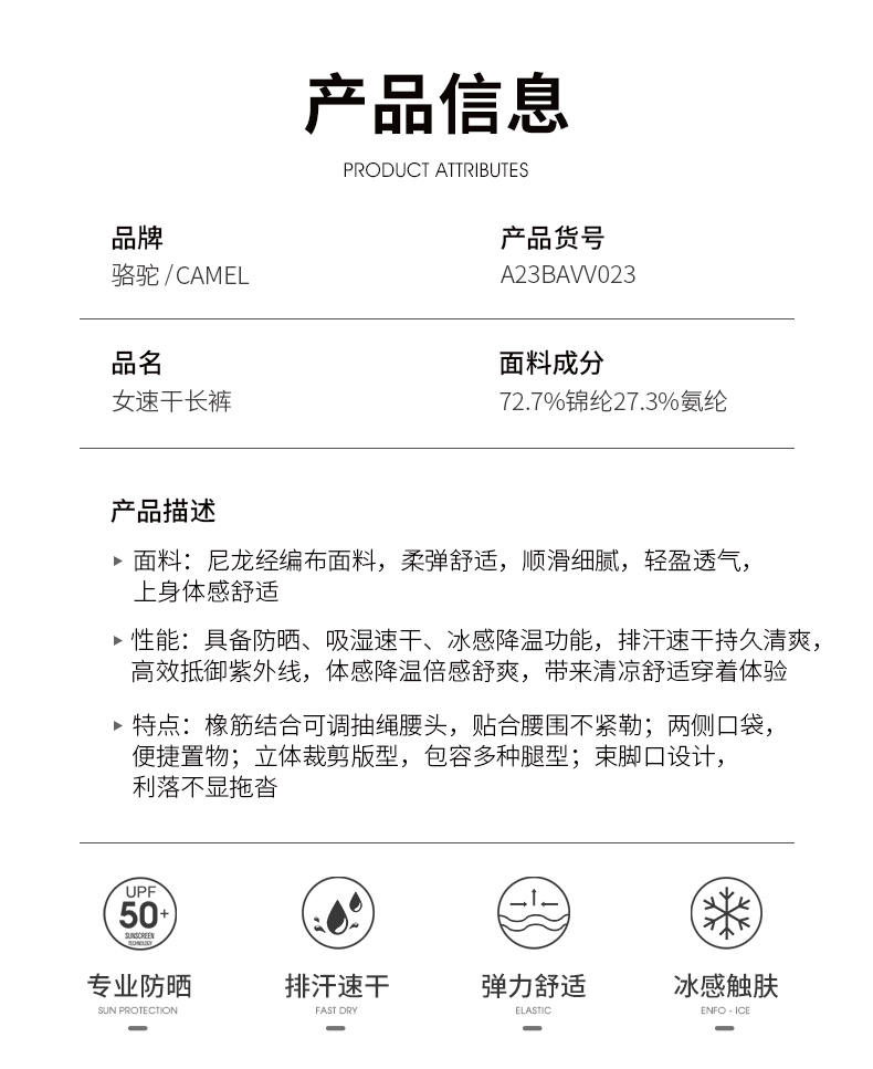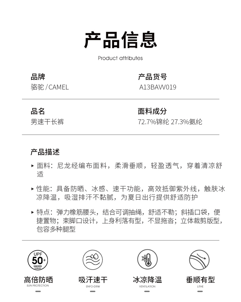 骆驼户外专业防晒冰丝速干裤男夏季薄款登山裤束脚裤快干运动裤女 A662251003_A13BAVV019_A23BAVV023