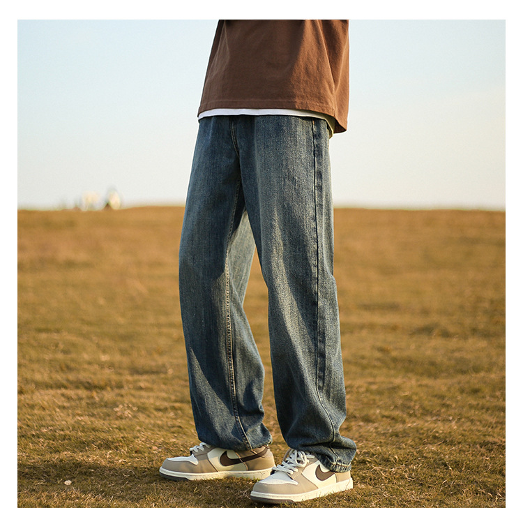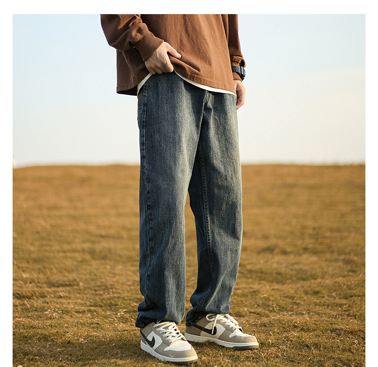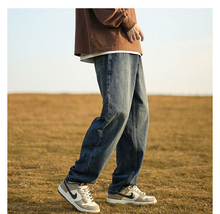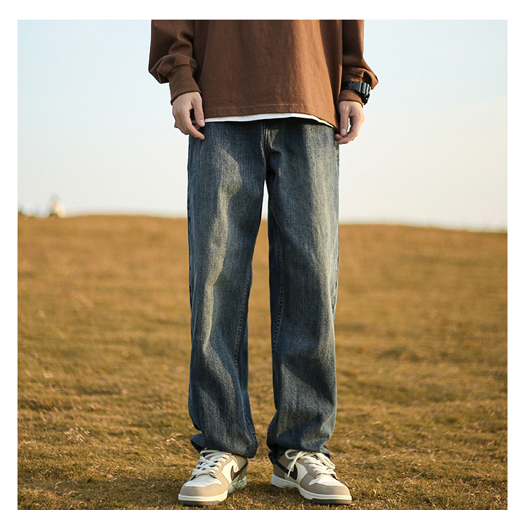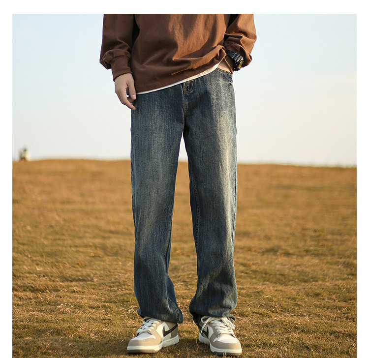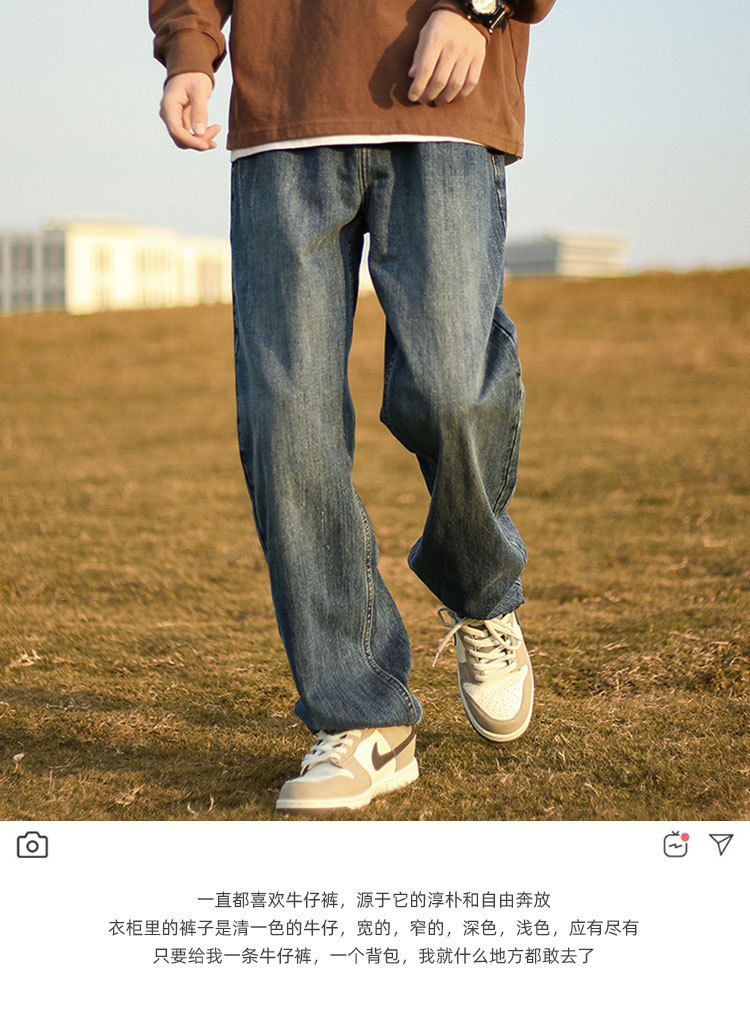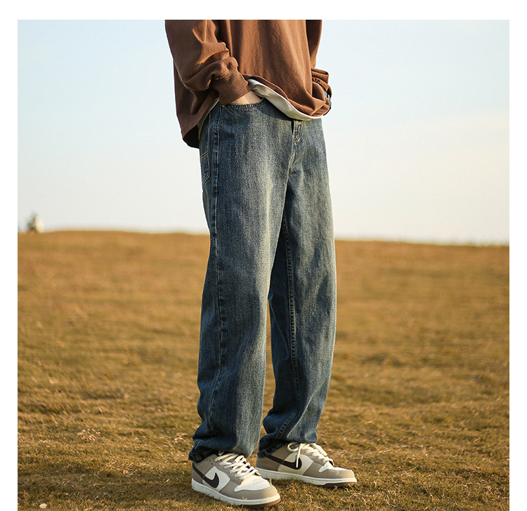 NASA复古水洗牛仔裤男秋冬季加绒美式高街裤子潮宽松阔腿直筒长裤
