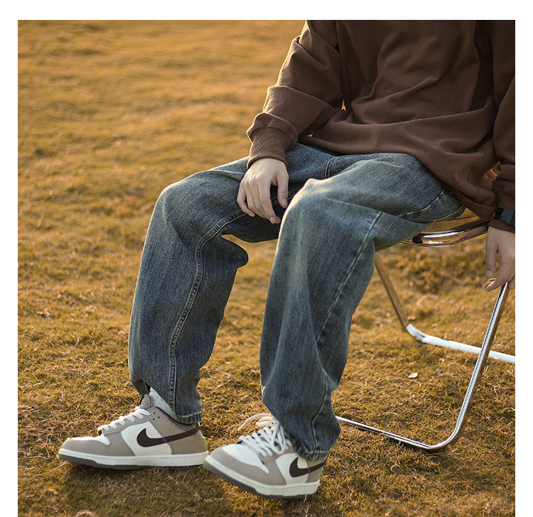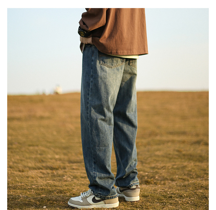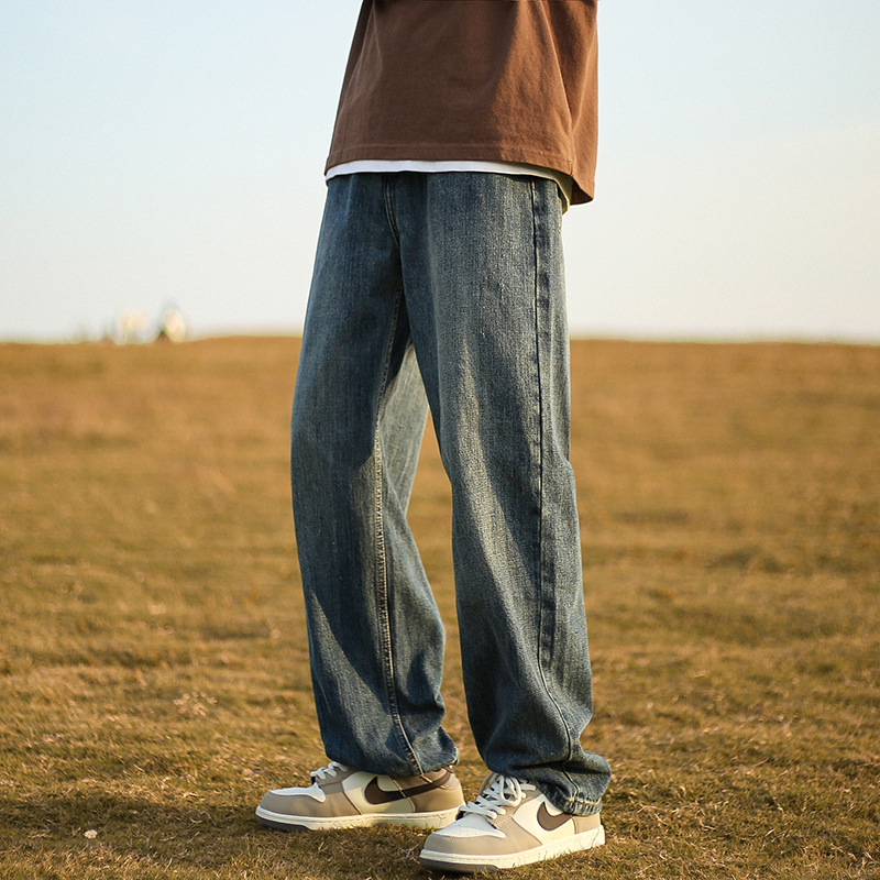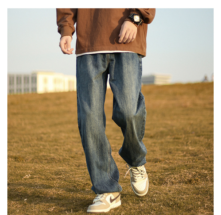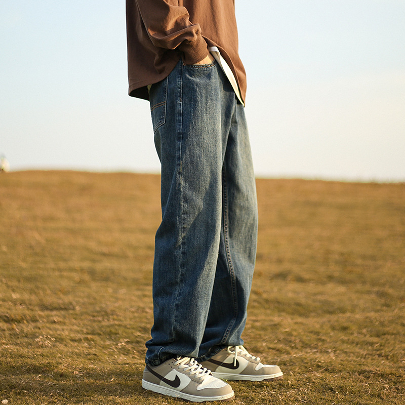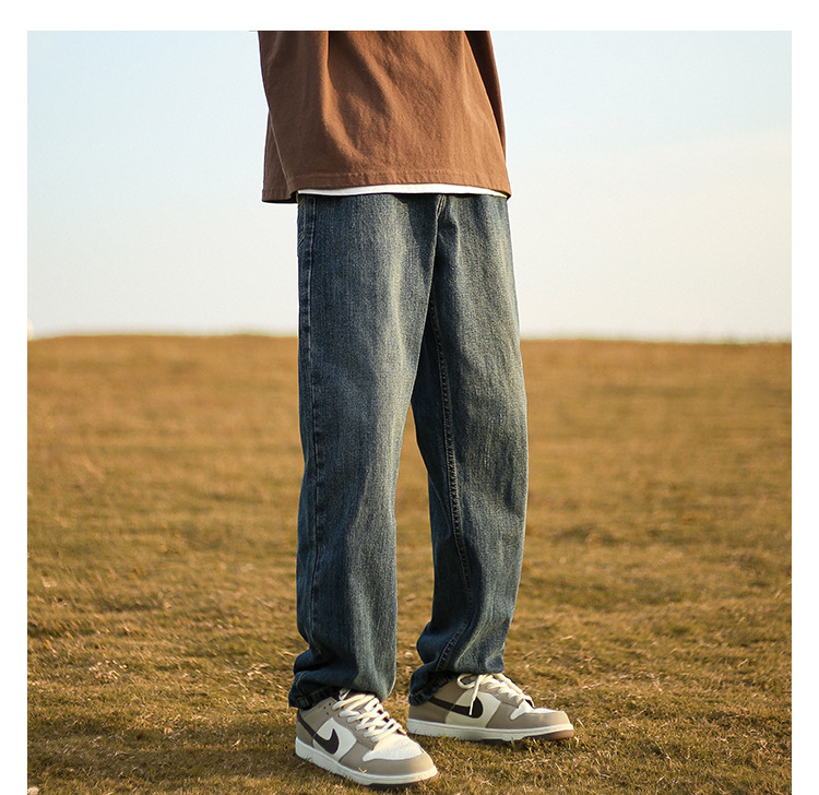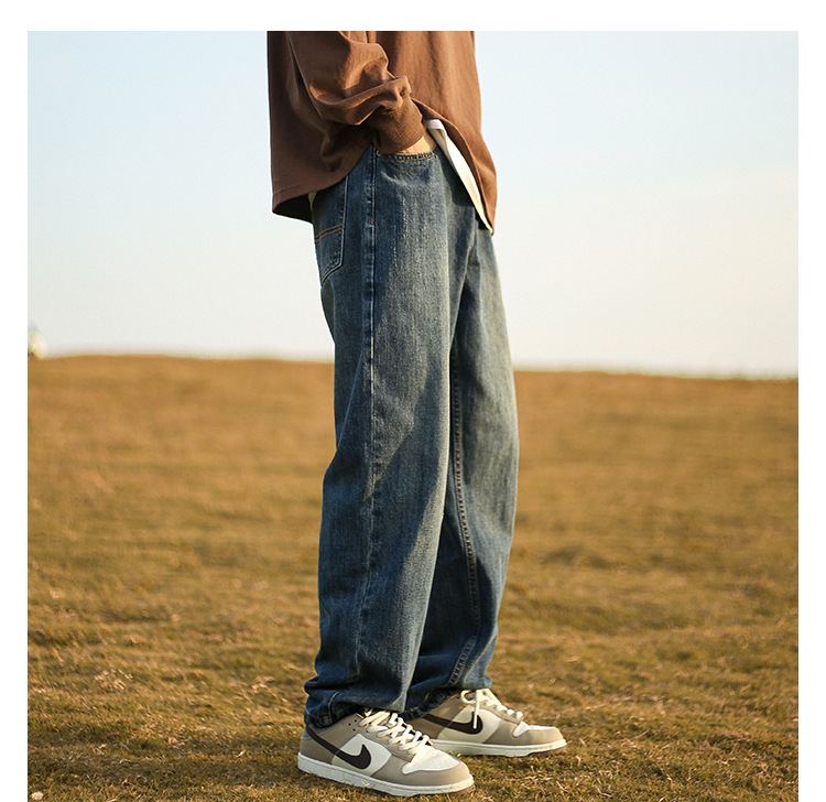 NASA复古水洗牛仔裤男秋冬季加绒美式高街裤子潮宽松阔腿直筒长裤