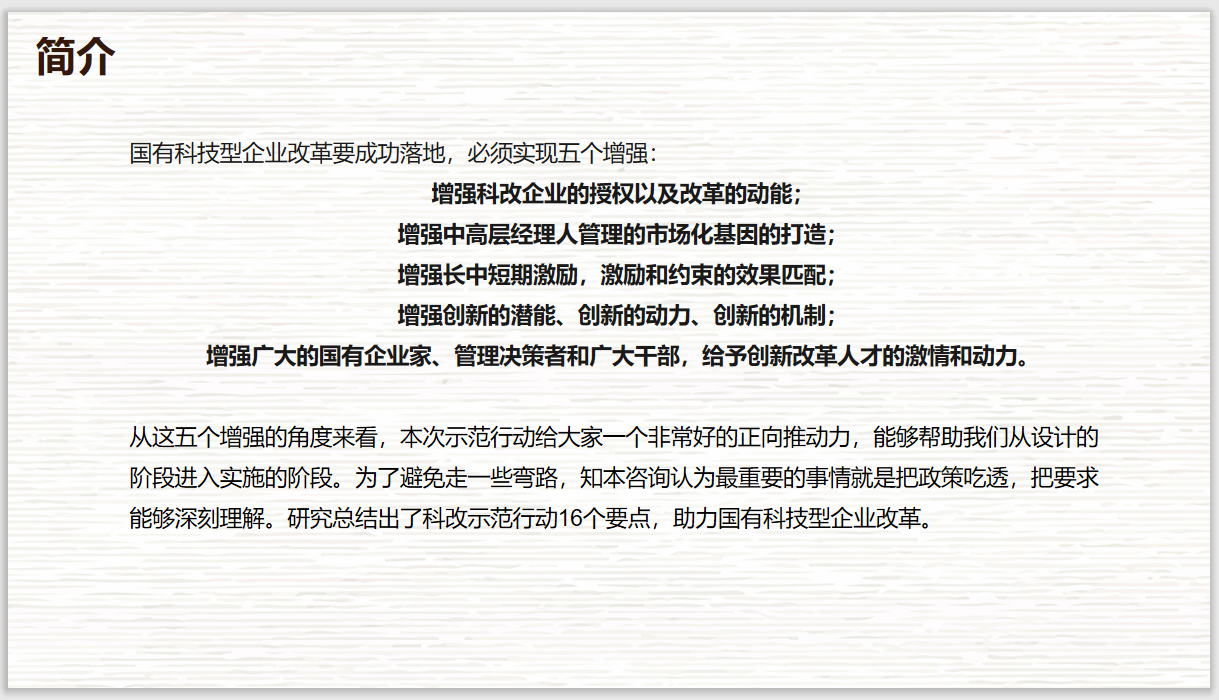 国企改革方法论 主要是在相关政策研究的基础上,结合典型案例,针对国有企业改革过程中存在的方方面的问题,提炼而出的具有实操性、系统性的解决方案。知本咨询国企改革方法论,聚焦于 混改和股权多元化、干部机制、三项制度、国企创新、两类公司、中长期激励、管控与治理优化、对标世界一流、国有企业产业整合和重组 等不同领域,为国有企业提供可快速落地的改革模型、改革路径、改革举措等,帮助国有企业早日实现改革目标。