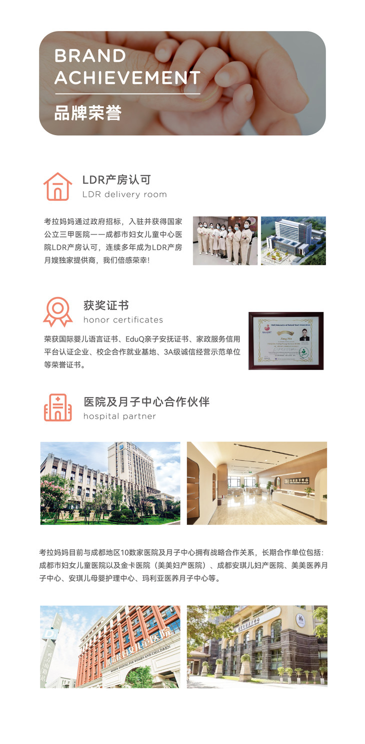 【考拉妈妈】品牌创立于2019年,总部位于成都市青羊区,是一家专注于母婴护理&家庭育儿品质服务的家政公司,布局母婴养育服务平台和专业培训2大版块,提供月嫂,育儿嫂,产后康复,考拉母婴养育学院,科学养育研究中心等5大体系服务。