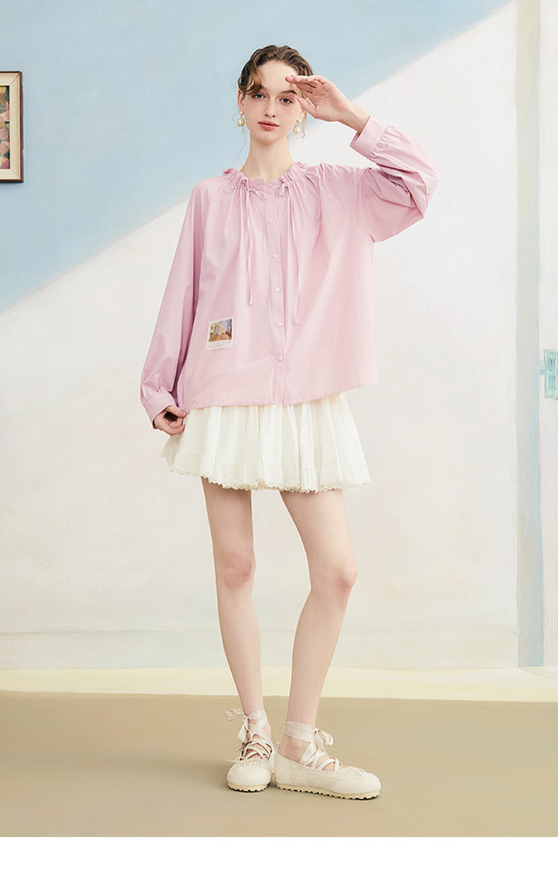 两三事梵高文艺 微醺时分 2025夏季新款甜美抽褶绑带领印花衬衫女