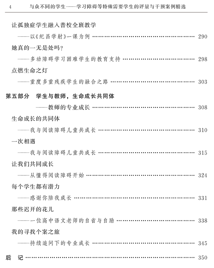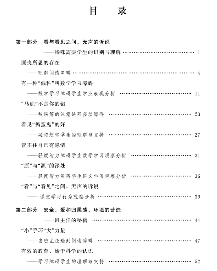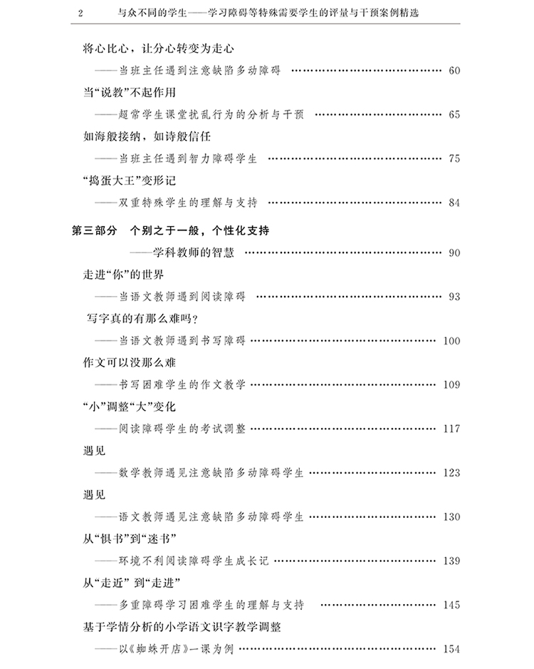 “特殊需要”这个视角,能够帮助一线教师看到“正常”之外还有“障碍”、“普通”之外还有“特殊”、“教学”之前需懂得学生“学习”的规律与特点。本书案例包括注意缺陷、超常、智力边缘、阅读障碍、书写障碍、数学障碍等各类学习特殊需要学生。内容几乎覆盖各类普通学校中常见的学习特殊需要学生及教师面对的难点问题,有些文章研究内容是国内稀缺的,如:基于学校实践层面本位的学习障碍学生的识别、评量与干预;超常学生的课堂干扰行为的功能分析与干预;自闭症学生的课堂教学支持等。本书形式上以教学案例和教育故事为主体,故事的优势在于可读性强,具体生动;同时具有情境性,更容易借鉴并迁移。