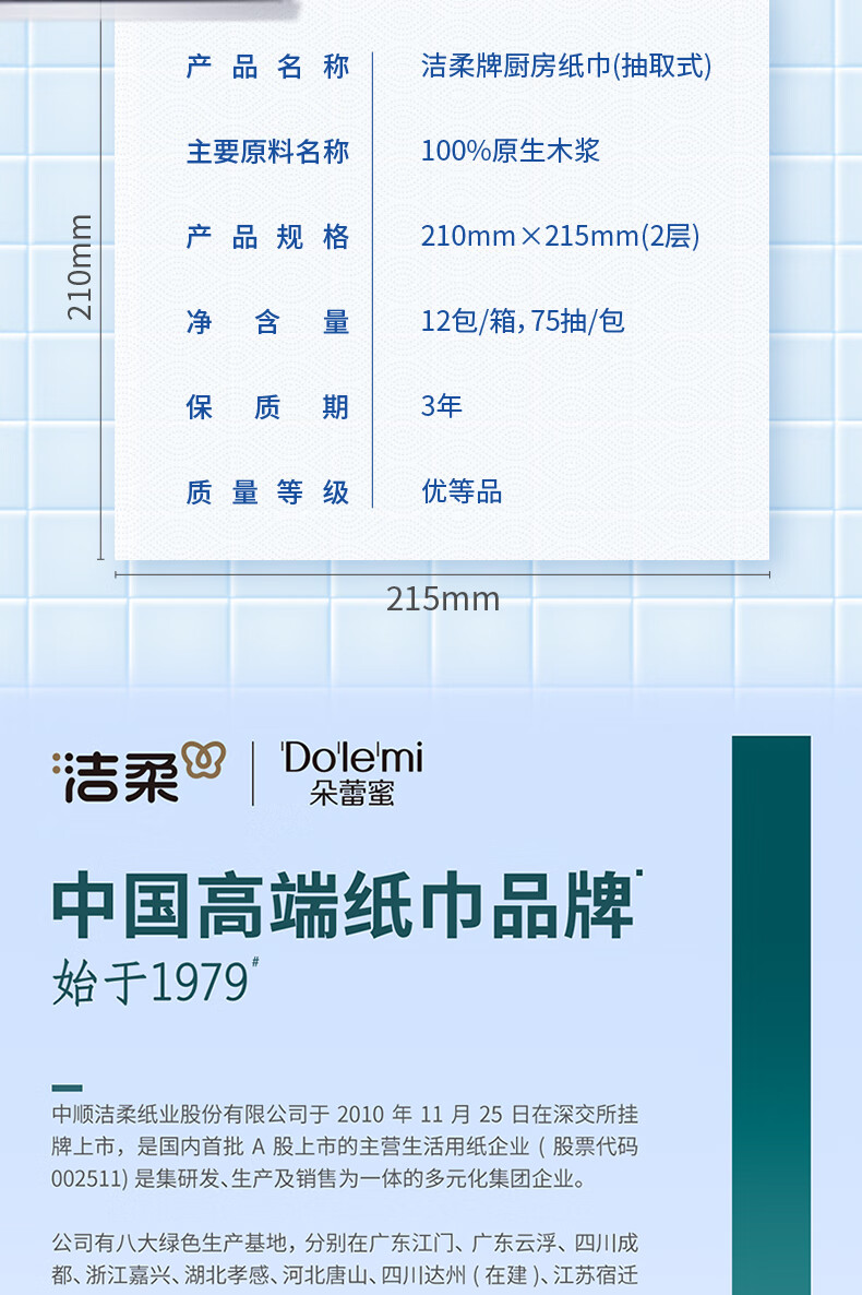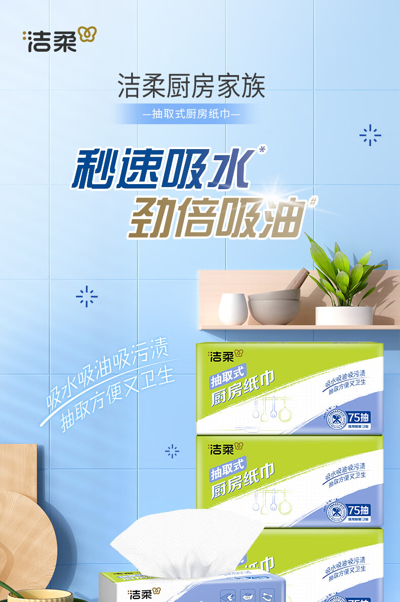 洁柔厨房用纸2层75抽12包加大规格加倍吸水吸油污 新老包装随机发货 箱装