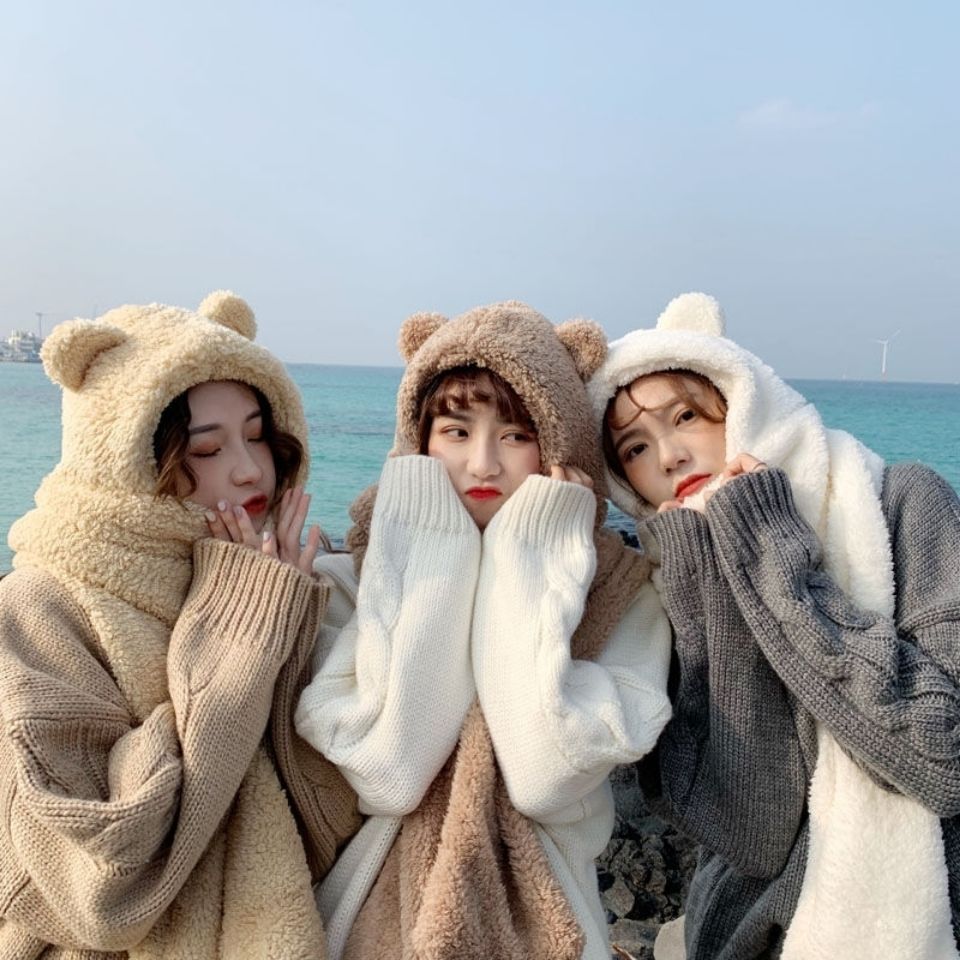 毛绒小熊围巾帽子一体三合一女秋冬季百搭可爱冬天保暖