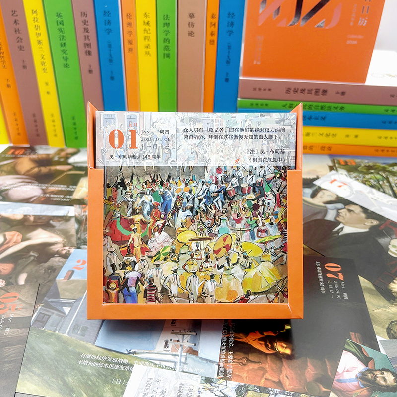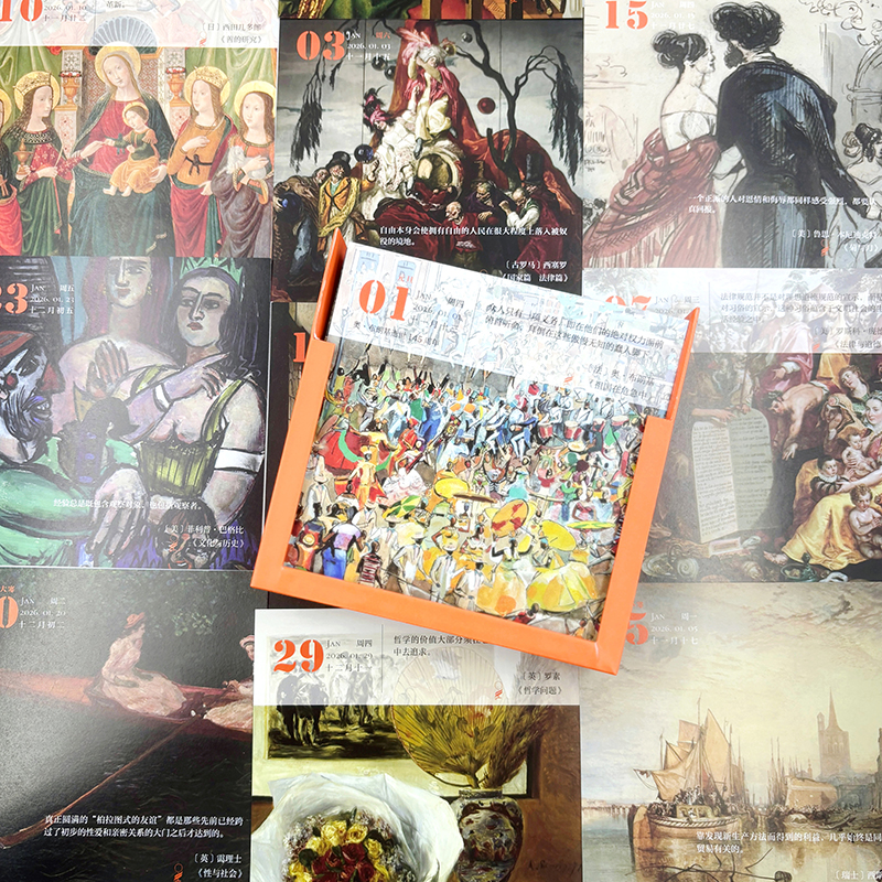 2026汉译日历在内容上,依然是每日撷取“汉译世界学术名著丛书”一书一语,配以相关主题的精美插图,或满铺,或留白;插图形式亦不拘一格,油画、版画、水彩、雕塑,但求呼应书摘内蕴。