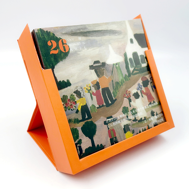 《2026汉译名著日历》在外观上进行了全新改版,区别于以往哑光双环配纸质支架、套盒塑封包装的形式,今年的汉译日历采用了两种摆放角度的磁吸纸质支架,单页正反面印刷,边长125mm的正方形尺寸;摒弃了过去六年采用的金属双环、单面印刷、成品110*160的长方形成品,形式更为简洁、紧凑,契合当下抱朴含真、删华就素的审美旨趣。