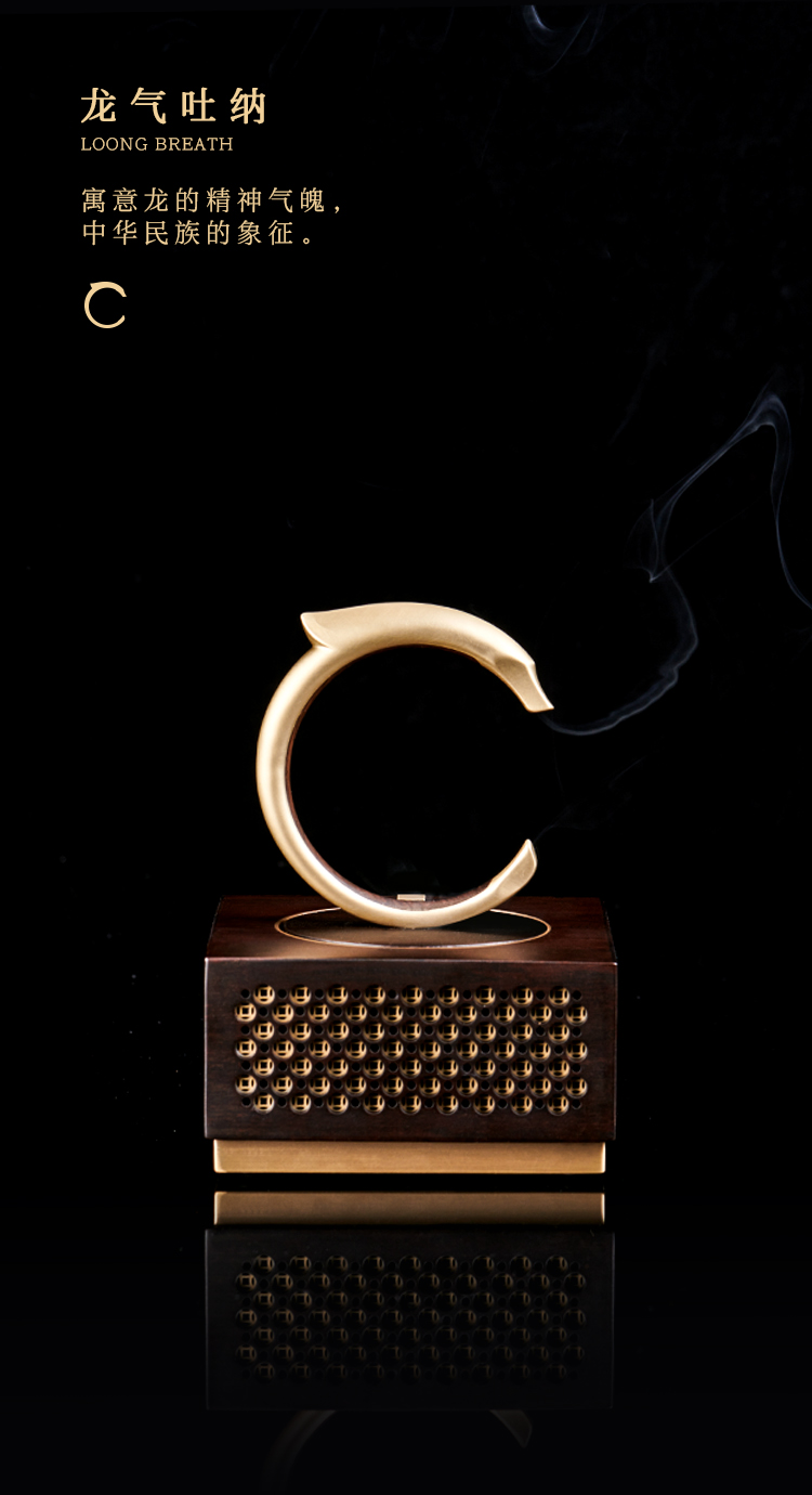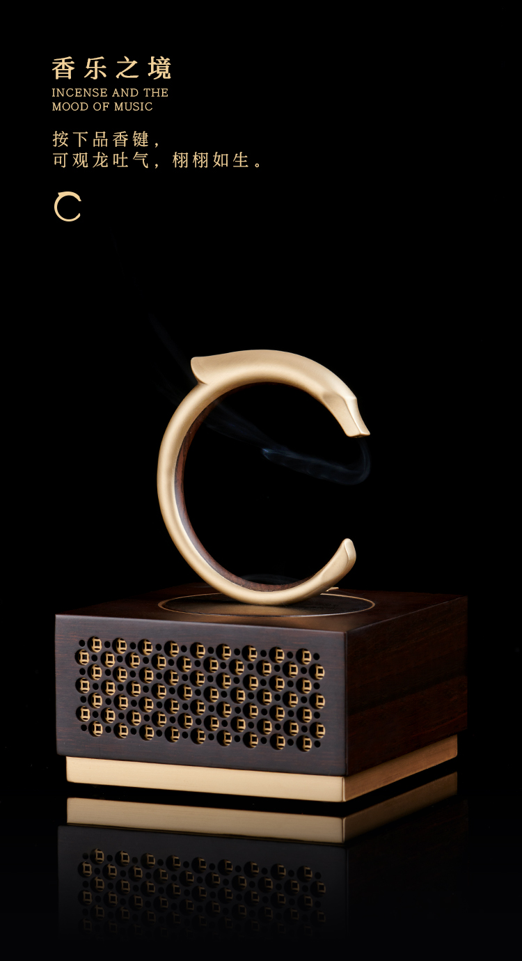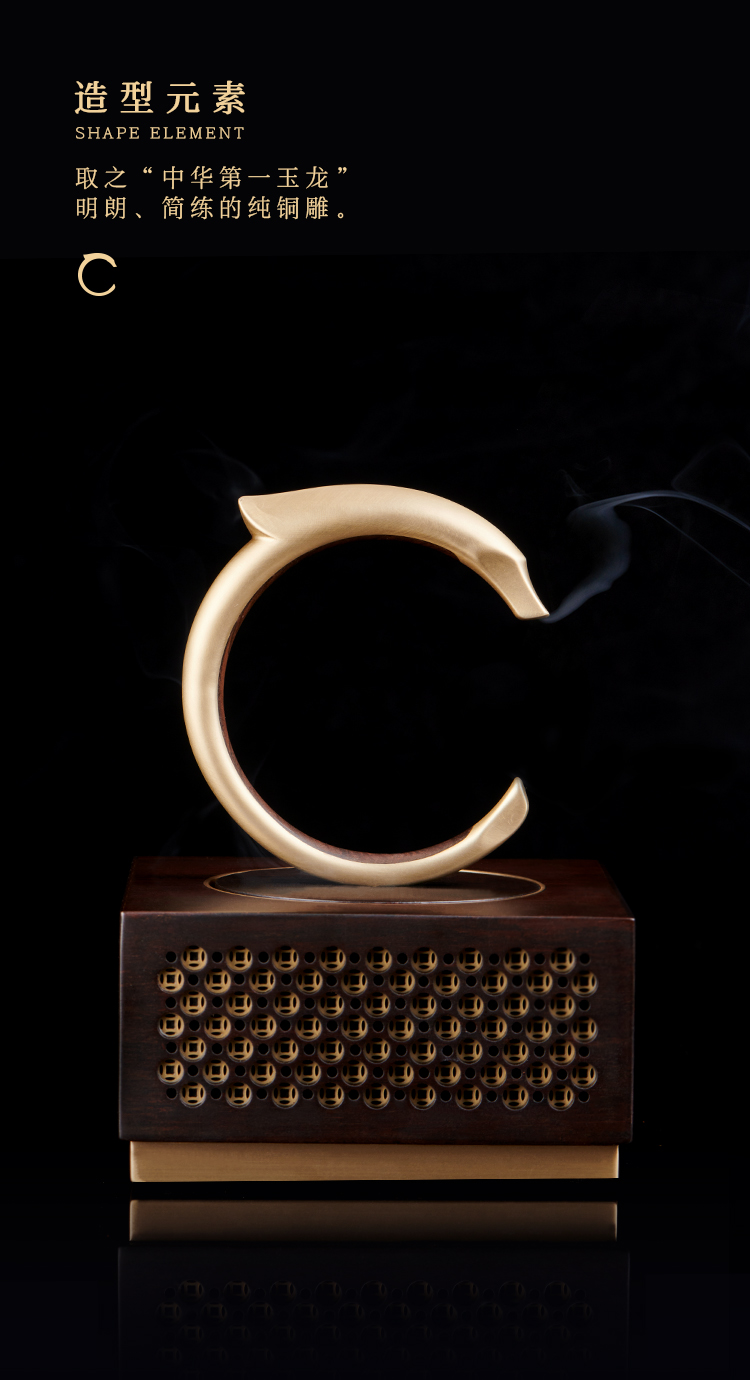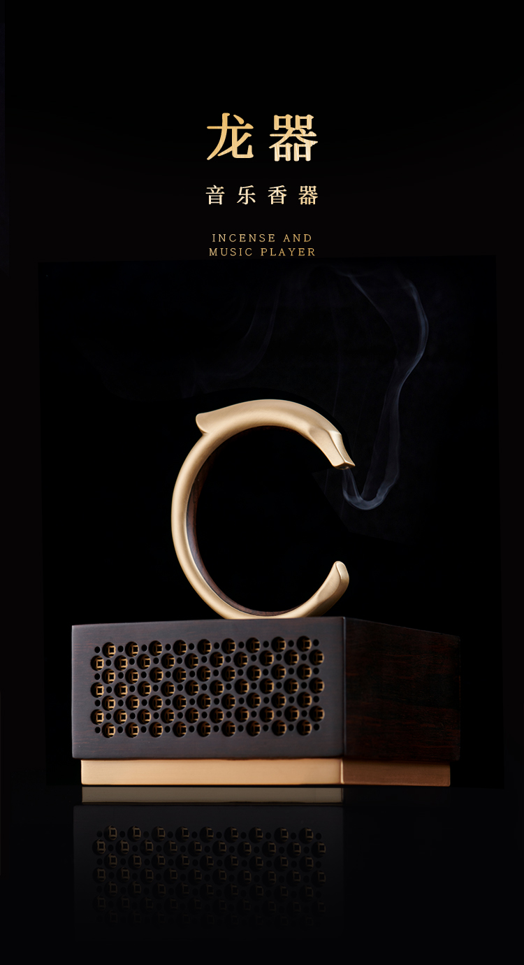 设计理念:千年史载,龙是中国的象征、民族的象征,龙文化渗透在每一个炎黄子孙的血脉里。龙器,以5000年前的文物“中华第一玉龙”为设计元素,取材于此龙形象,设计为音乐香器功能型器物,深入人们日常生活使用中,以弘扬华夏民族文化。香器功能,以龙吐气动态形象为主,表达龙吐气为雷,雷出地奋,众物同应,引发春来之生机勃勃的象征;音乐功能,乾隆通宝元素为出音孔,隐喻钱龙引进四方财寓意。音乐模式为TF卡模式和蓝牙模式两种;点香功能,隐藏点香设计,不需引火点燃,安全便捷。