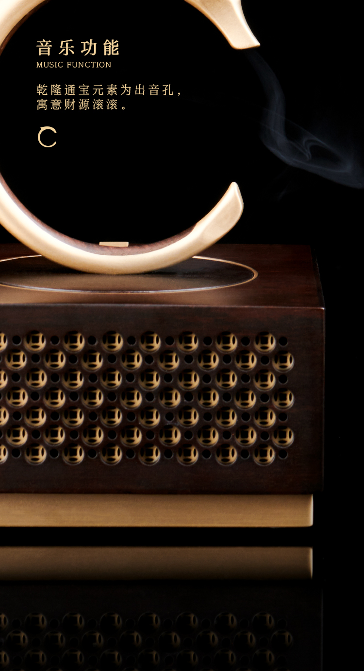 ⑦音乐功能:乾隆通宝元素为出音孔,隐喻纳福迎祥,钱途光明。也寓意生意兴隆,财源滚滚。