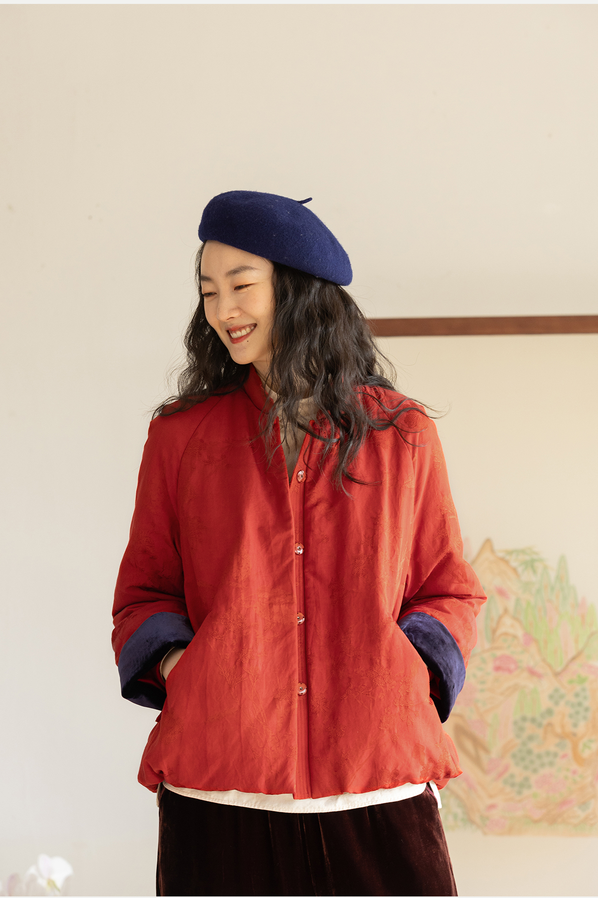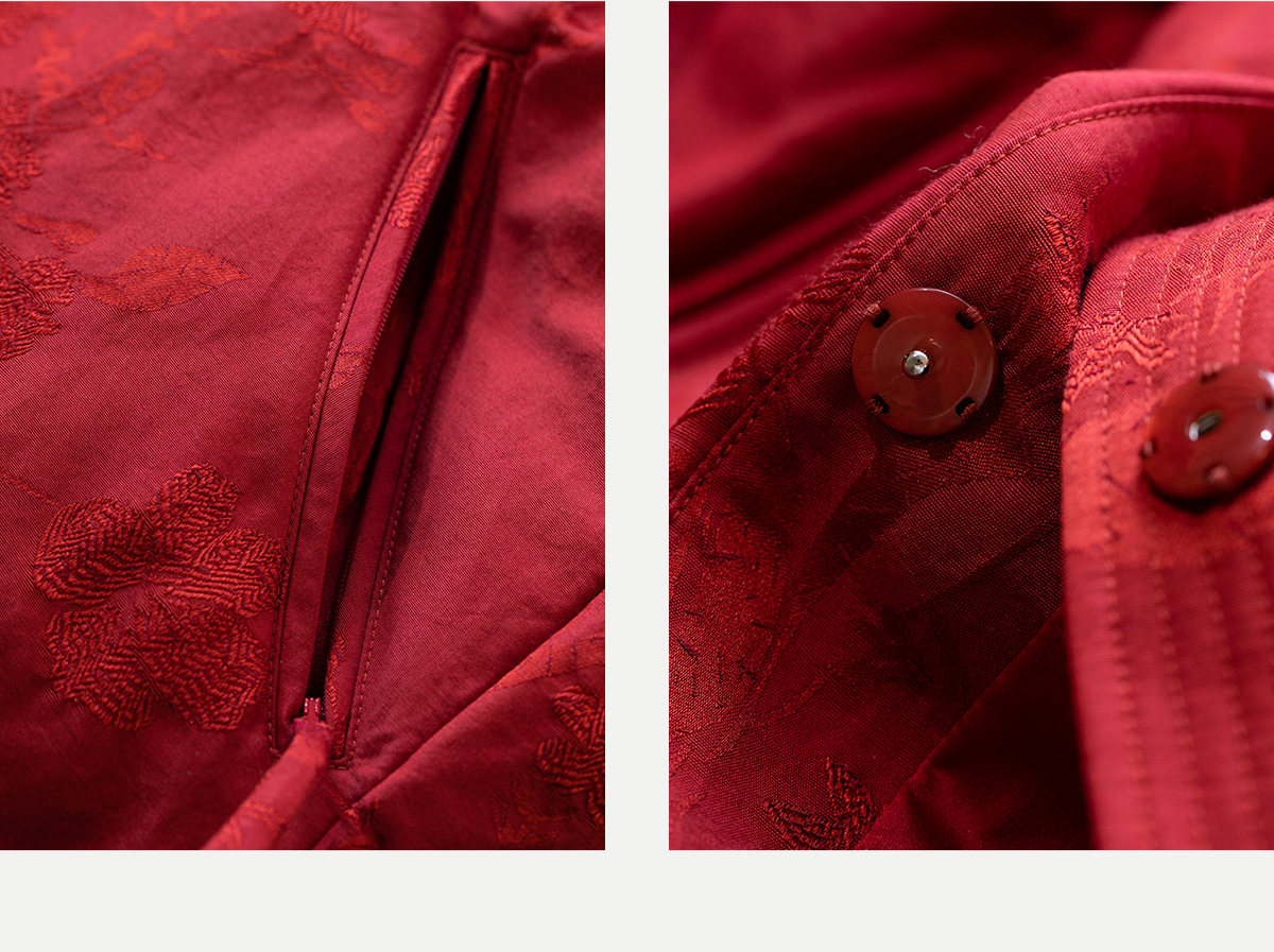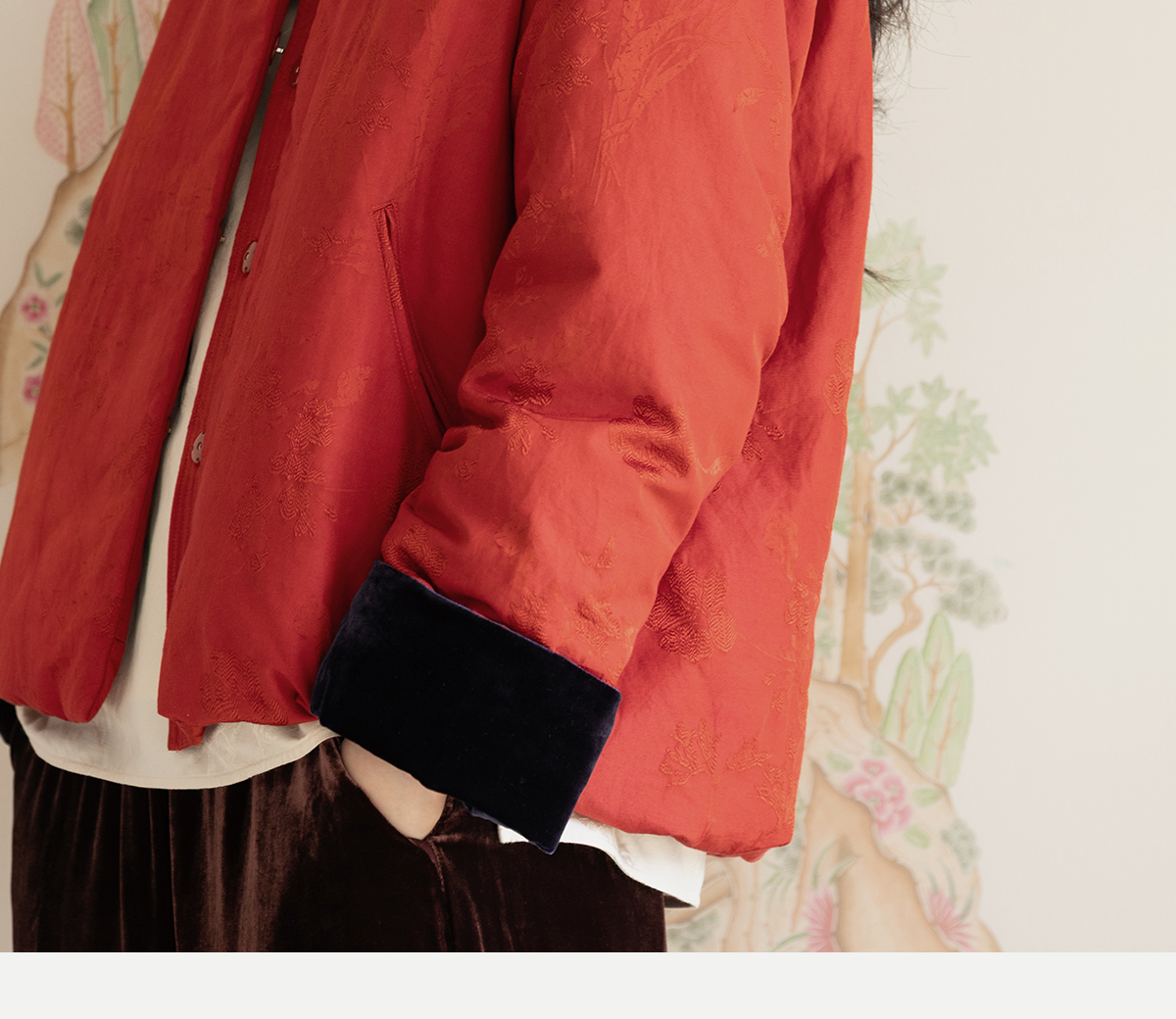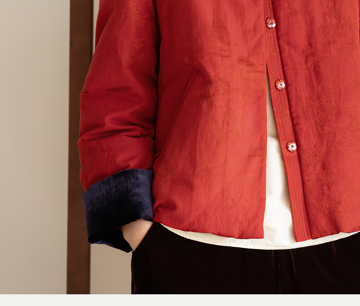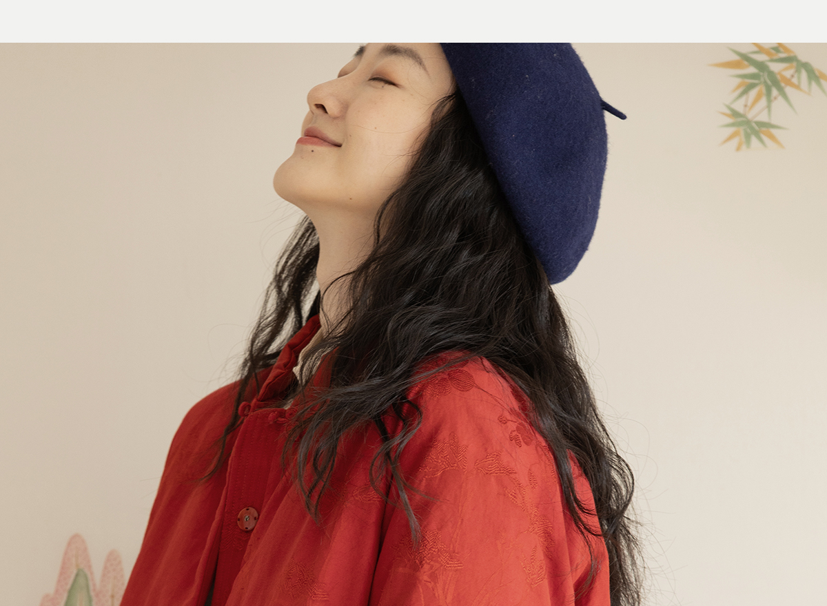 牧衣游原创 真丝混纺提花高蓬松红嘴雁绒羽绒服红色中式 松间照