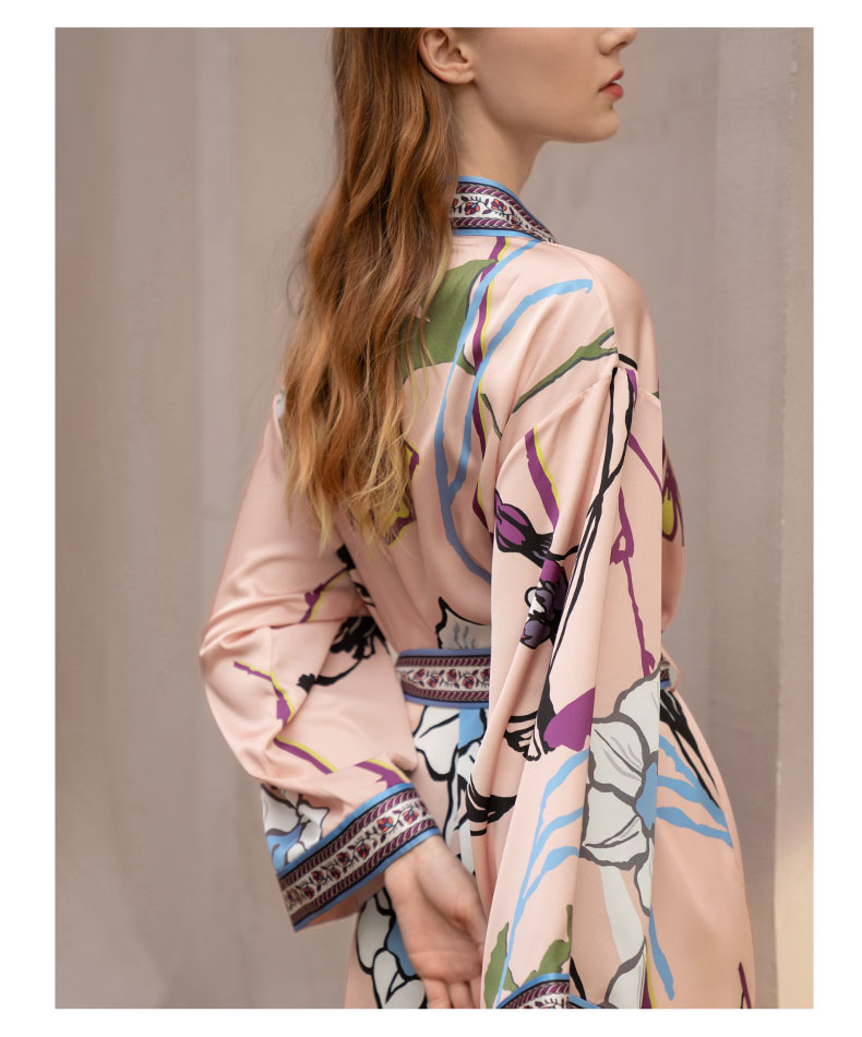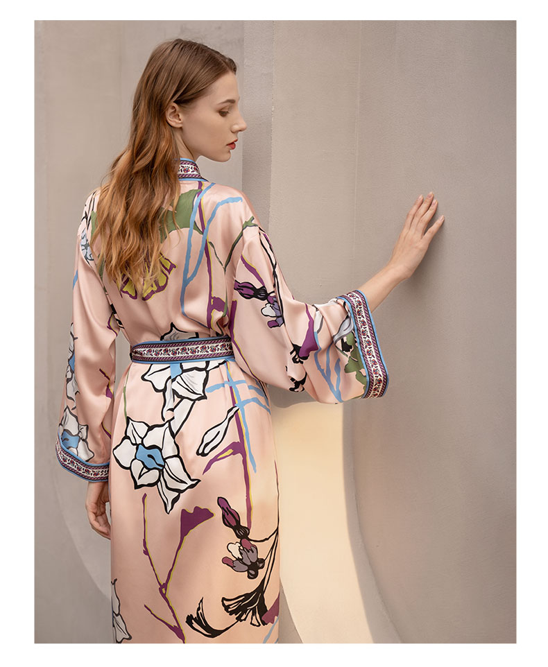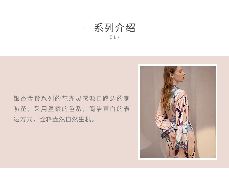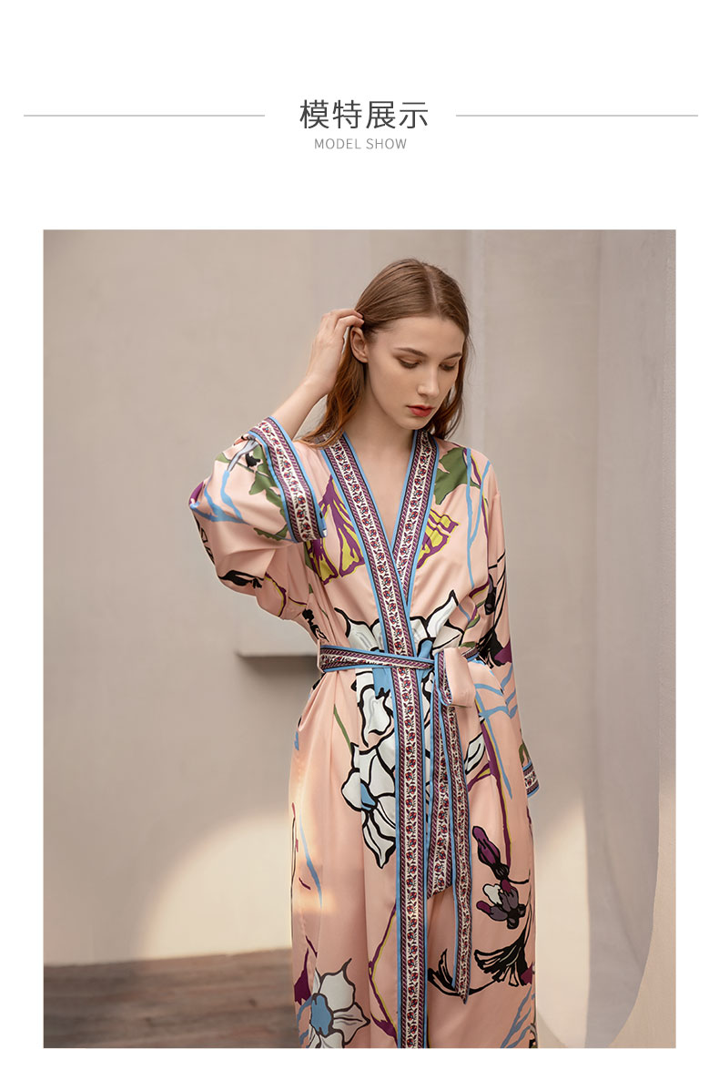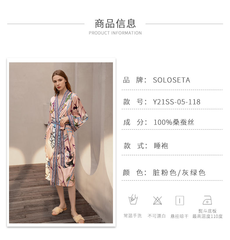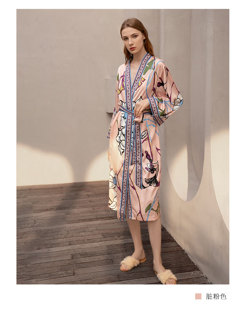 Solo seta真丝睡袍睡衣桑蚕丝家居服女长款粉色印花丝绸秋冬