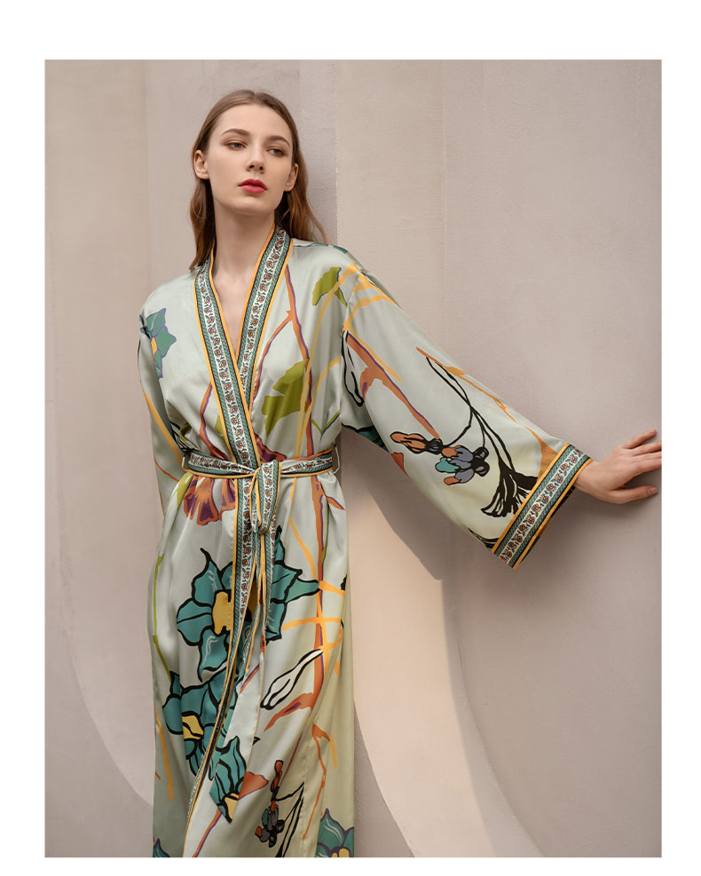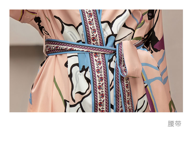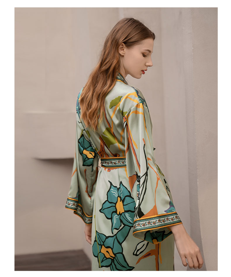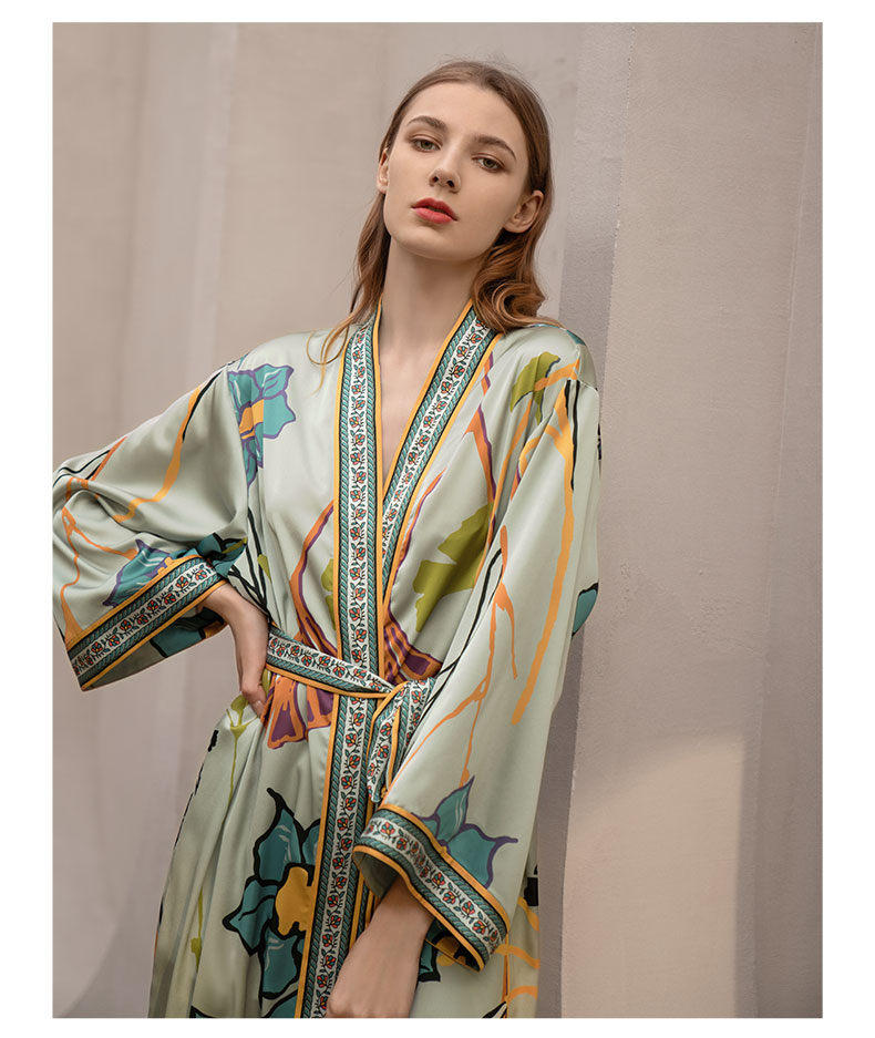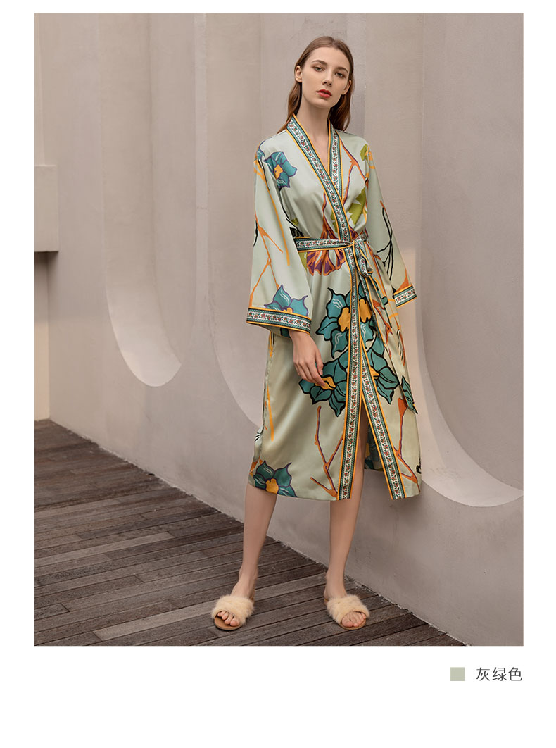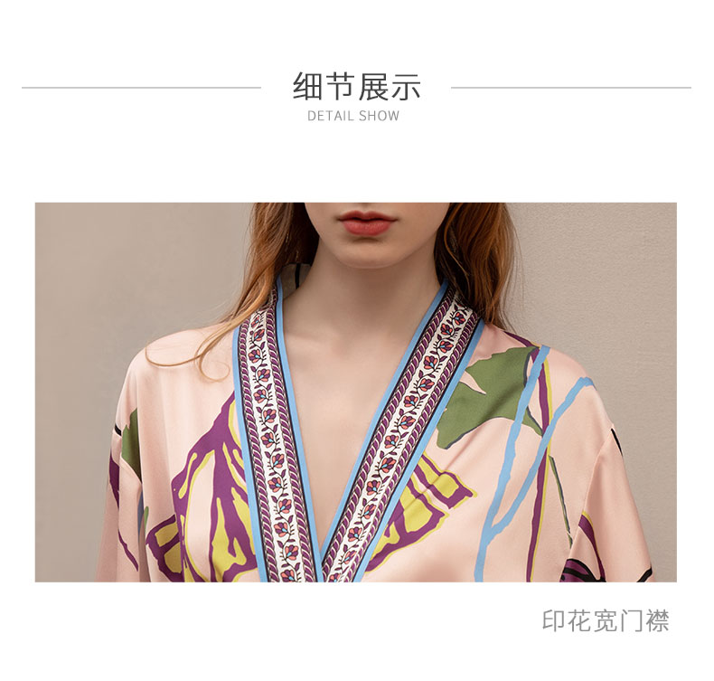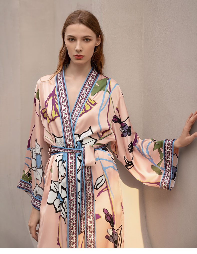 Solo seta真丝睡袍睡衣桑蚕丝家居服女长款粉色印花丝绸秋冬