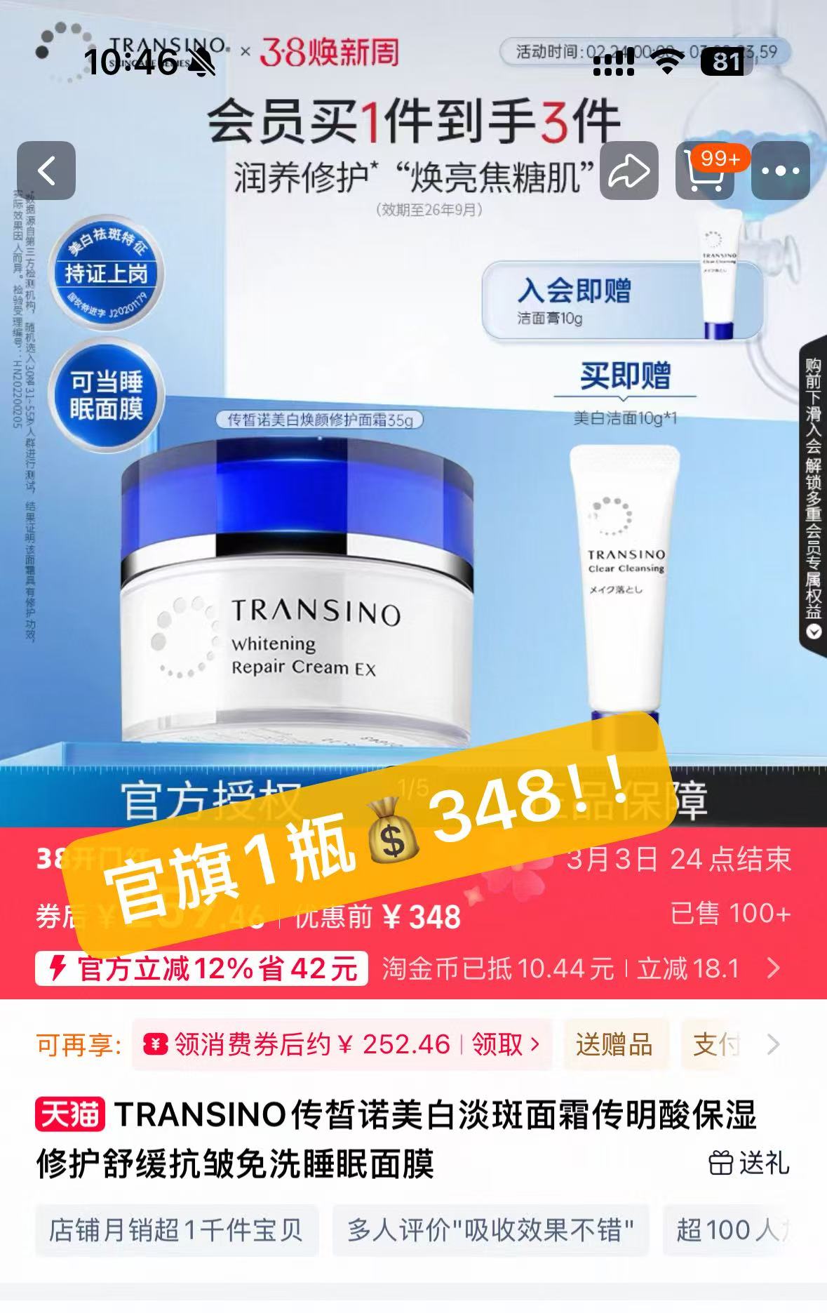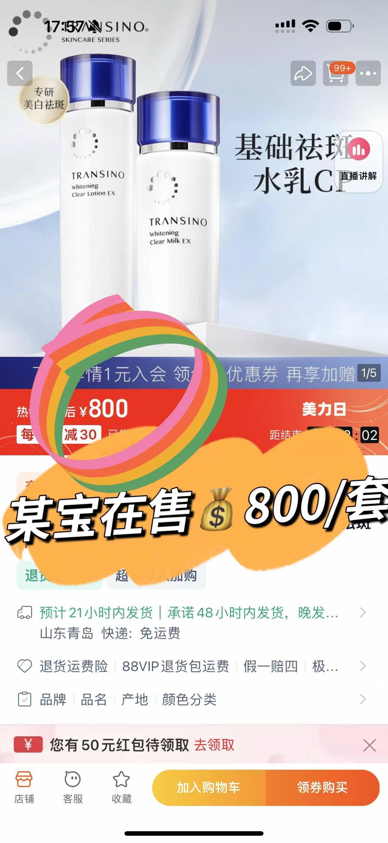 原价 800 一套‼️特价不到三折‼️传明酸鼻祖✨临期特价【TRANSINO传皙诺美白焕颜修护面霜/水乳】持美白淡斑特证👉🏻 高浓度传明酸 + 专利KPA🏆源头击破黑色素⚡斑点粉碎机