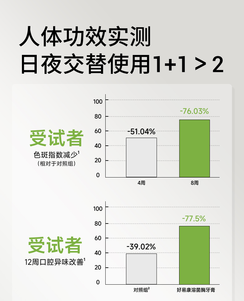 ✅【早晚交替使用1+1>2】连续8周使用,有效减少外源性色斑、去渍美白,拒绝表面假白;连续12周使用,能够有效清新口气,减轻口腔异味,改善牙菌斑堆积,减少牙石,守护口腔洁净