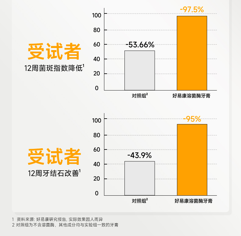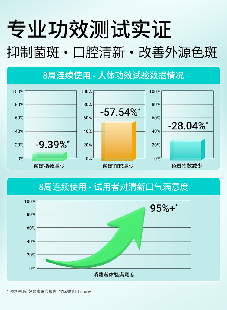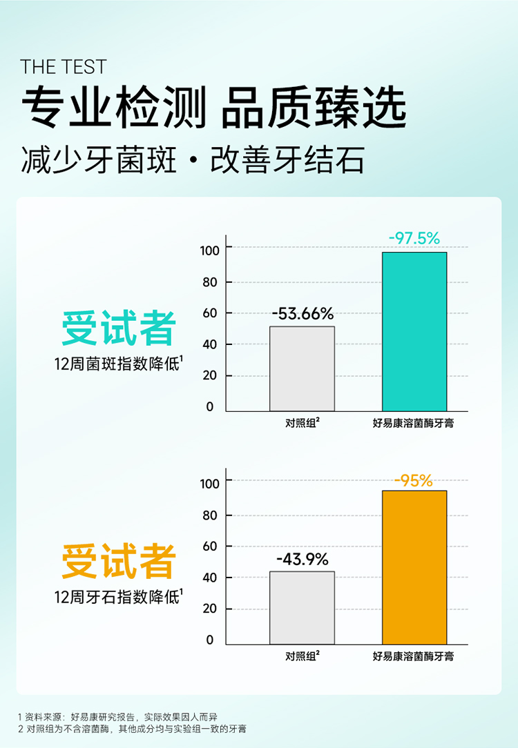 📌连续12周使用:受试者口腔异味改善了77.5%!菌斑指数降低了97.5%!牙石指数降低了95%!