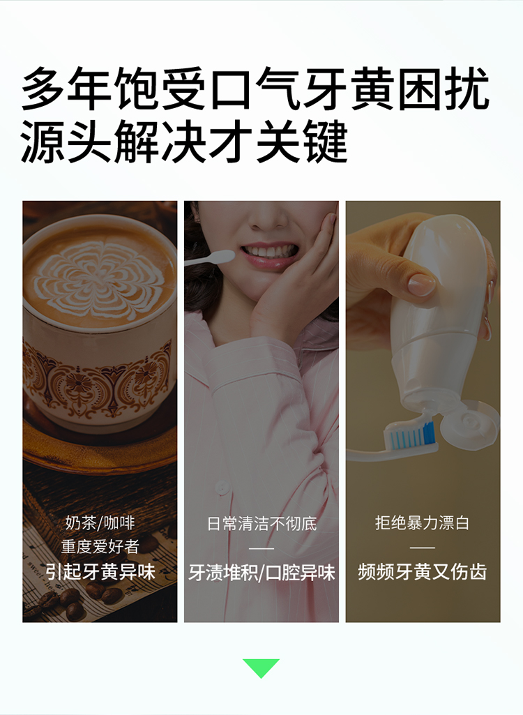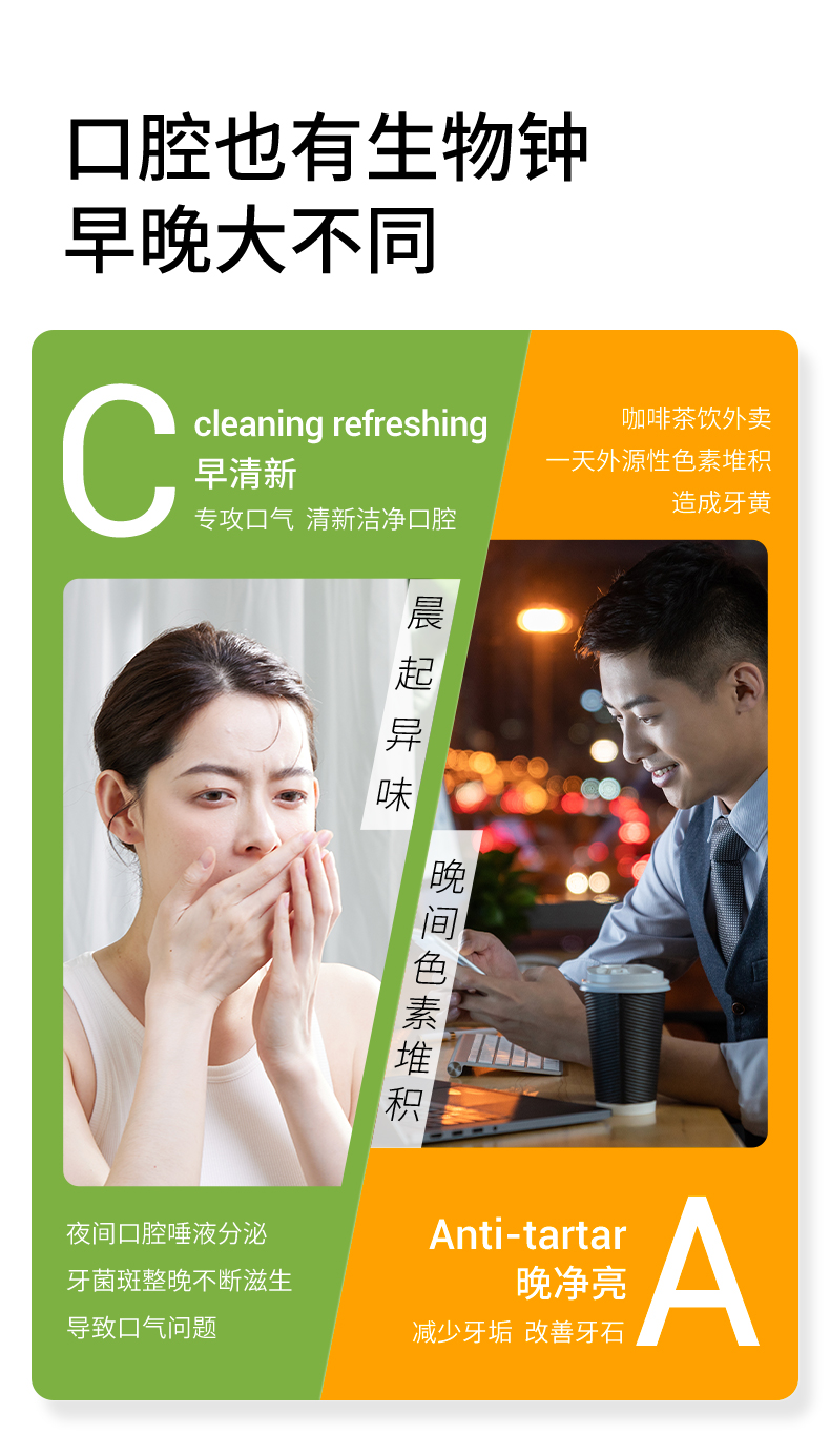 ▫️晨间伴有口气异味,晚间受牙黄、牙石困扰的精致护理人群