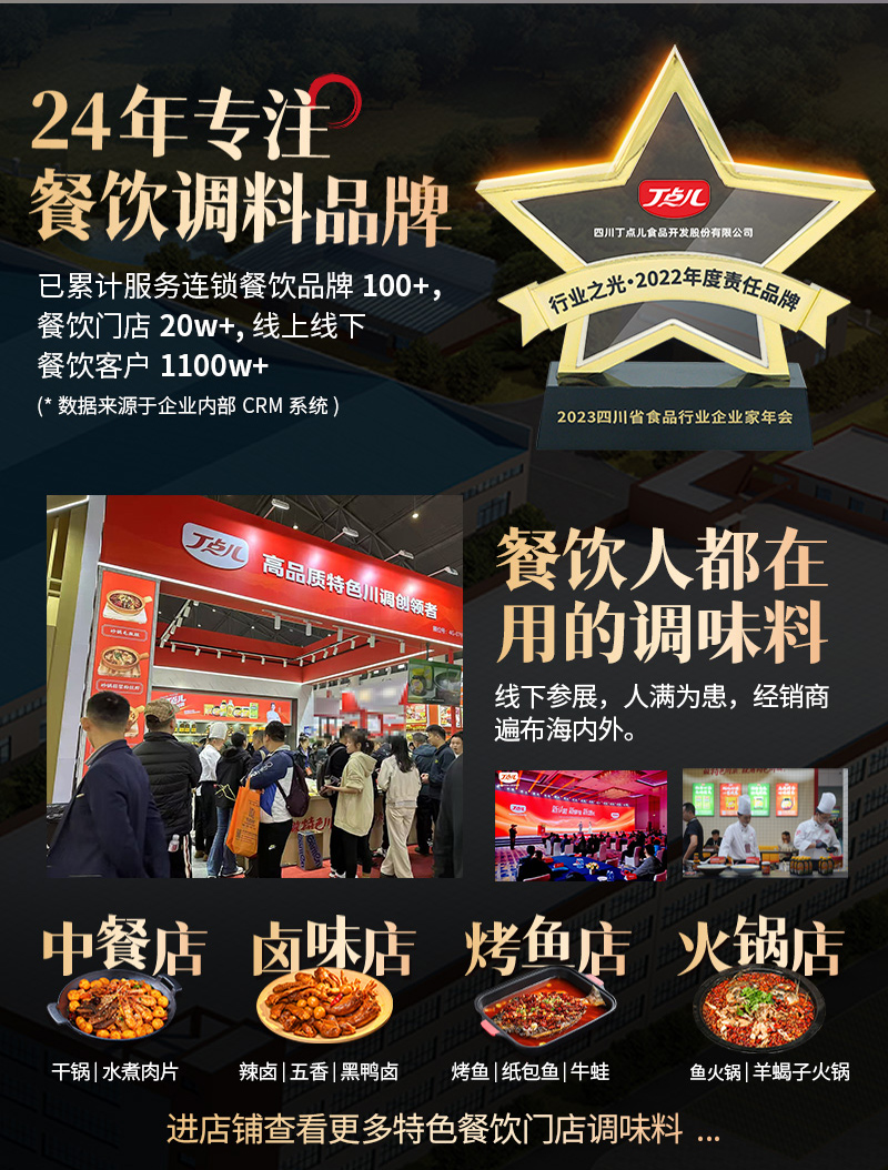 四川丁点儿食品开发股份有限公司,是集川菜调味料研发、生产、销售、服务为一体的现代化企业,专注为餐饮客户提供川菜调味解决方案。公司成立至今,服务了超百万家的餐饮门店以及连锁品牌。
