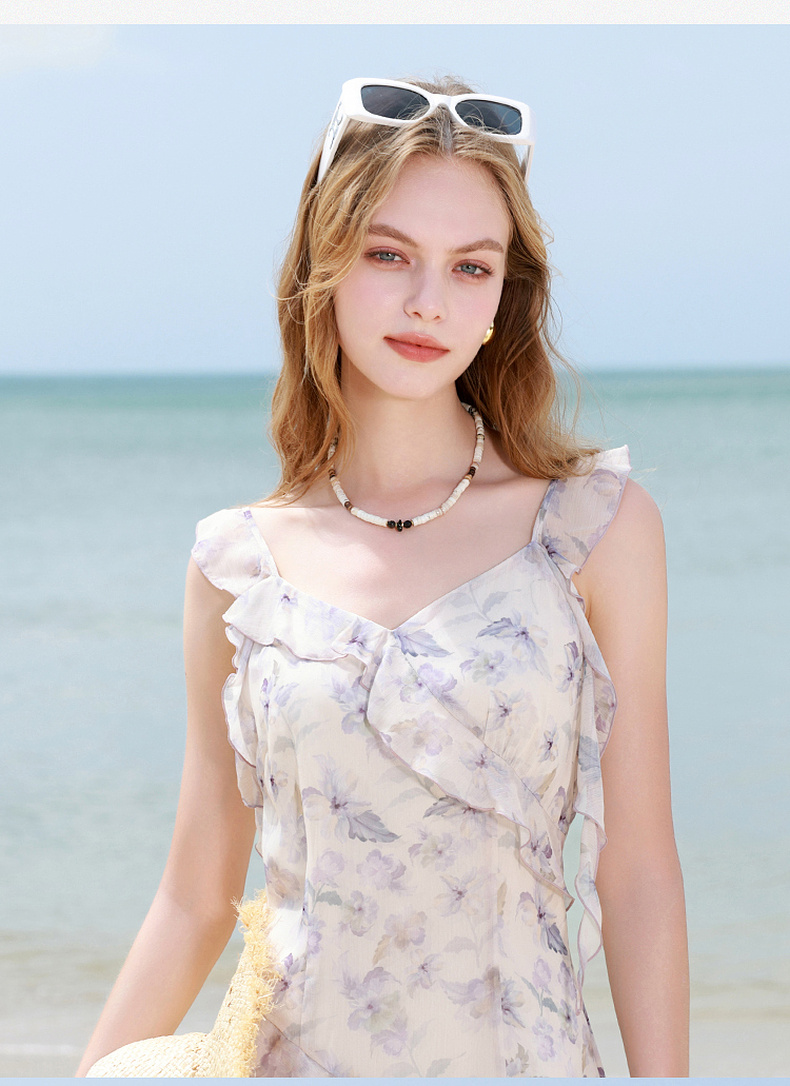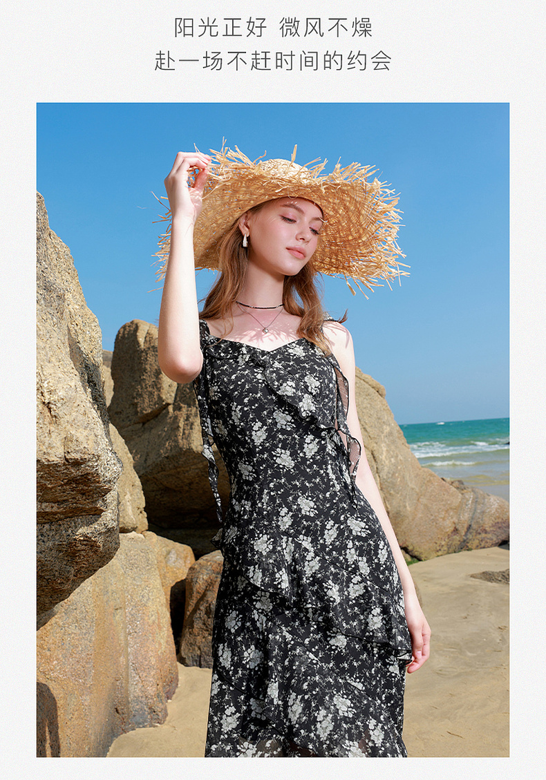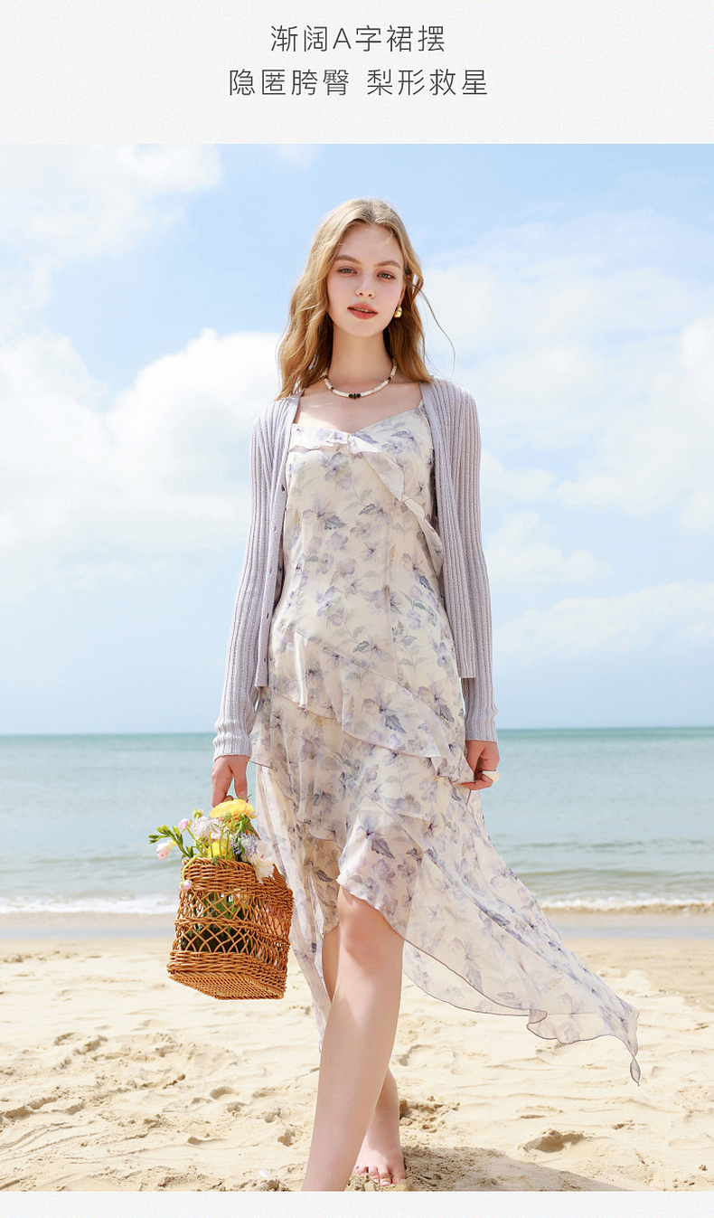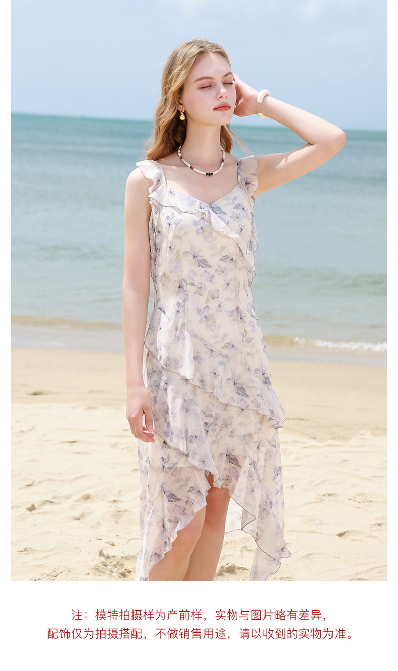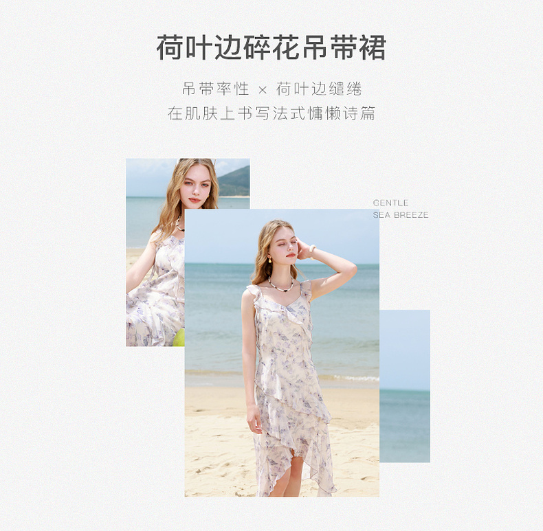 三彩2025夏季新款碎花吊带裙荷叶边飘带连衣裙A字裙度假M