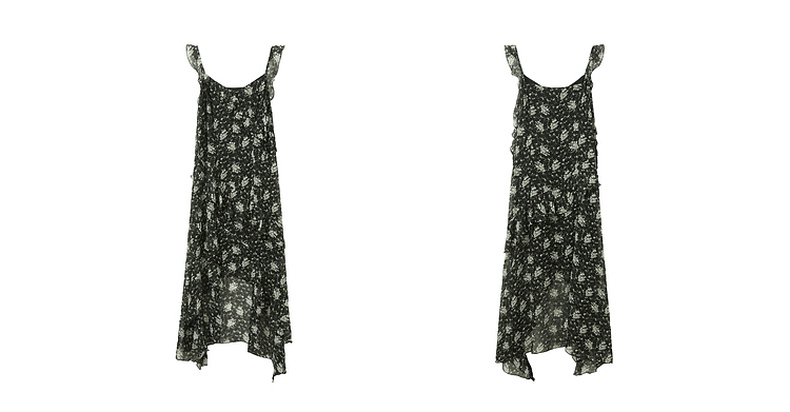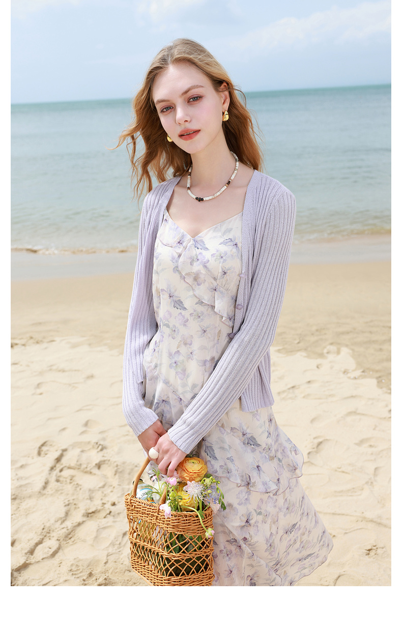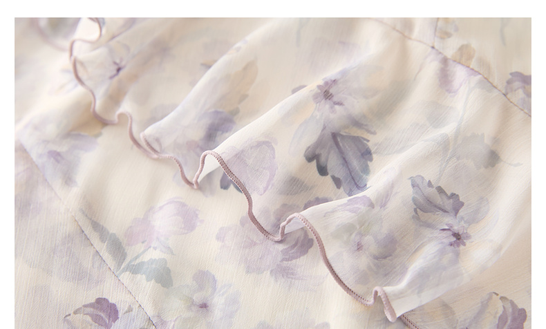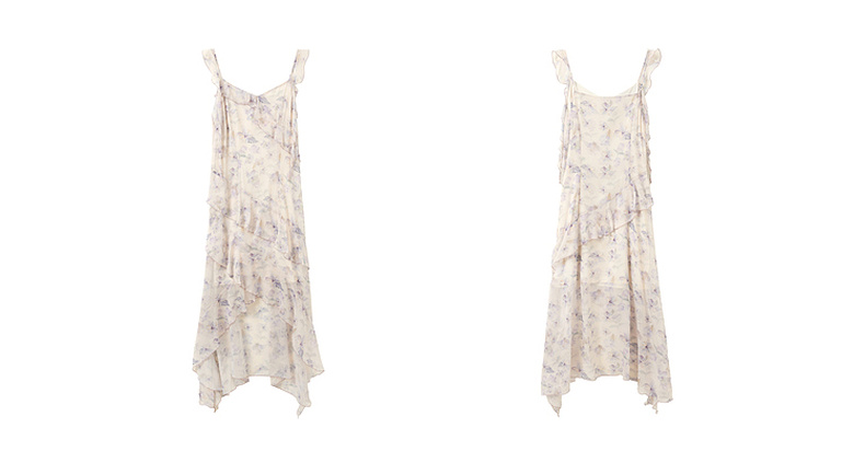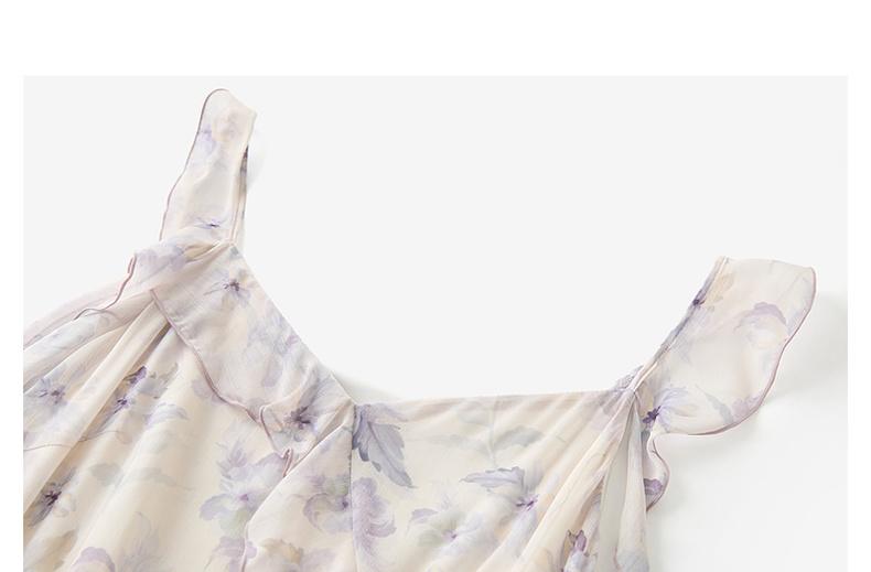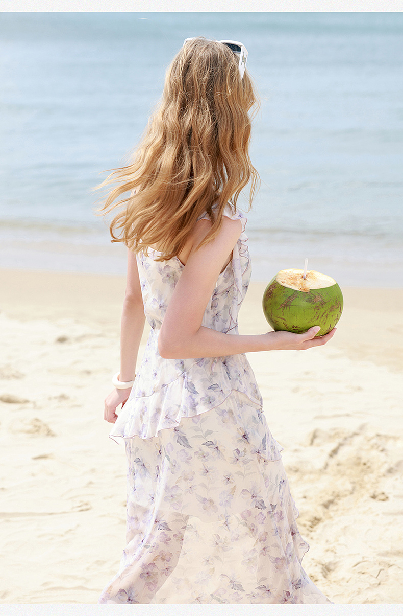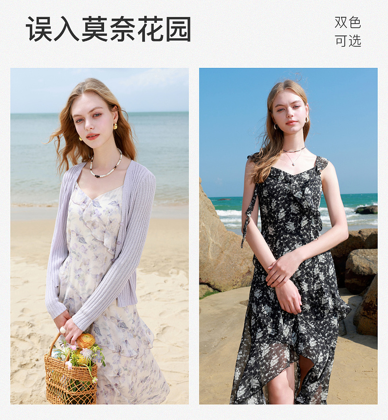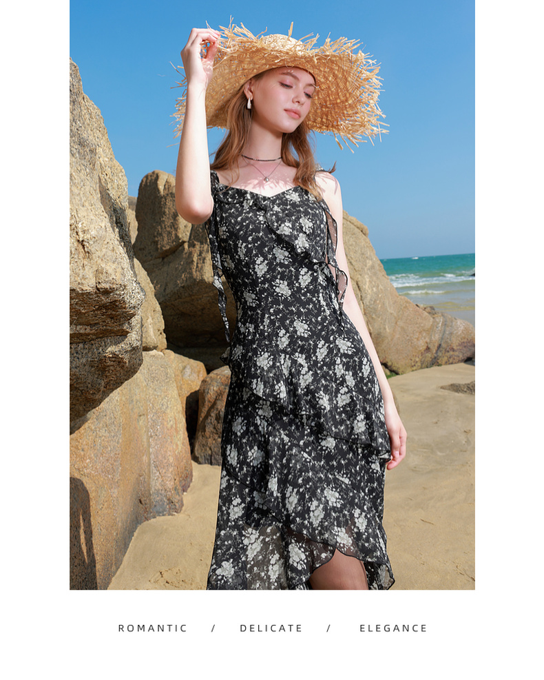 三彩2025夏季新款碎花吊带裙荷叶边飘带连衣裙A字裙度假M
