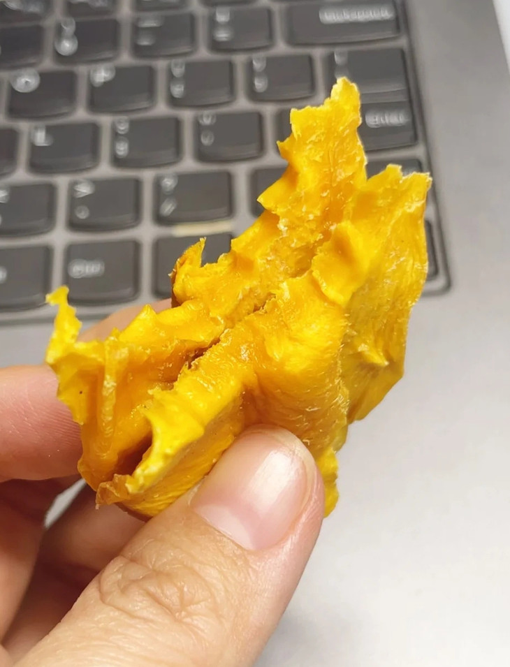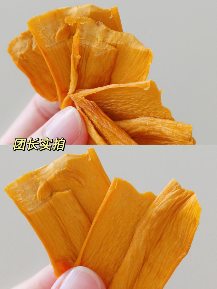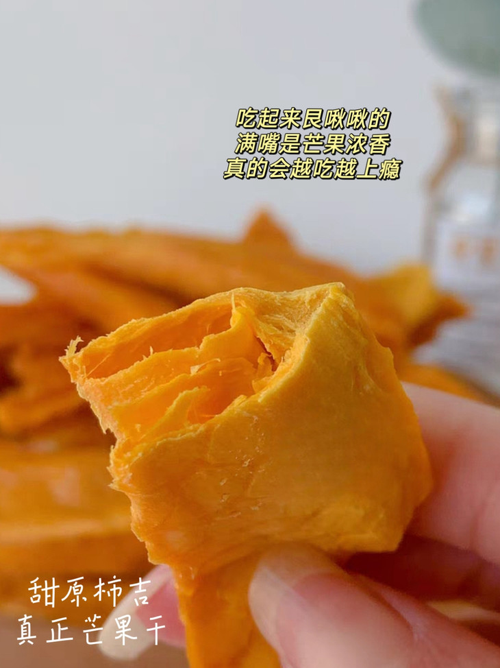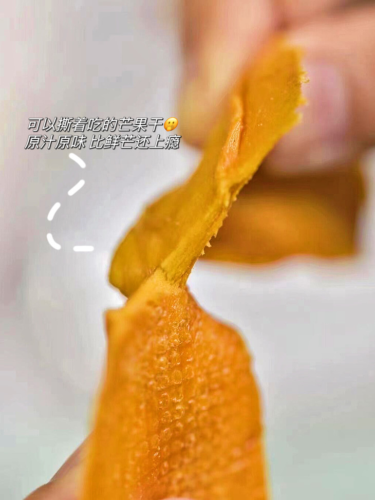 整根的芒果干真是果干界的新宠!!!👑 撕开包装那刻就被芒果香气给香迷糊了! 橙黄透亮的果肉带着自然褶皱 zui爱的是它的嚼劲🥭 不会硬到费牙 也不会软趴趴没口感!! 每一口都能嚼到果肉纤维的拉扯感🥺 糯叽叽中带着点Q弹 越嚼芒果香越浓~