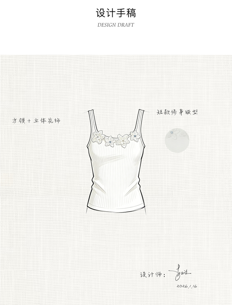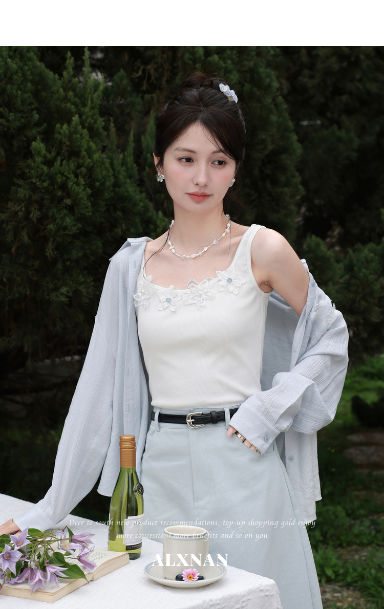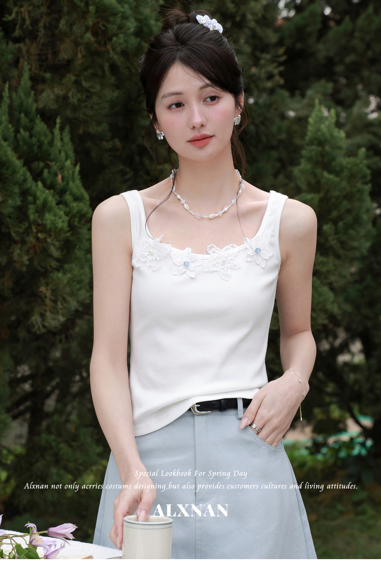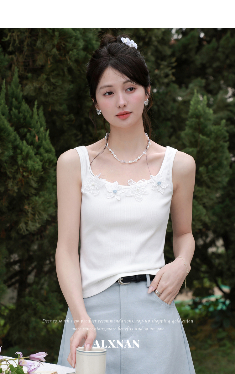 鹿向南「清冷茉莉」白色无袖吊带背心内搭女夏季新款修身短款上衣
