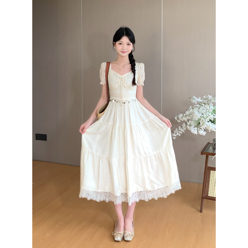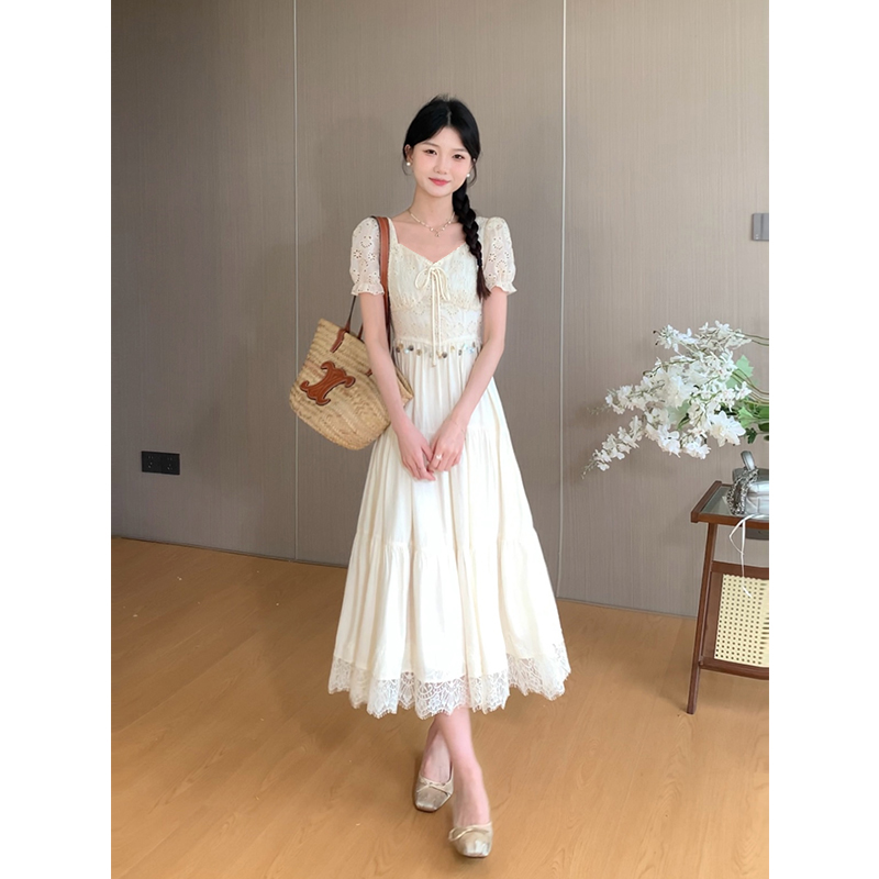 鹿向南「普罗旺斯夏日」法式气质蕾丝花边甜美收腰连衣裙女夏短袖