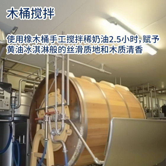 【木桶搅拌】 工人需用橡木桶手工搅拌稀奶油整整2.5小时! 就像给奶油做马杀鸡 让它变得比冰淇淋还要丝滑 并偷偷藏进一丝若有似无的木质清香