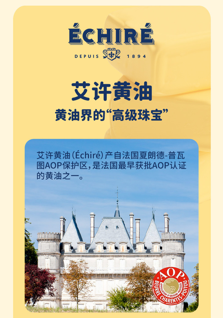 🧡关于法国艾许黄油(AOP认证) 它可不是随便哪个超市货架上的普通黄油 艾许黄油(Échiré)产自法国夏朗德-普瓦图AOP保护区,是法国最早获批AOP认证的黄油之一。
