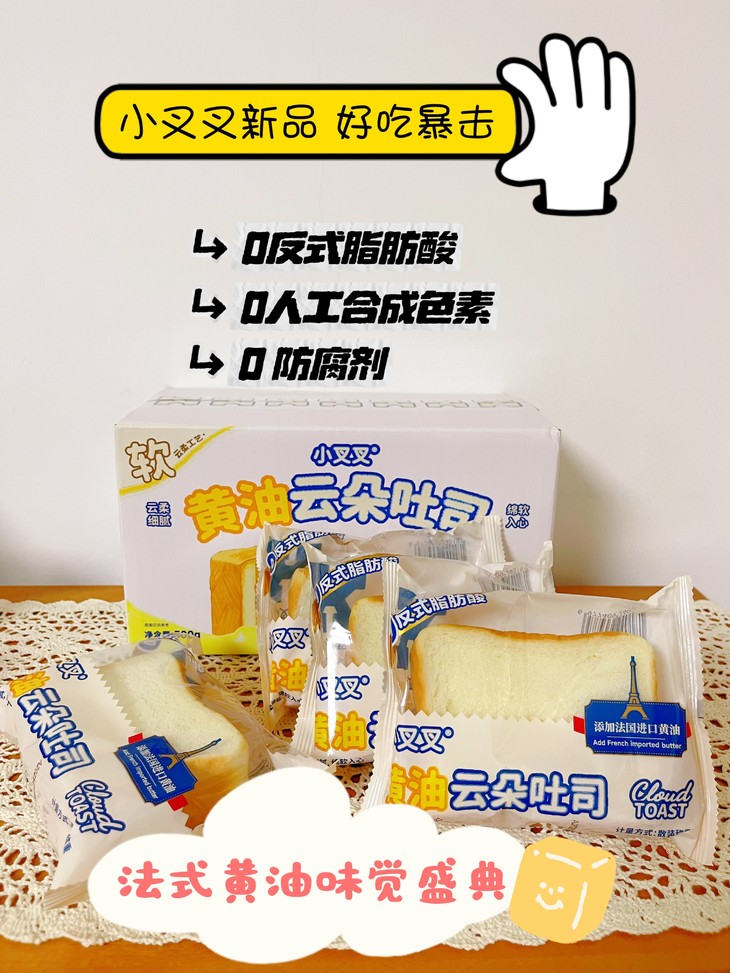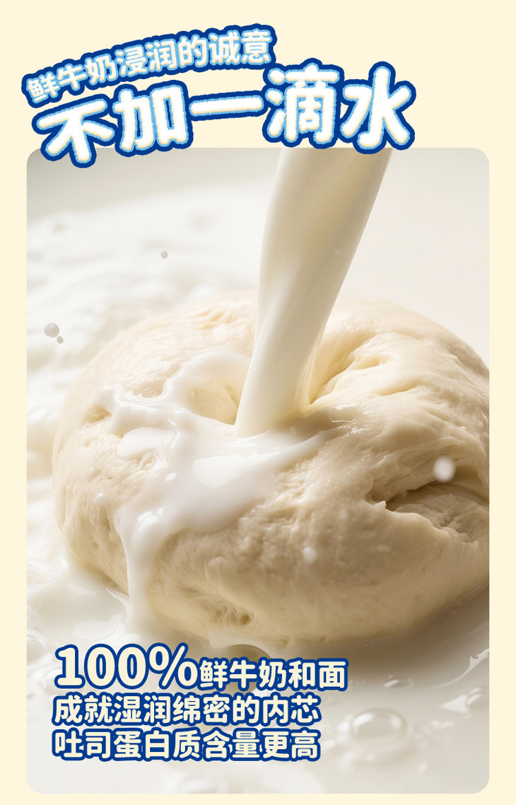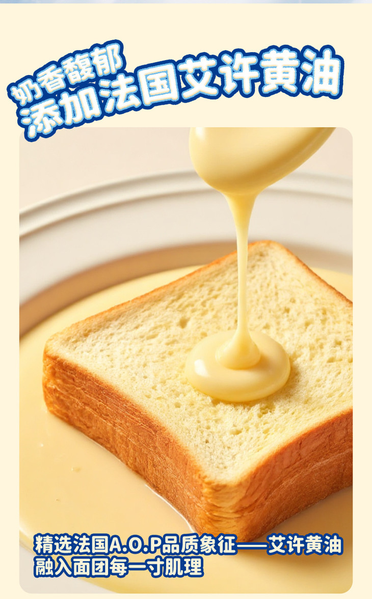 💥 历经1000多个日夜才有的终极秘诀是什么? ✔️ 法国艾许黄油(AOP认证) ✔️中粮高端精制小麦粉(蛋白质含量≥12%) ✔️ 不加一滴水,100%新鲜牛奶和面 ✔️中种法72小时低温发酵,锁住云端柔软 ✔️ 0反式脂肪酸 | 0防腐剂 | 低GI配方