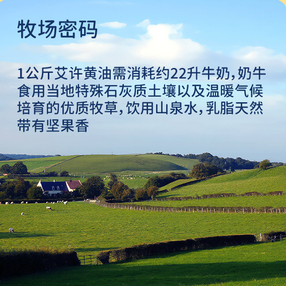 【牧场密码】 1公斤艾许黄油需消耗约22升牛奶 这里的奶牛过着堪比五星级酒店的生活: 吃着当地特殊石灰质土壤及温暖气候孕育的优质牧草 喝着山泉水,产出的奶自带坚果香buff!