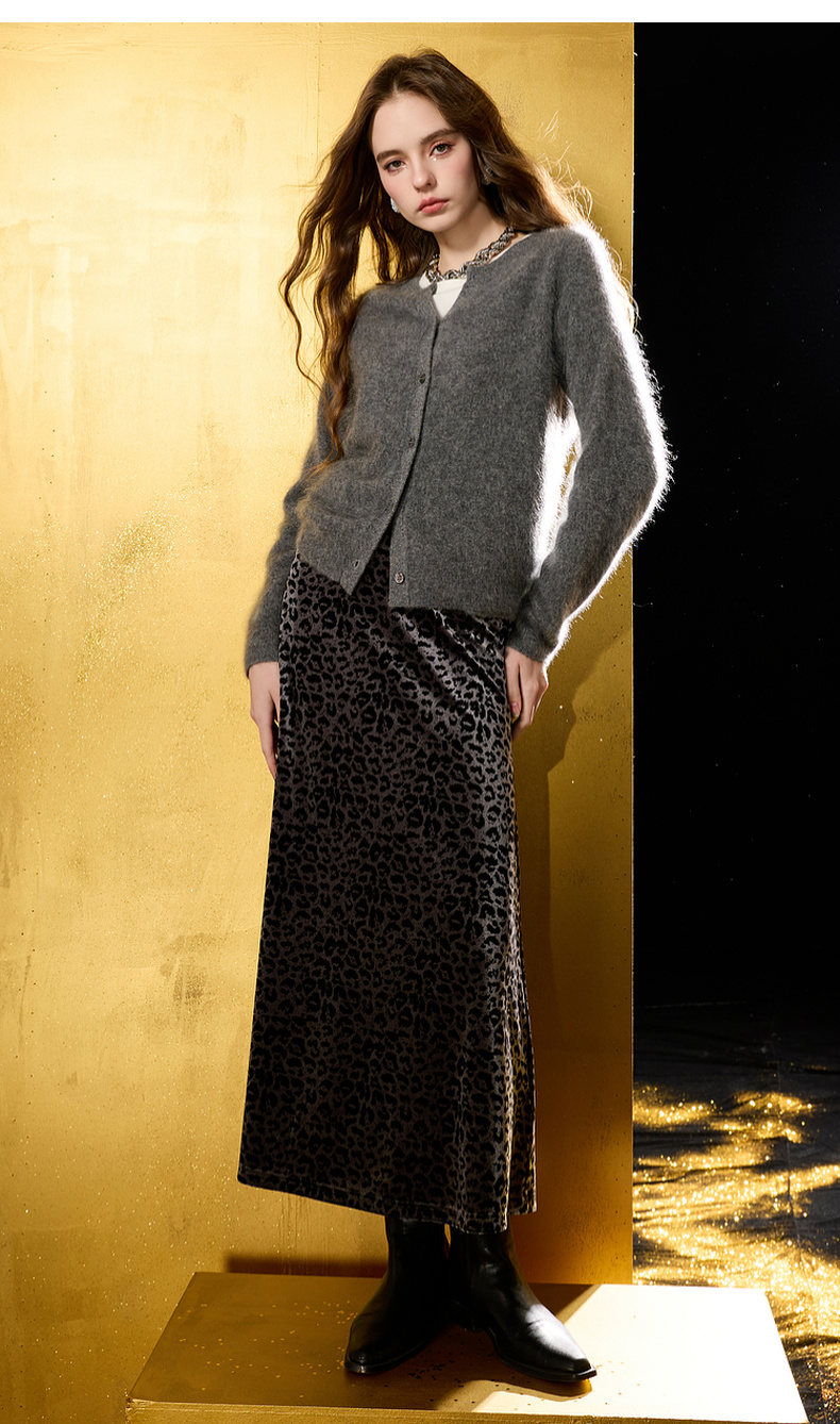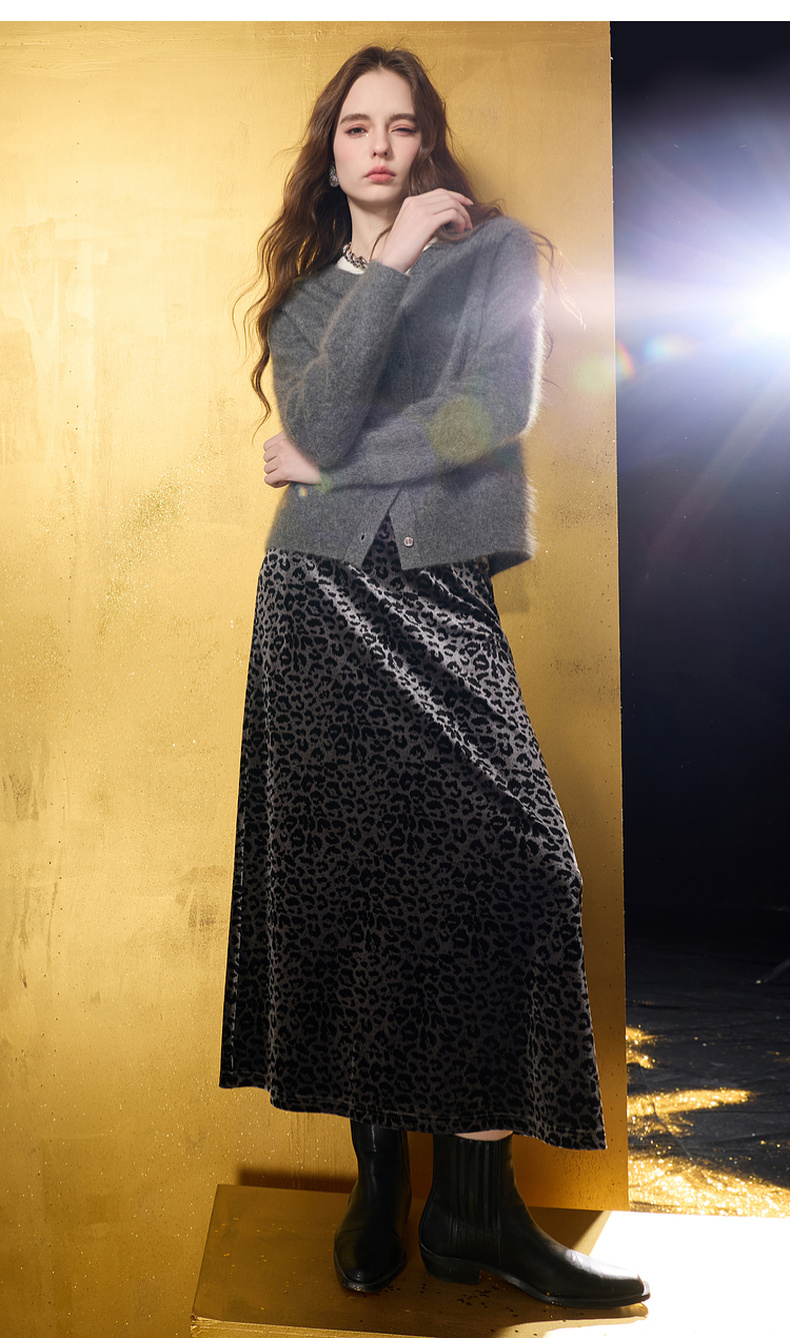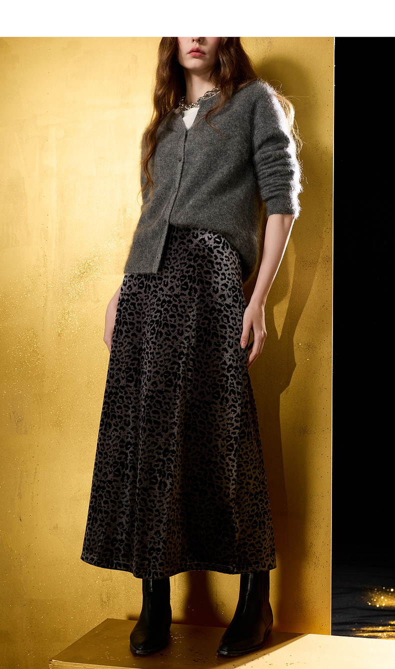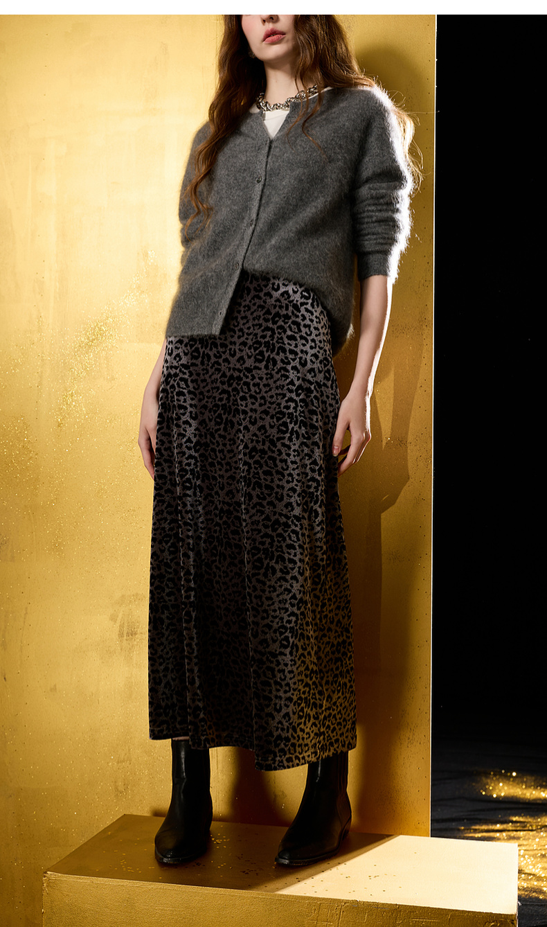 三彩2025冬季新款豹纹半身裙松紧腰A字裙长裙摩登M