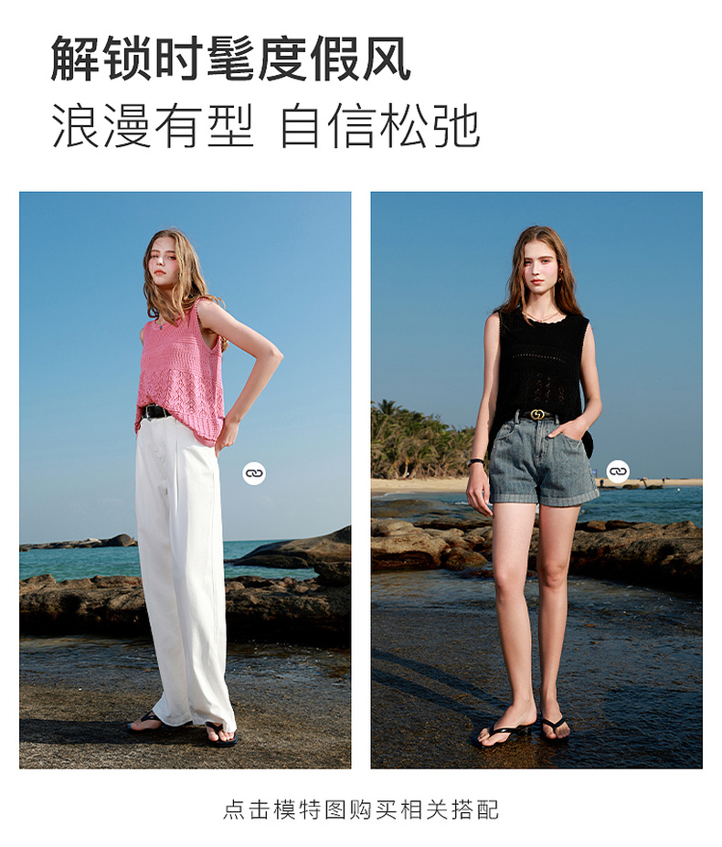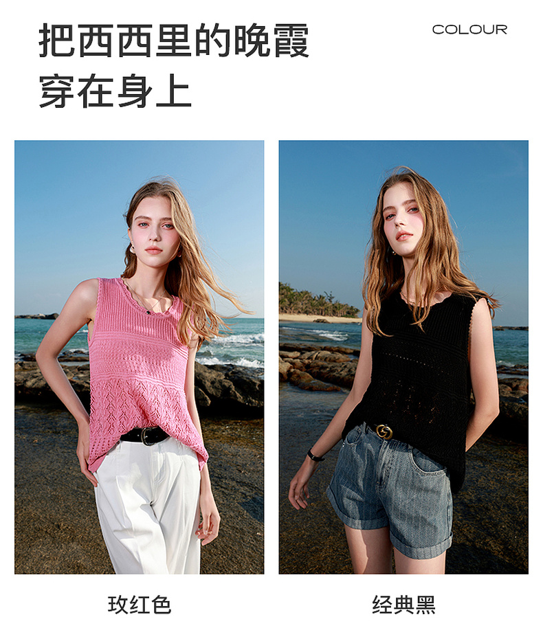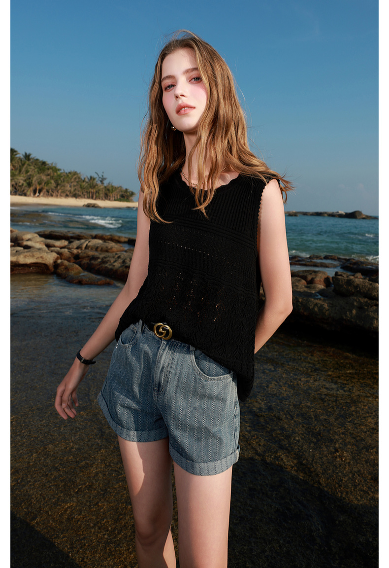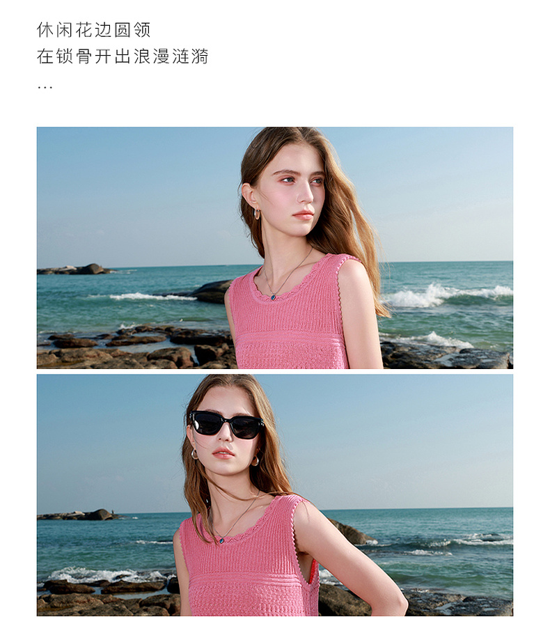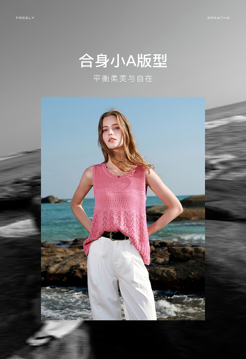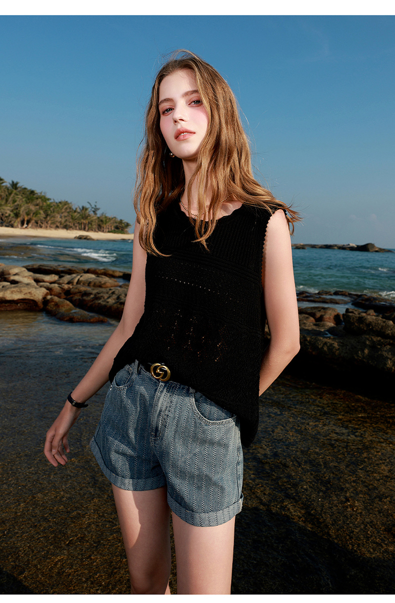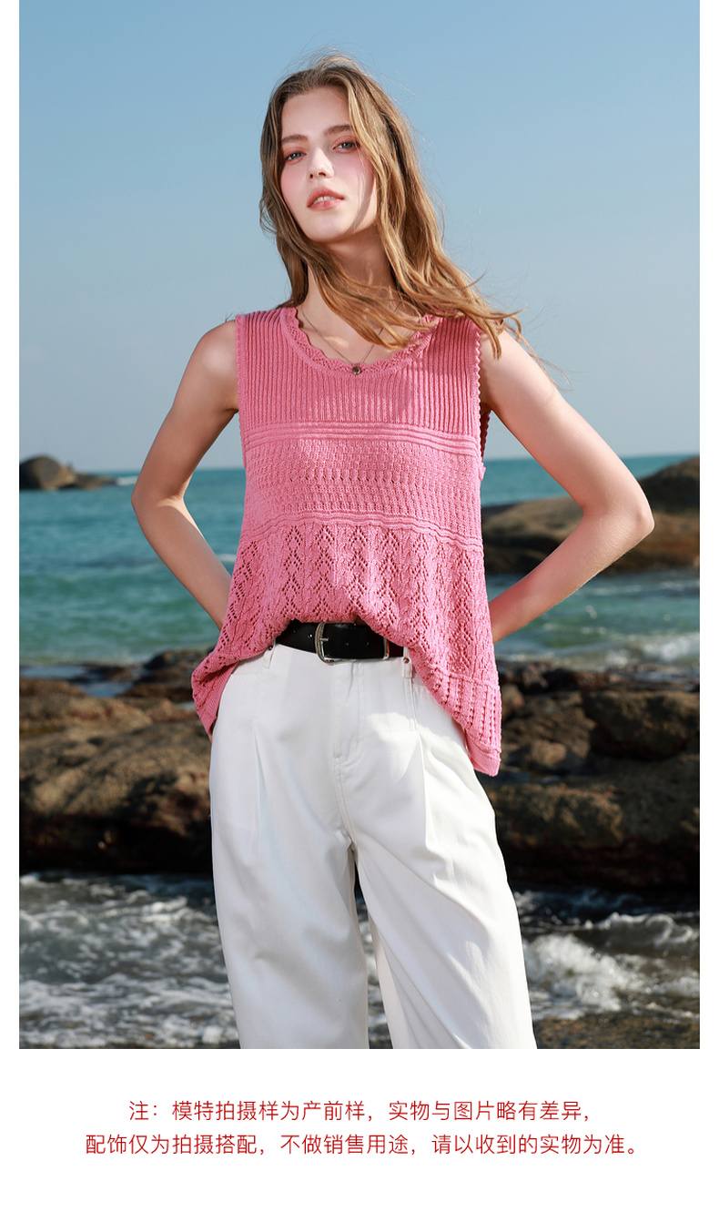 三彩2025春季新款镂空钩花针织衫无袖圆领度假风套头衫背心M