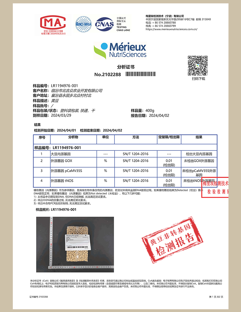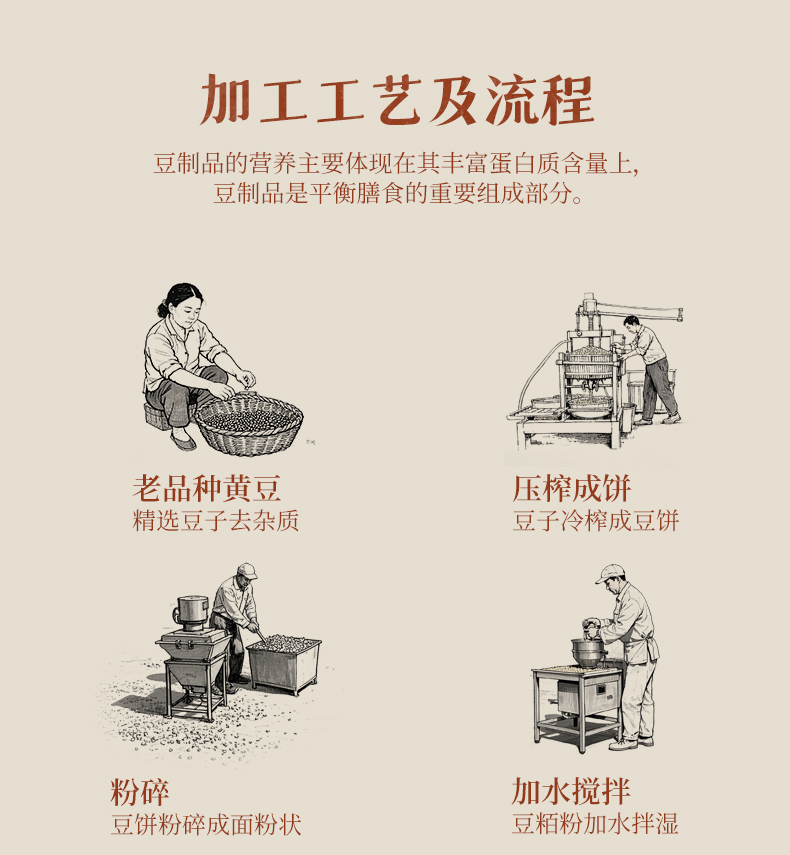 【安全水准】自2012年孝和林农场创建,生态种植至今;种植全程不使用任何化学投入品,包括化肥、农药、除草剂,以及人工合成激素类物质;使用发酵腐熟的羊粪堆肥辅以自制环保酵素;园区周边种植25米宽的香椿树隔离带,营建良好的有自洽能力的生态小环境,病虫都有但皆不成害;人工控草,地下深井水灌溉,黄豆自然成熟收割,物理方式加工,不使用任何添加成分。