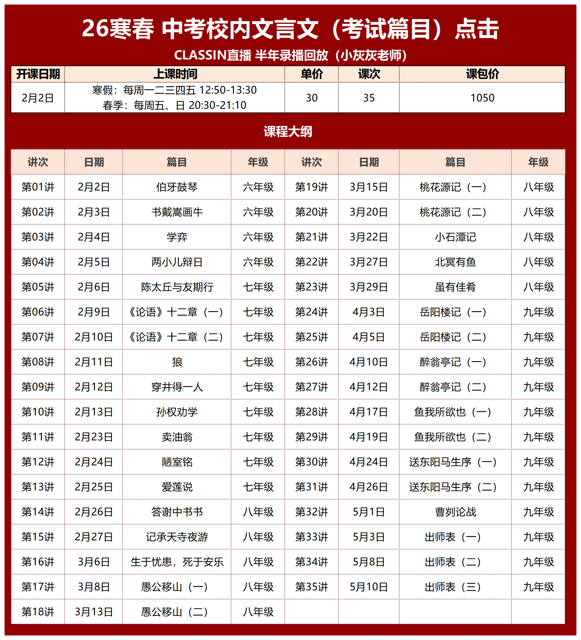 一共35讲 30元/40分钟/讲,课包1050