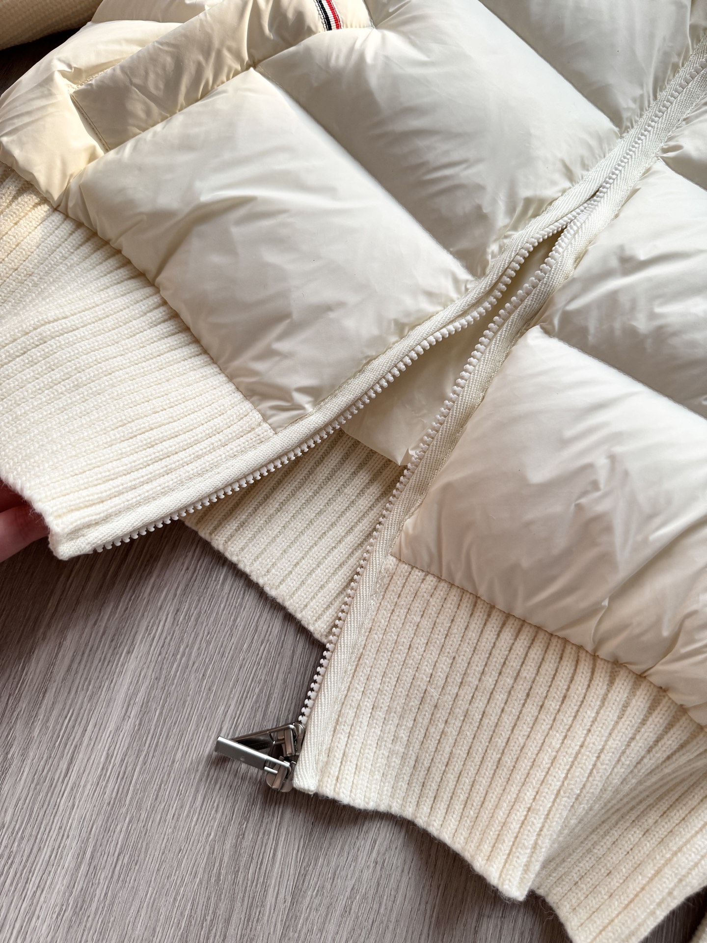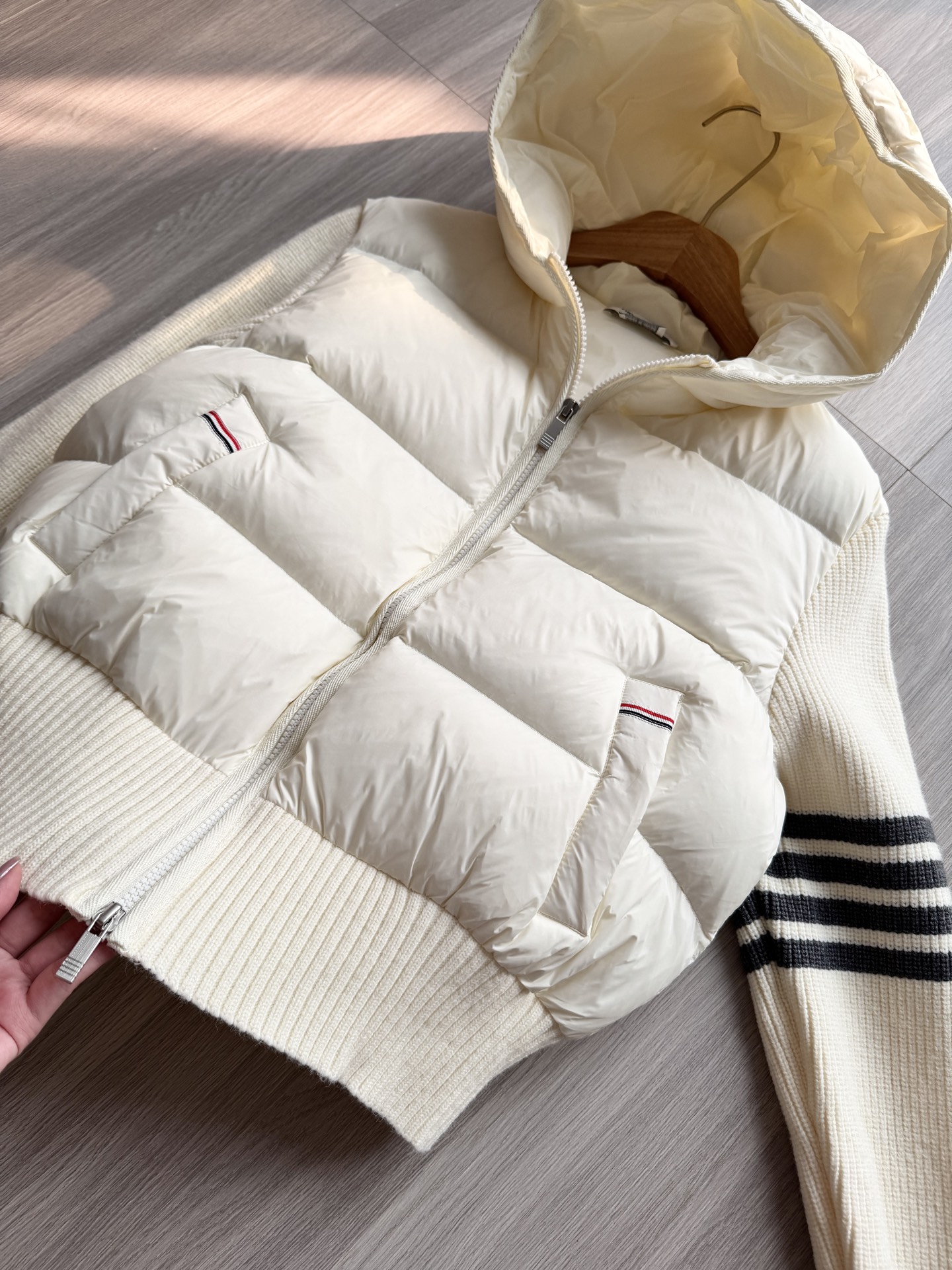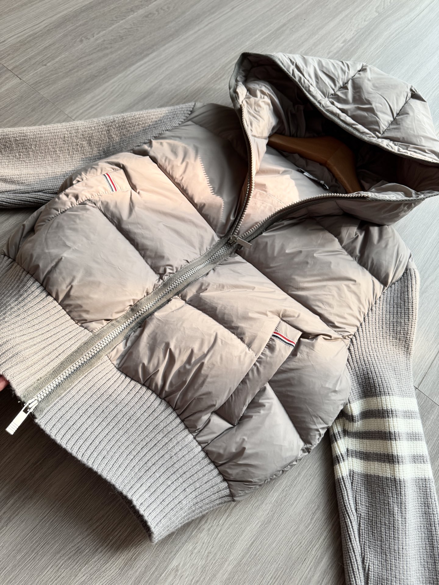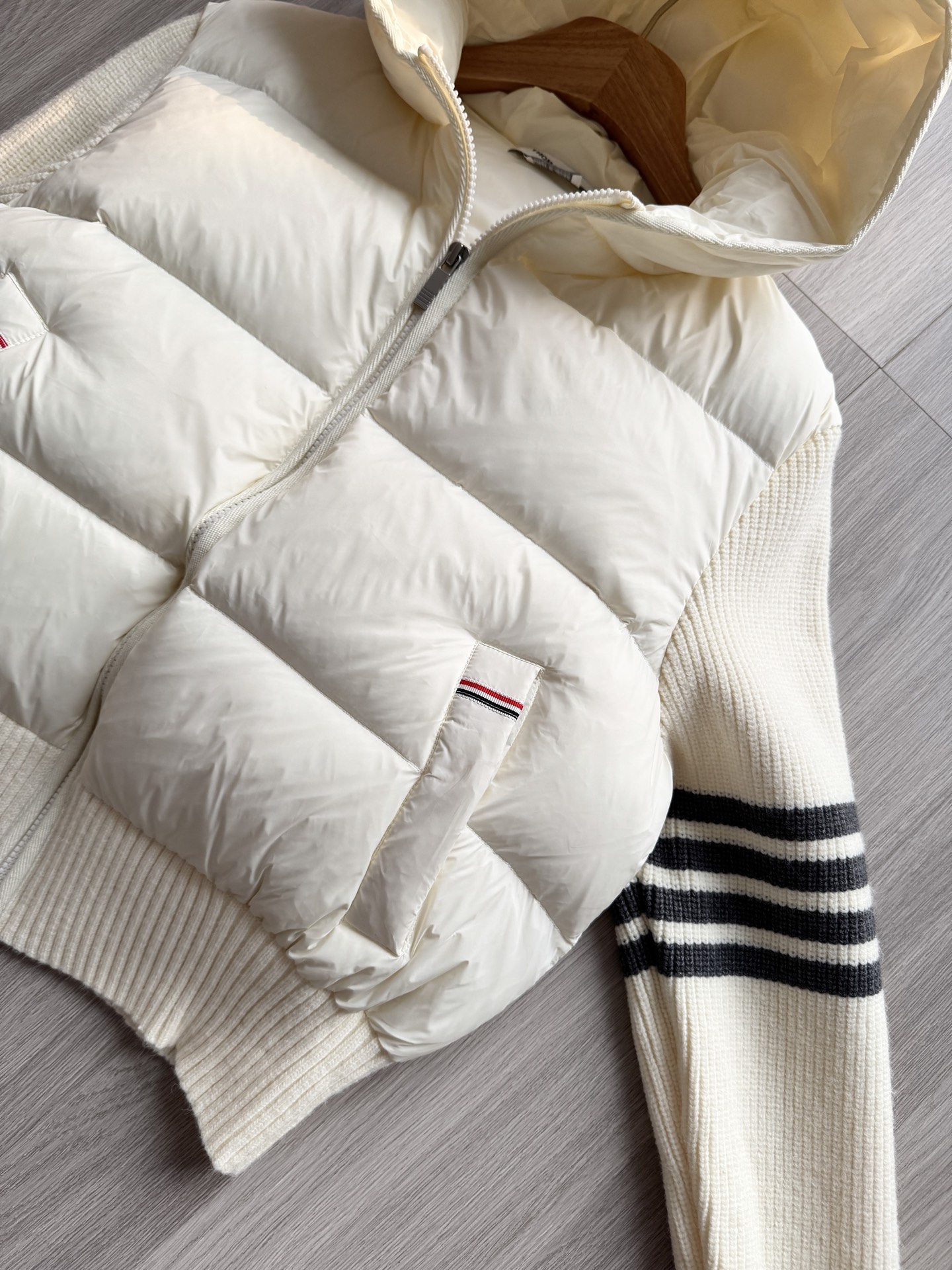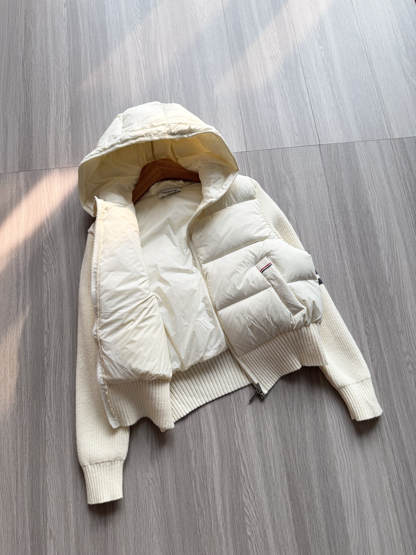 TB 25Ss秋冬最新款羊毛拼接羽绒服外套 国标进口90白鸭绒填充,轻盈舒适自带发热保暖功能 拼接美利奴羊毛舒适厚实的手感 !气质连帽双拉链设计 ,极简休闲收腰版型 ,不挑人上身超显瘦 ,休闲百搭神器 !意式优雅高级感随性又大气