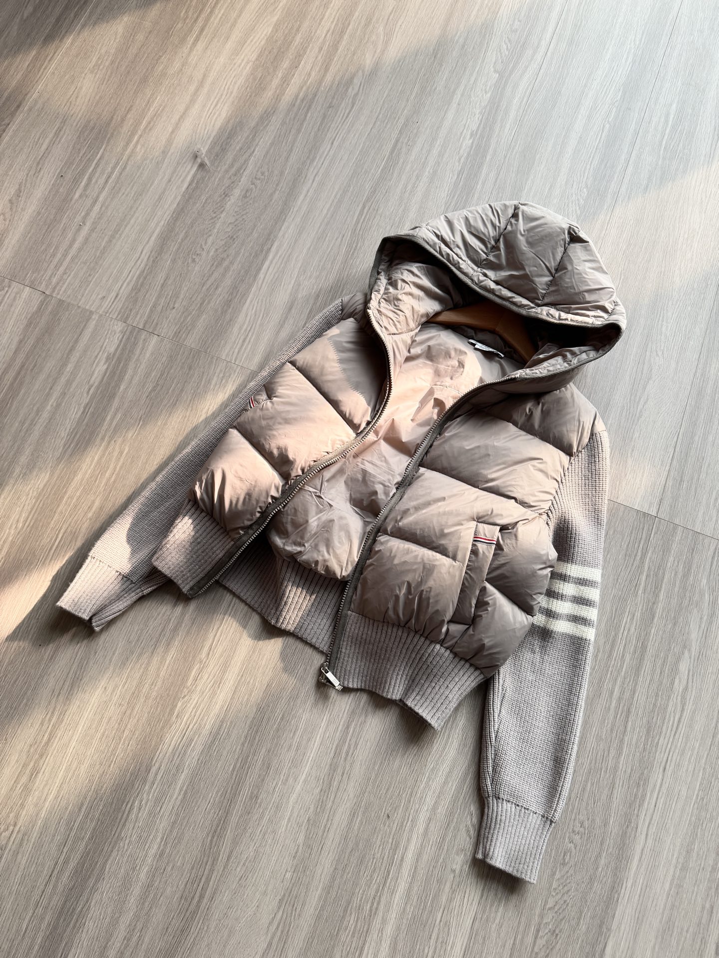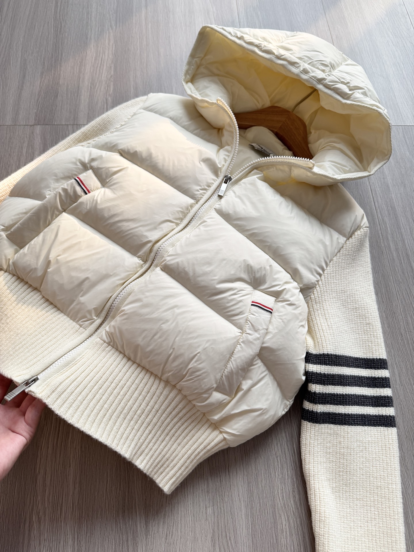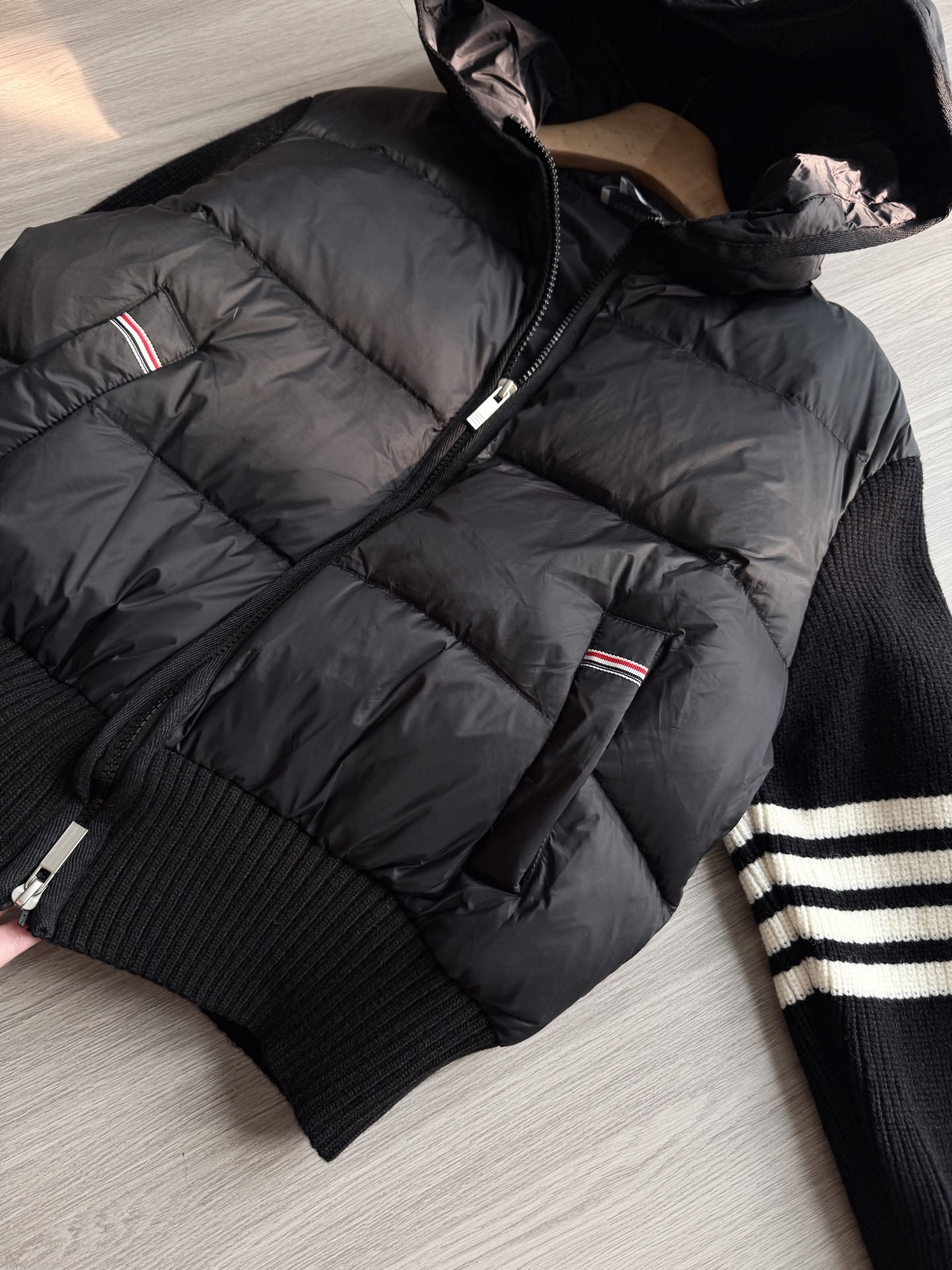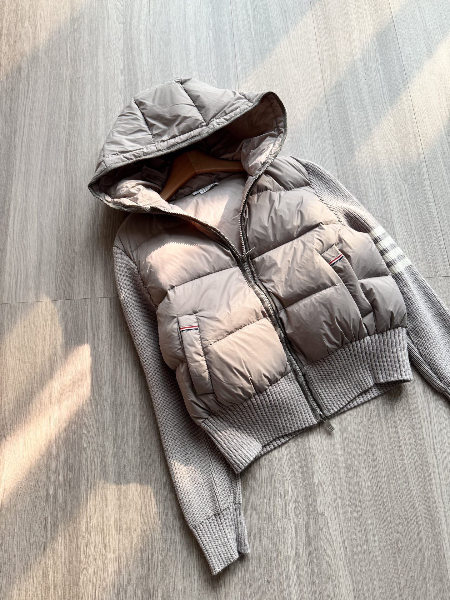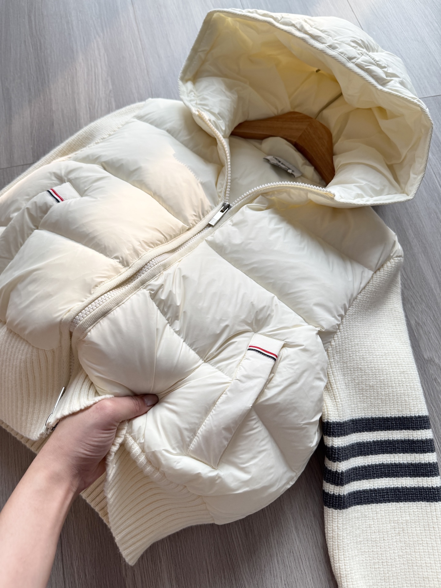 TB 25Ss秋冬最新款羊毛拼接羽绒服外套 国标进口90白鸭绒填充,轻盈舒适自带发热保暖功能 拼接美利奴羊毛舒适厚实的手感 !气质连帽双拉链设计 ,极简休闲收腰版型 ,不挑人上身超显瘦 ,休闲百搭神器 !意式优雅高级感随性又大气